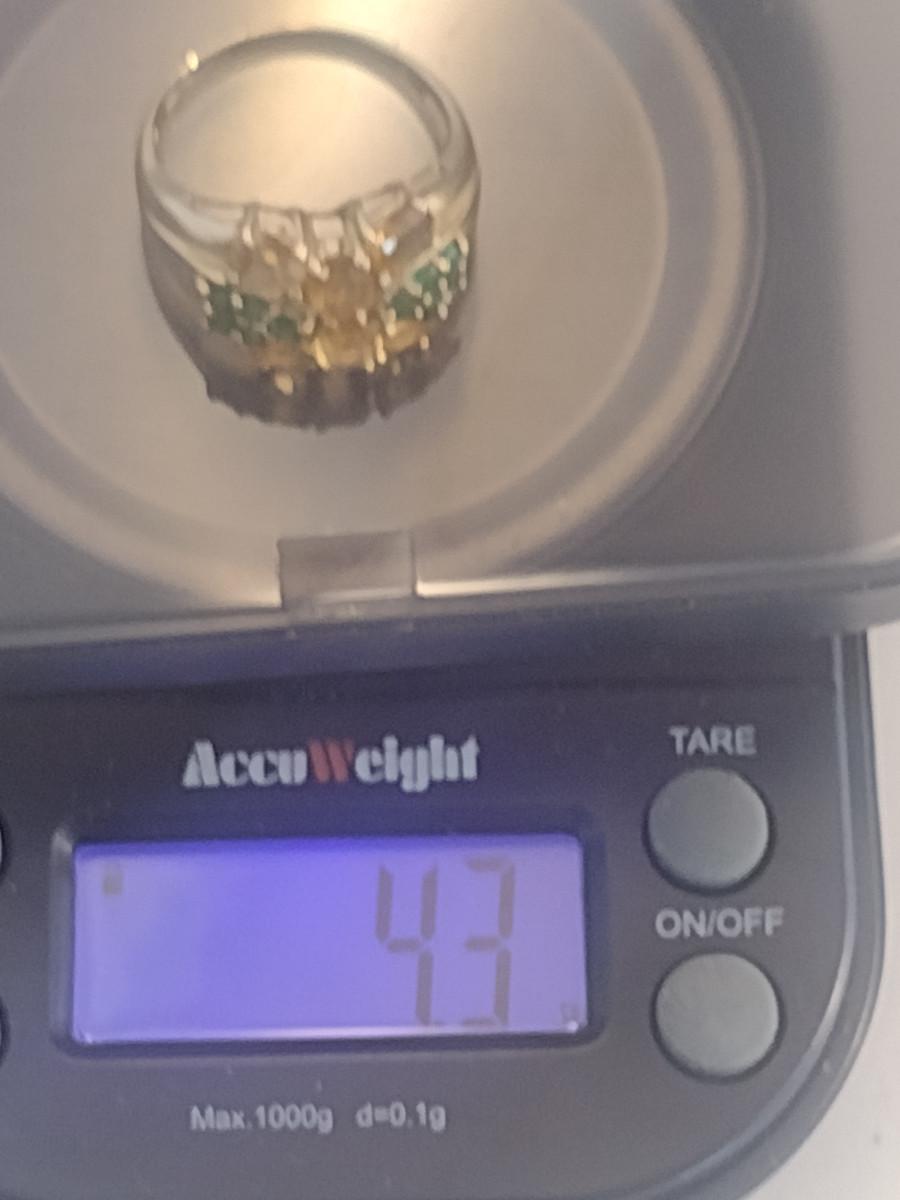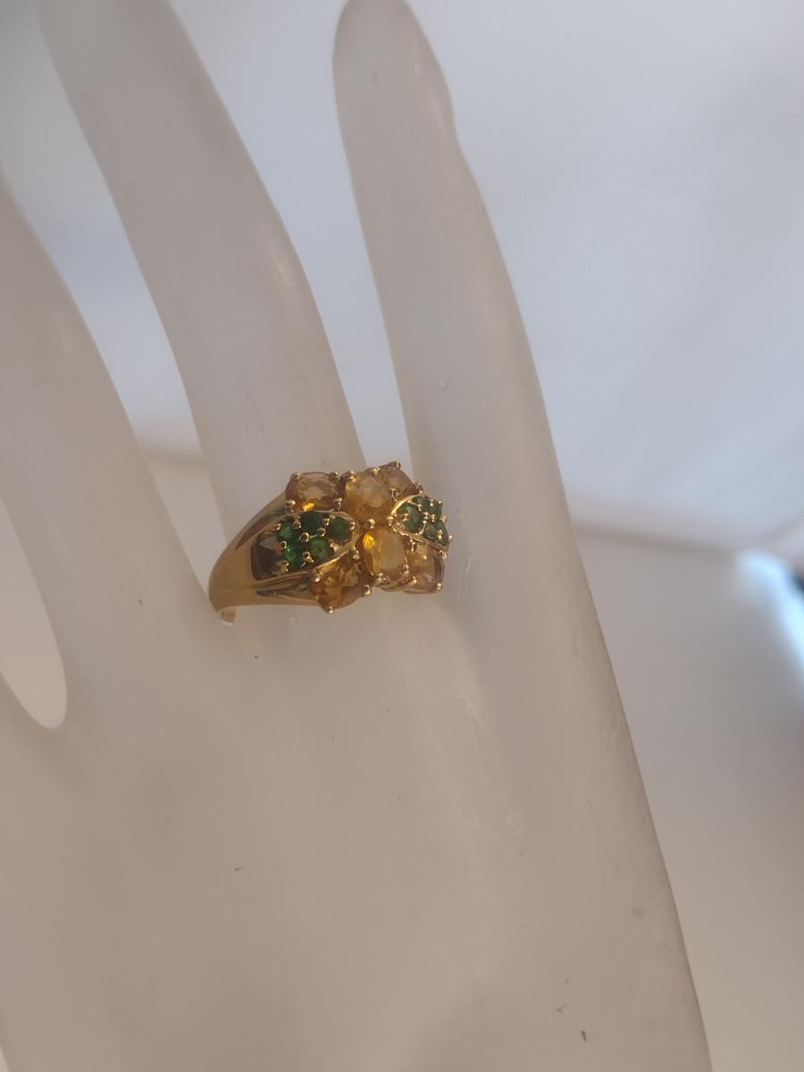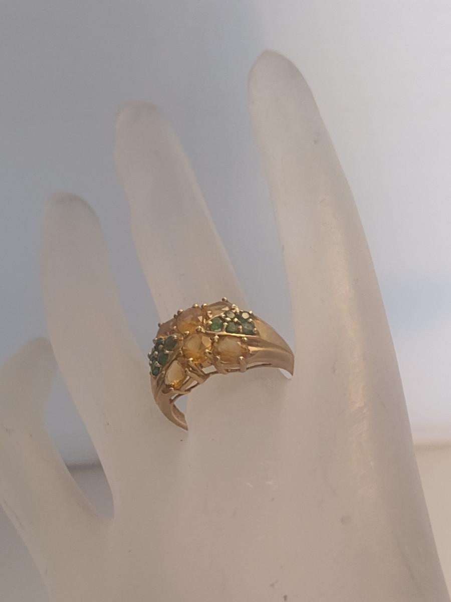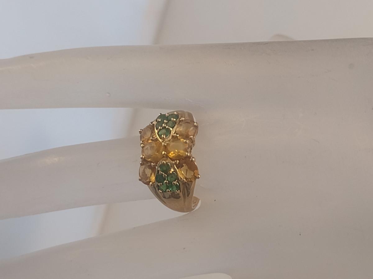 10 Karat Yellow Gold and Gemstone Ring- Size 9- Approx Weight 4.3 Grams (#24). Possibly gold citrine and emerald gemstones.