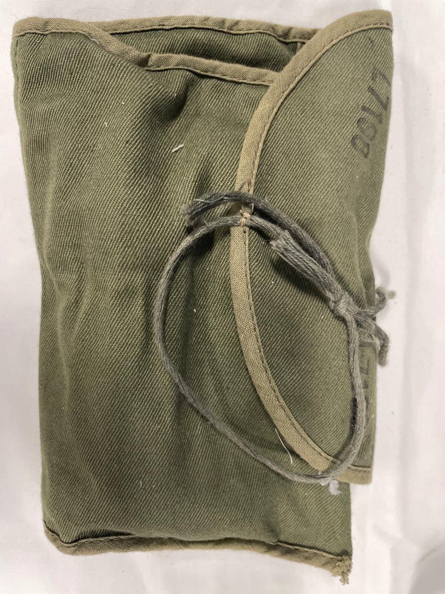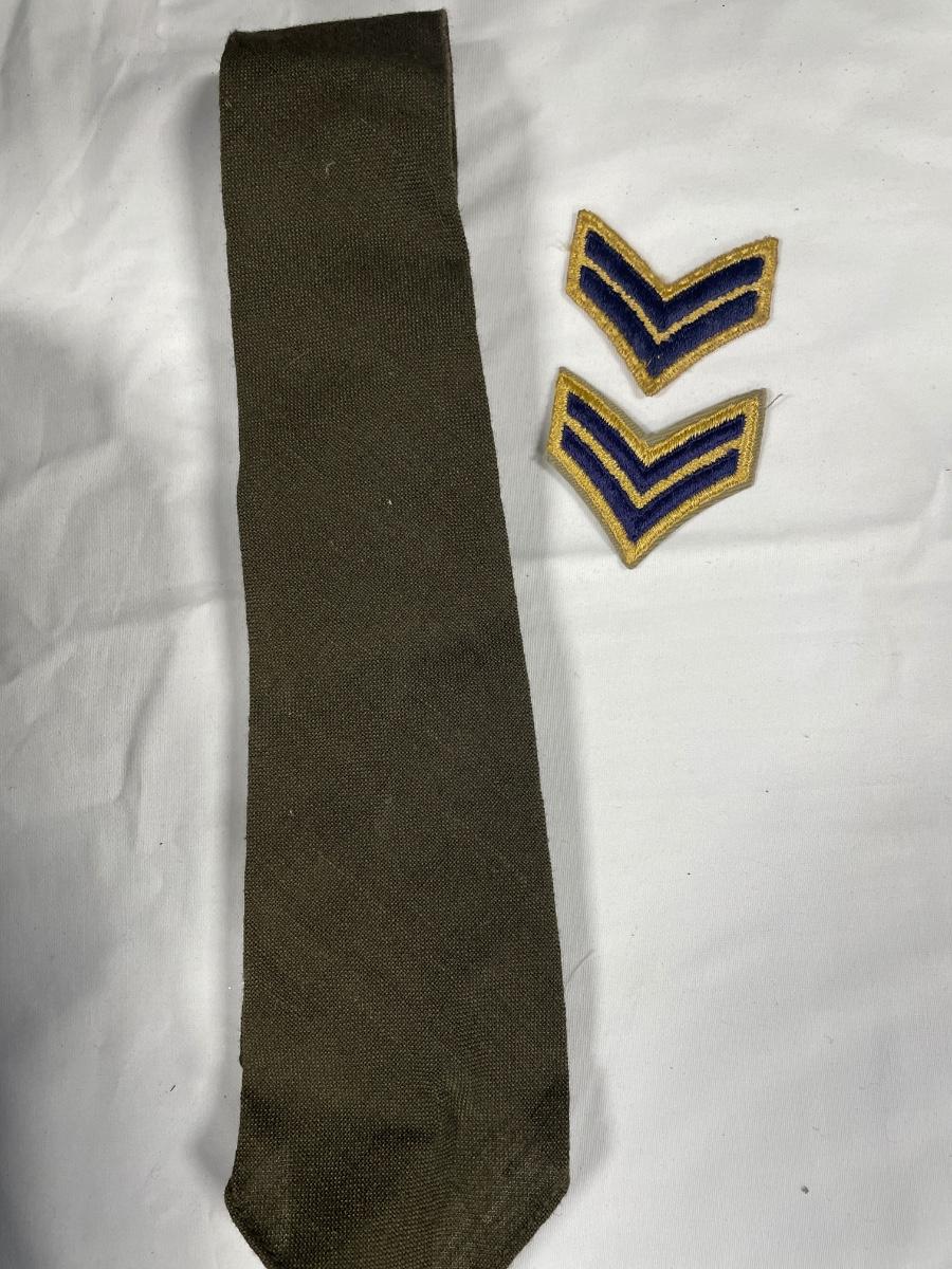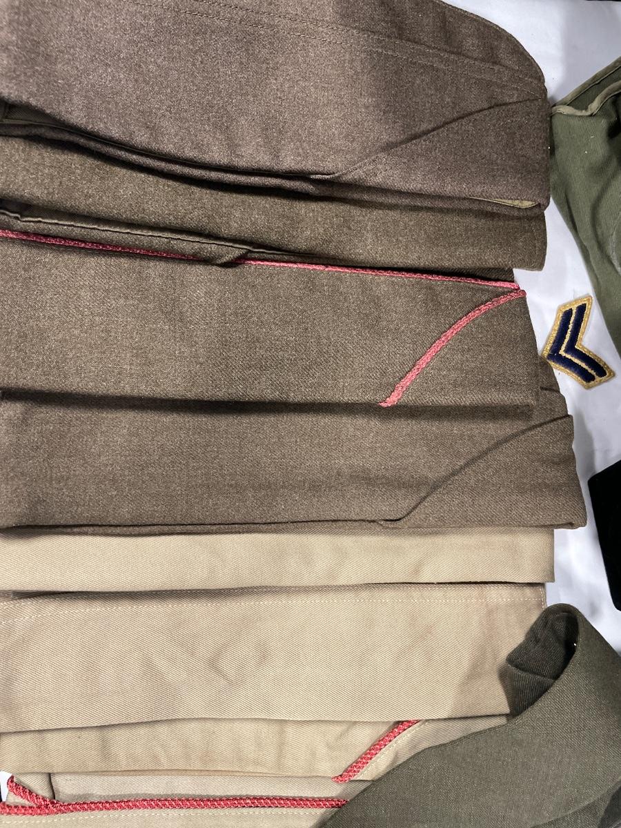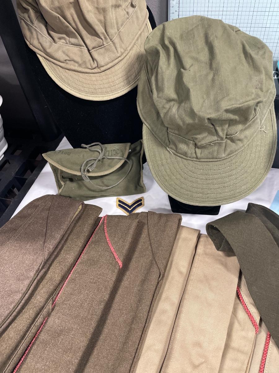 Multiple hats from various uniforms, patch, sewing kit bag and tie