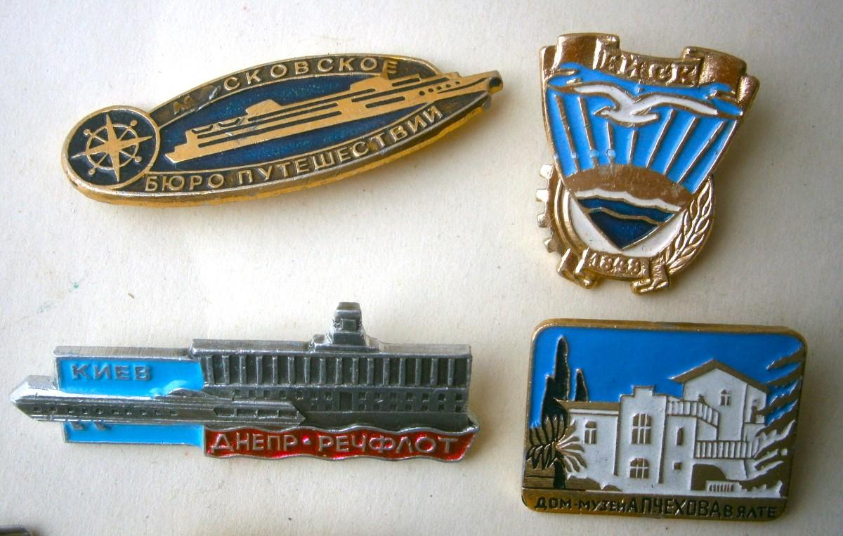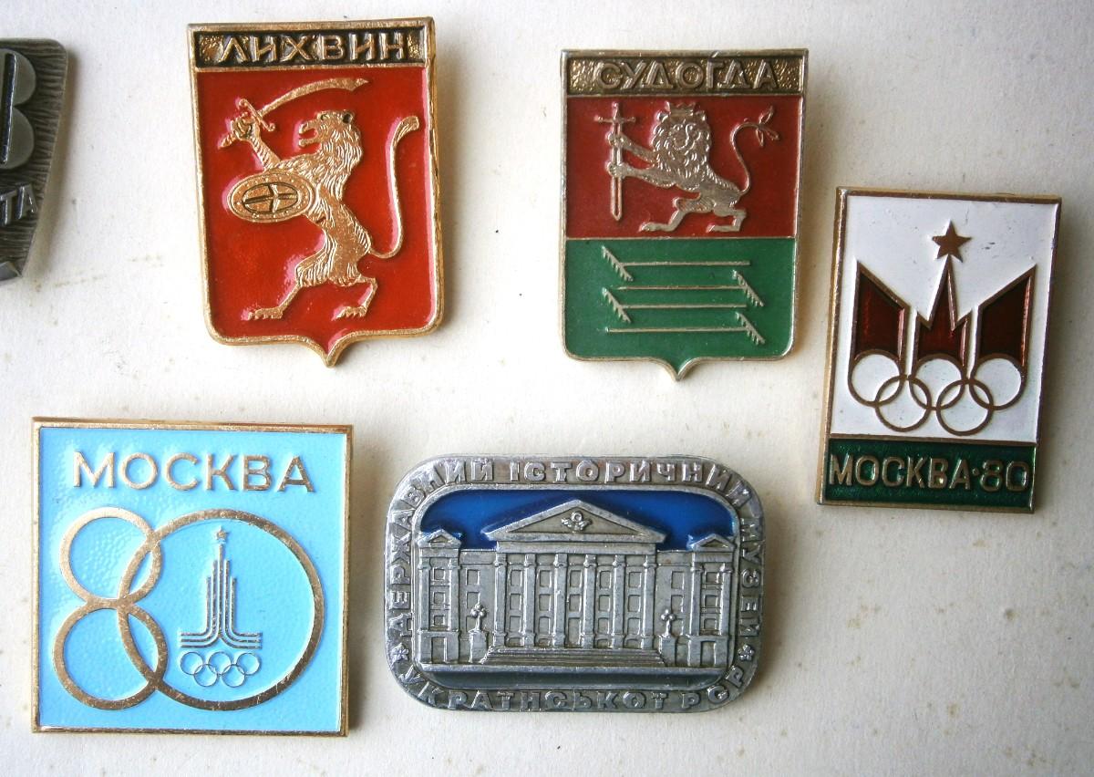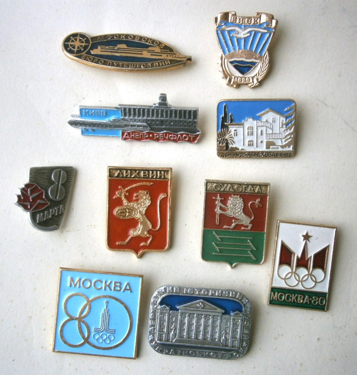 10 Old Russian Commemorative Pins, enamel on metal, 1 in. tall & 2 1 3/4 in. wide, some appear related to Olympics.