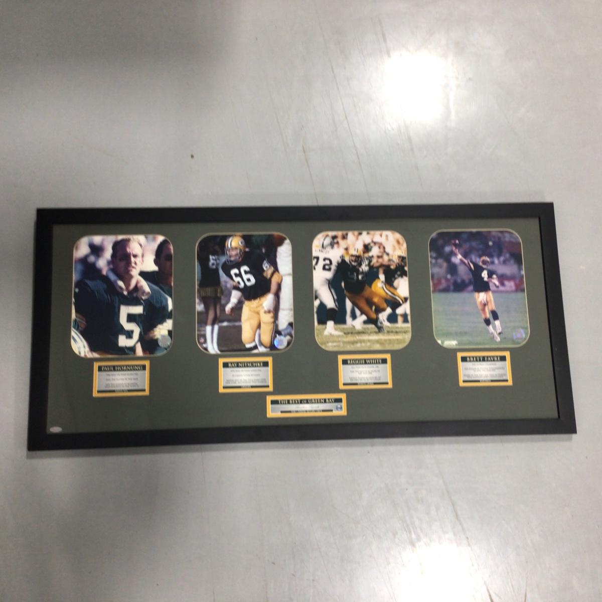 “The Best of Green Bay” framed collector piece with four photographs. 18.5 inches by 41 inches. Please see photos for details and condition. ::: Shipping is NOT available on this lot. If you have any questions regarding this lot please contact the auctioneer either via this website, by direct email or by phone. PICK UP TIMES and other important information can be found in the TERMS and DESCRIPTION of the auction. Please take a look for pertinent information. Thanks!