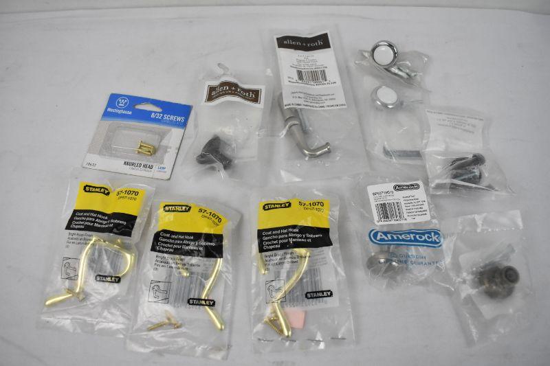 10 pc Hardware: 7 knobs & 3 wall hooks - New