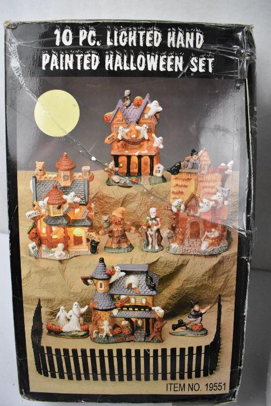 10 pc Lighted Hand Painted Halloween Set (4 houses 4 figurines, fence, lights)