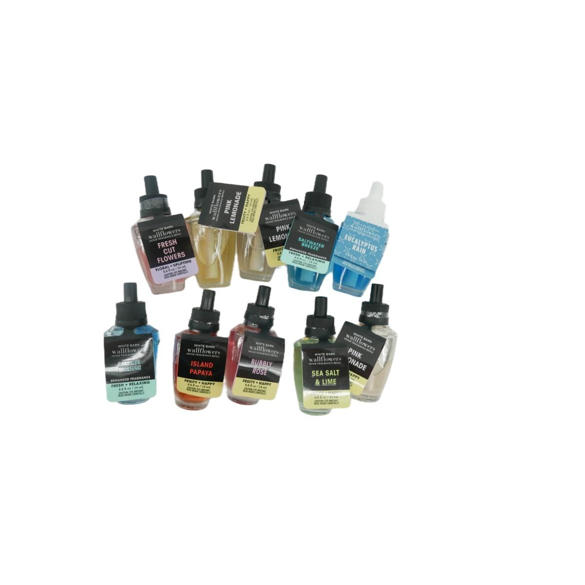 10 Bath & Body Works Wallflowers home fragrance refills: pink lemonade x3, fresh cut flowers, saltwater breeze, eucalyptus rain, lakeside morning, island papaya, bubbly rosé, and sea salt & lime. All are NEW and sealed except lakeside morning which has been gently used - 90% full.