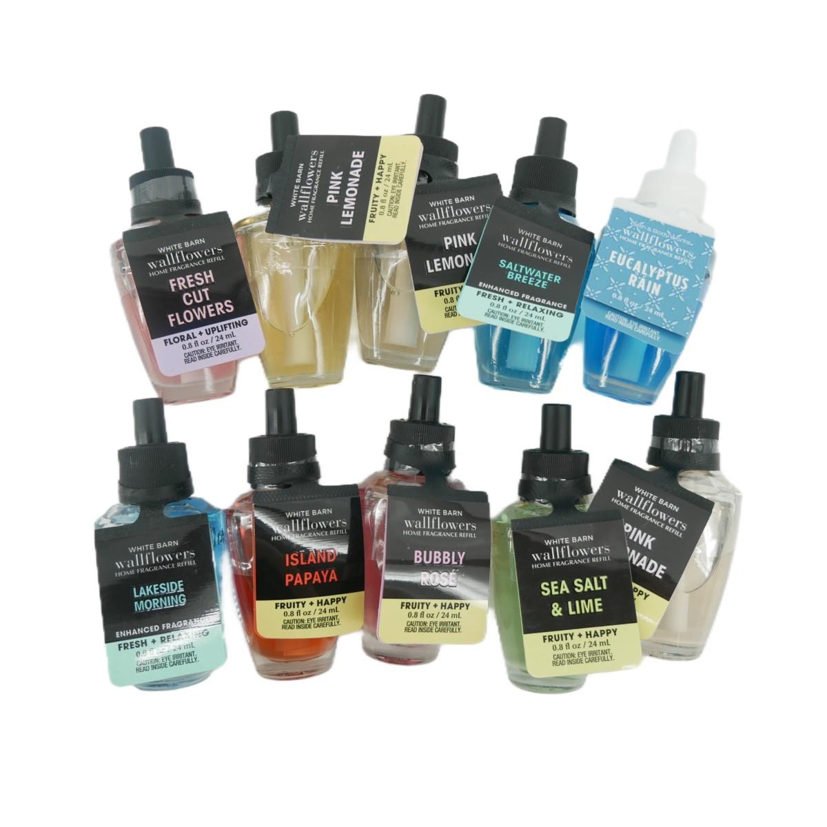 10 Bath & Body Works Wallflowers home fragrance refills: pink lemonade x3, fresh cut flowers, saltwater breeze, eucalyptus rain, lakeside morning, island papaya, bubbly rosé, and sea salt & lime. All are NEW and sealed except lakeside morning which has been gently used - 90% full.
