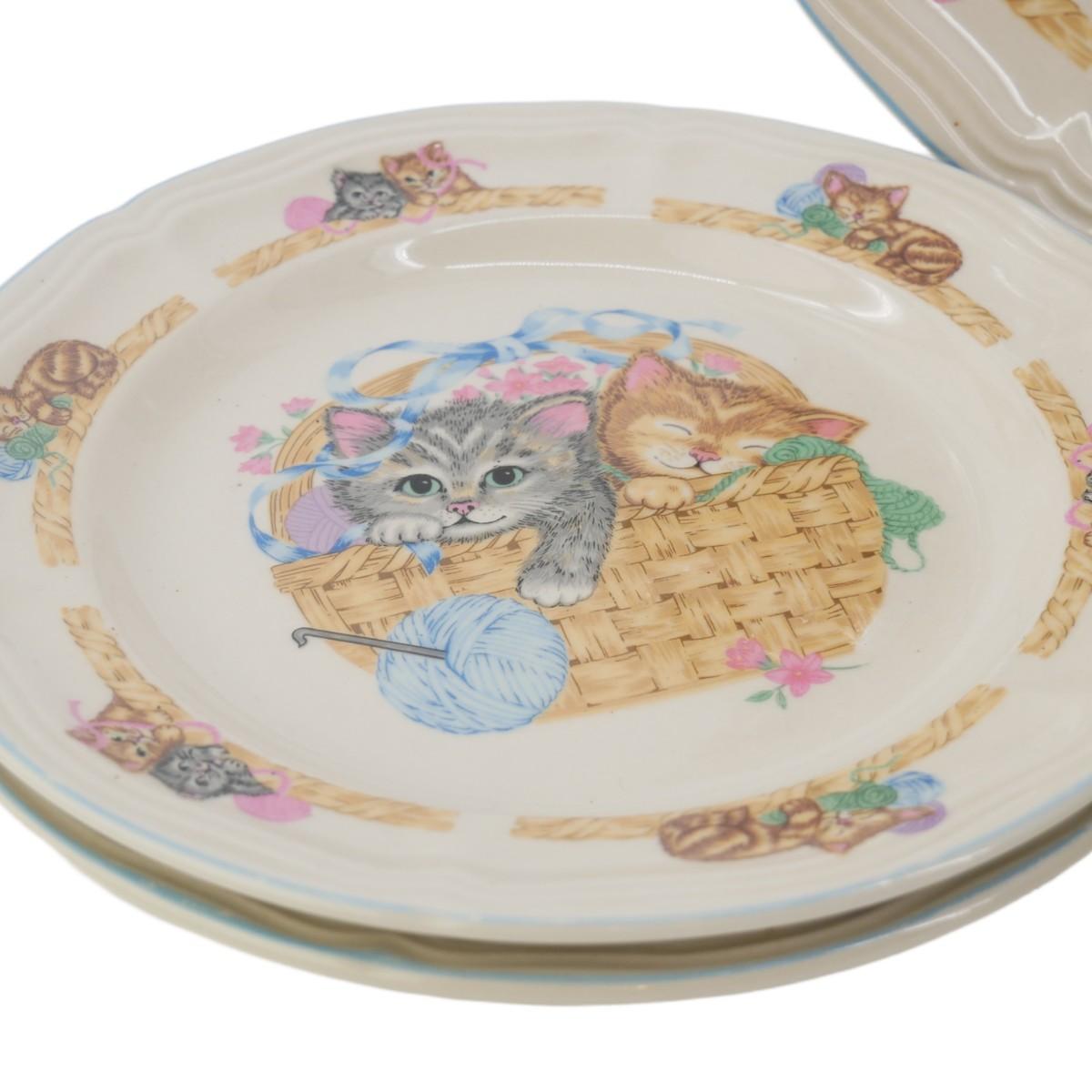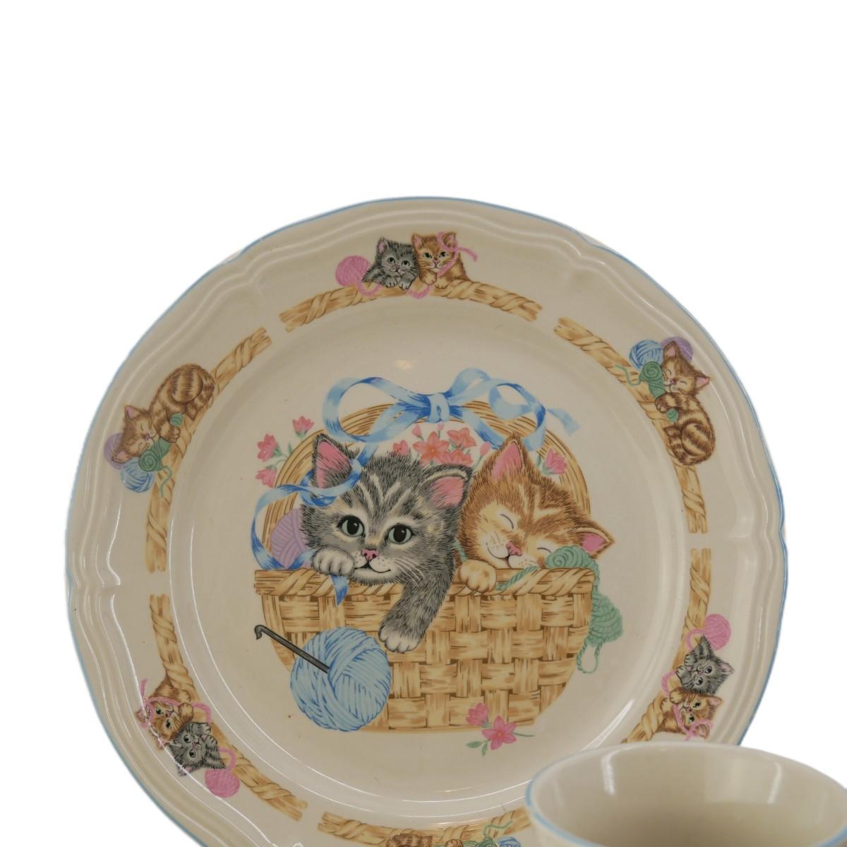 Vintage Tienshan Stoneware "Purrfect Friends" kitten kitty cat set. Two of each of the following: dinner plates, salad/appetizer plates, mugs, saucers, and bowls. Largest dinner plates measure 10.5" across. Minimal chips and dings from age. No major issues found, overall fantastic condition!