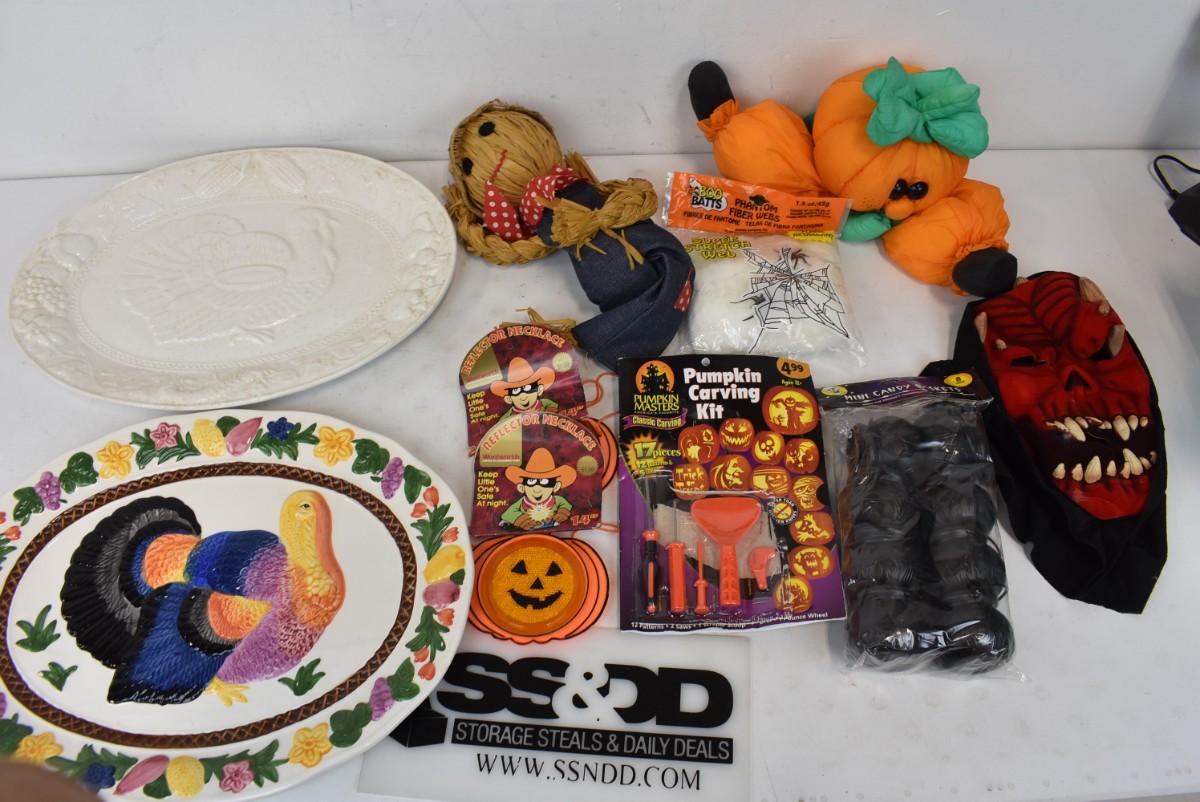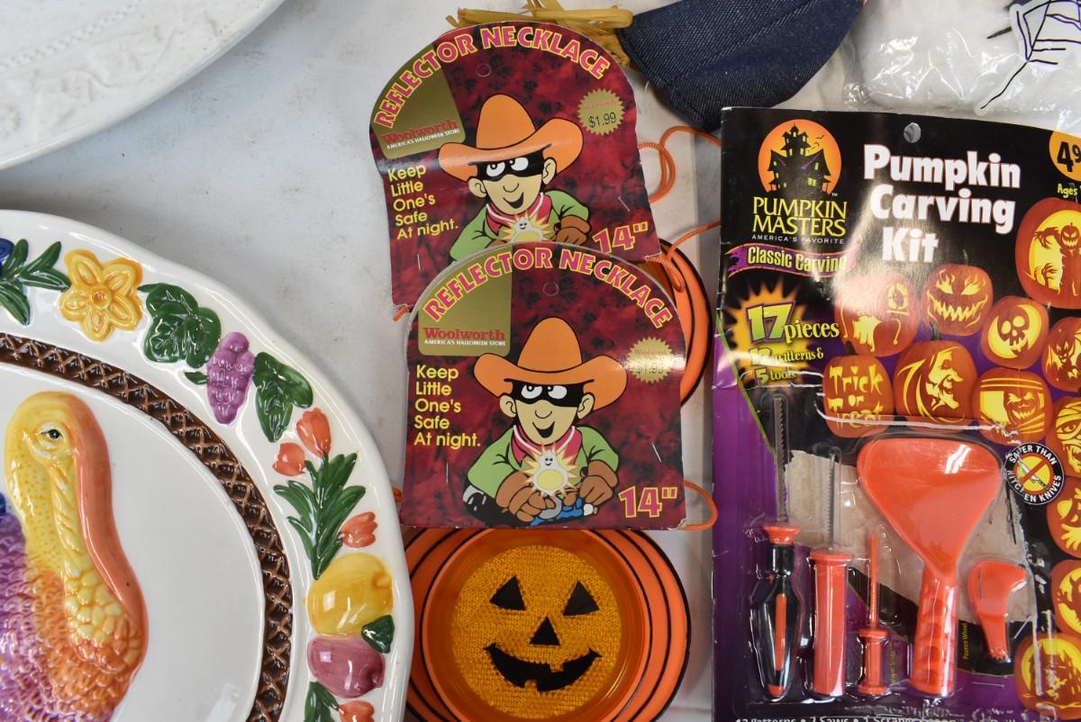 10 Piece Fall Holiday Lot, Two Turkey Plates, One Unpainted, two Reflector Necklaces