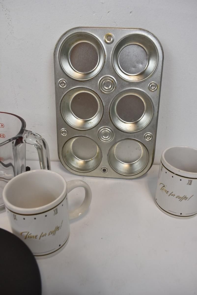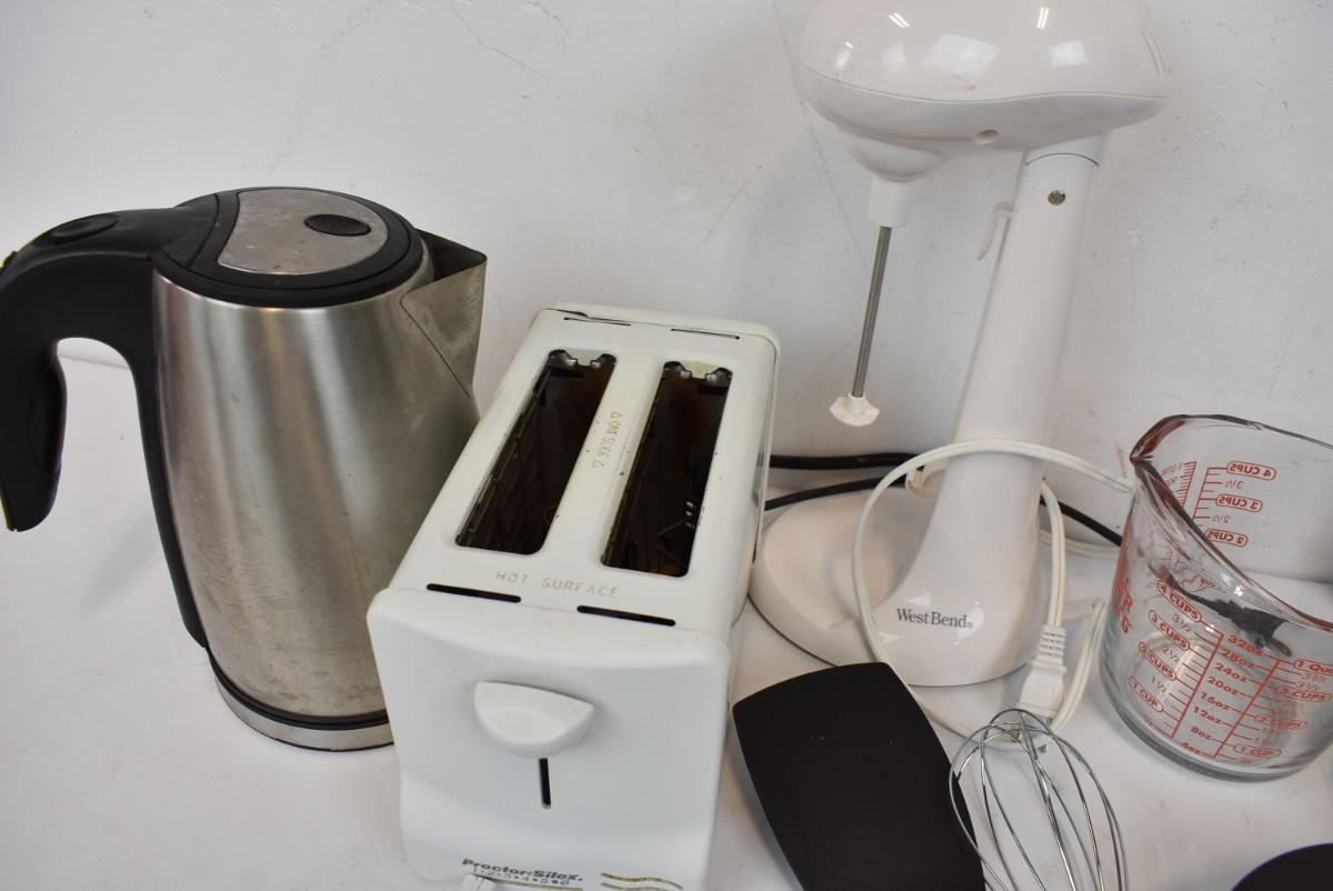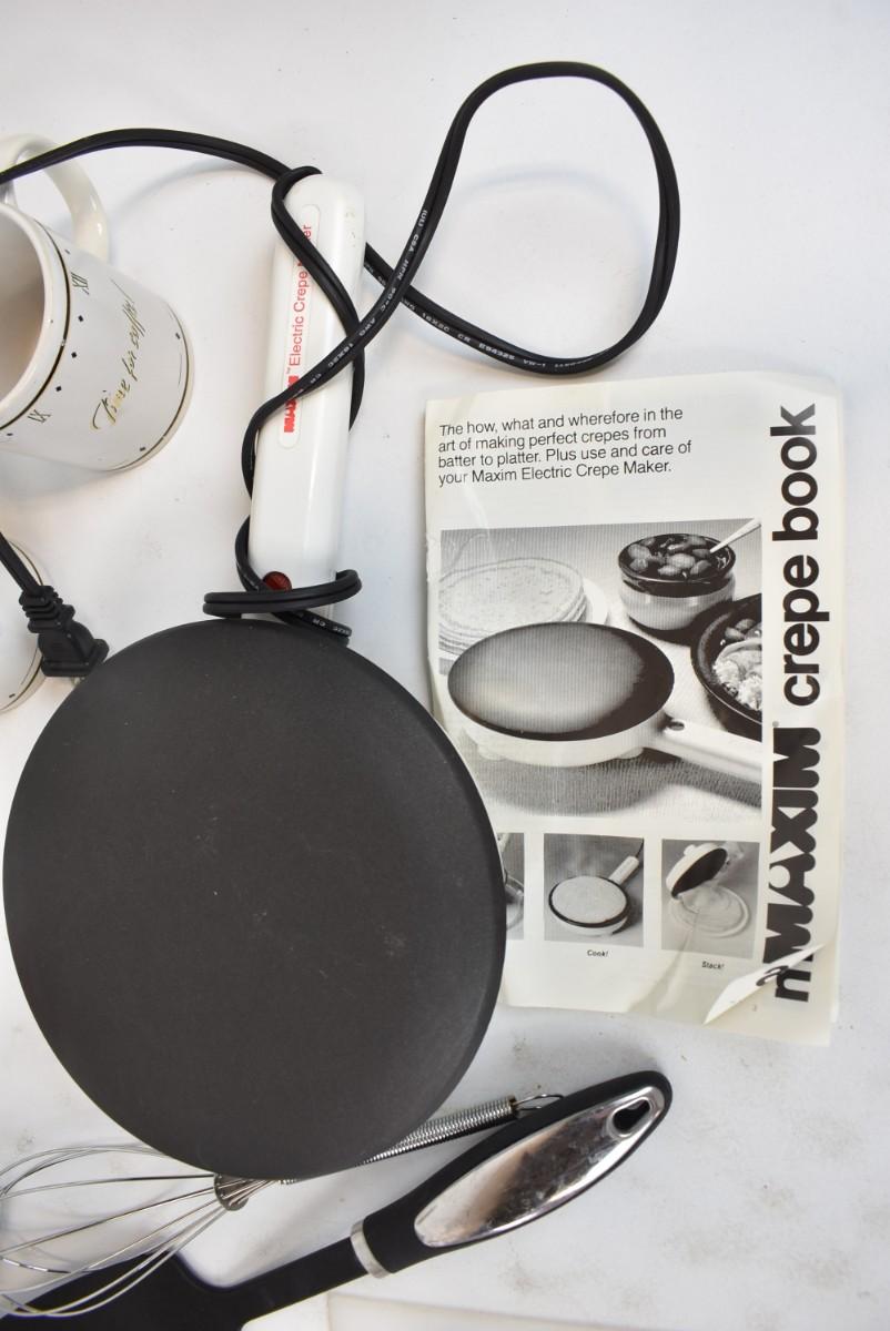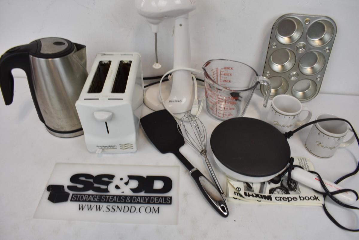 10 Piece Kitchen Lot, Electric Crepe Maker, Toaster, Two Coffee Mugs