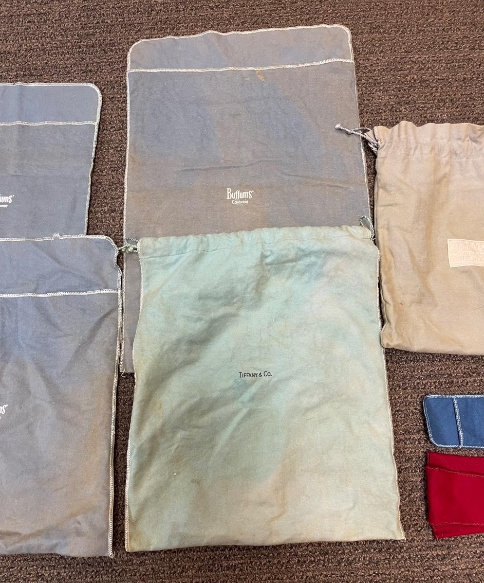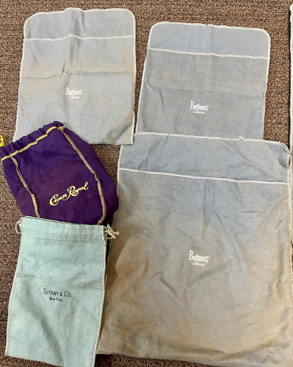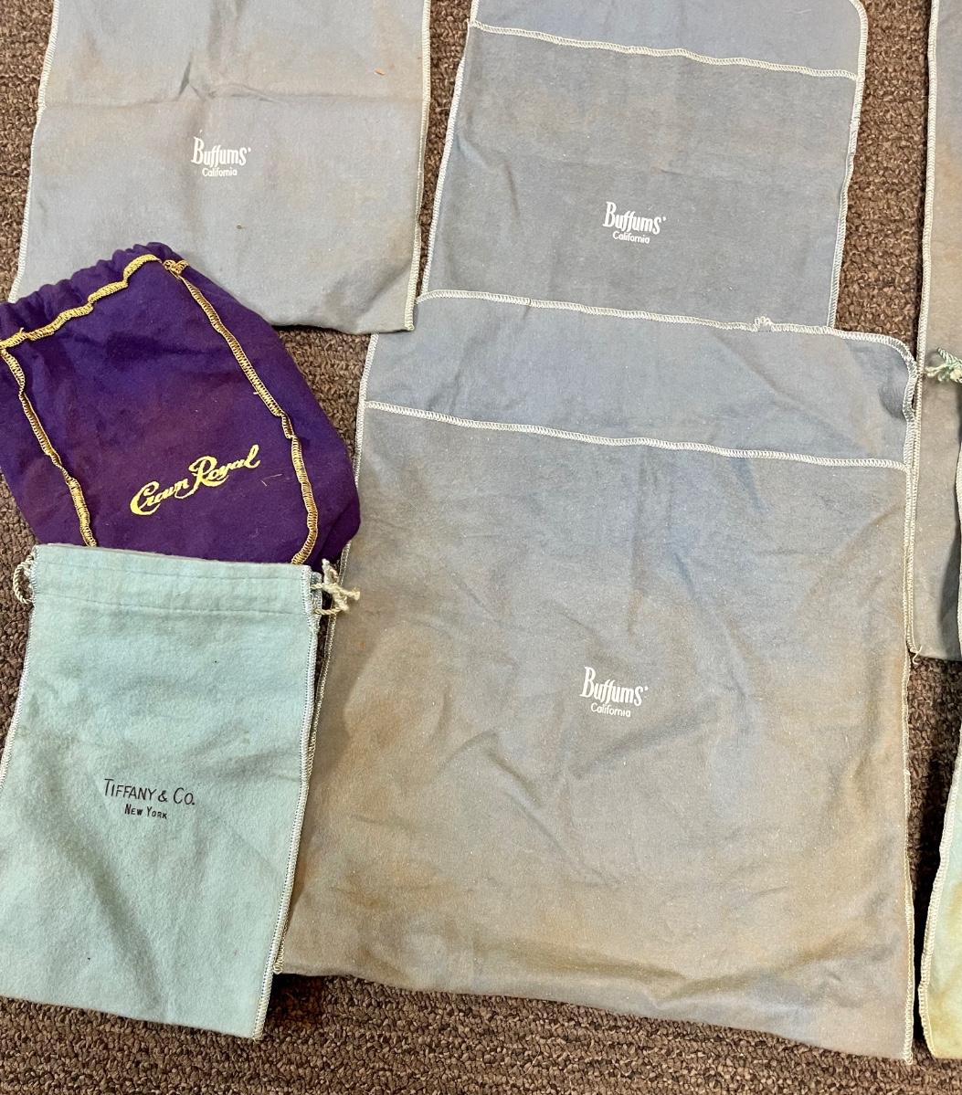 10 piece lot of flannel storage bags, Tiffany & Co. Buffums, Crown Royal