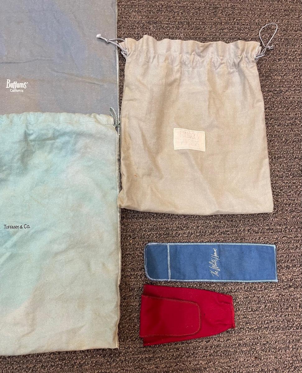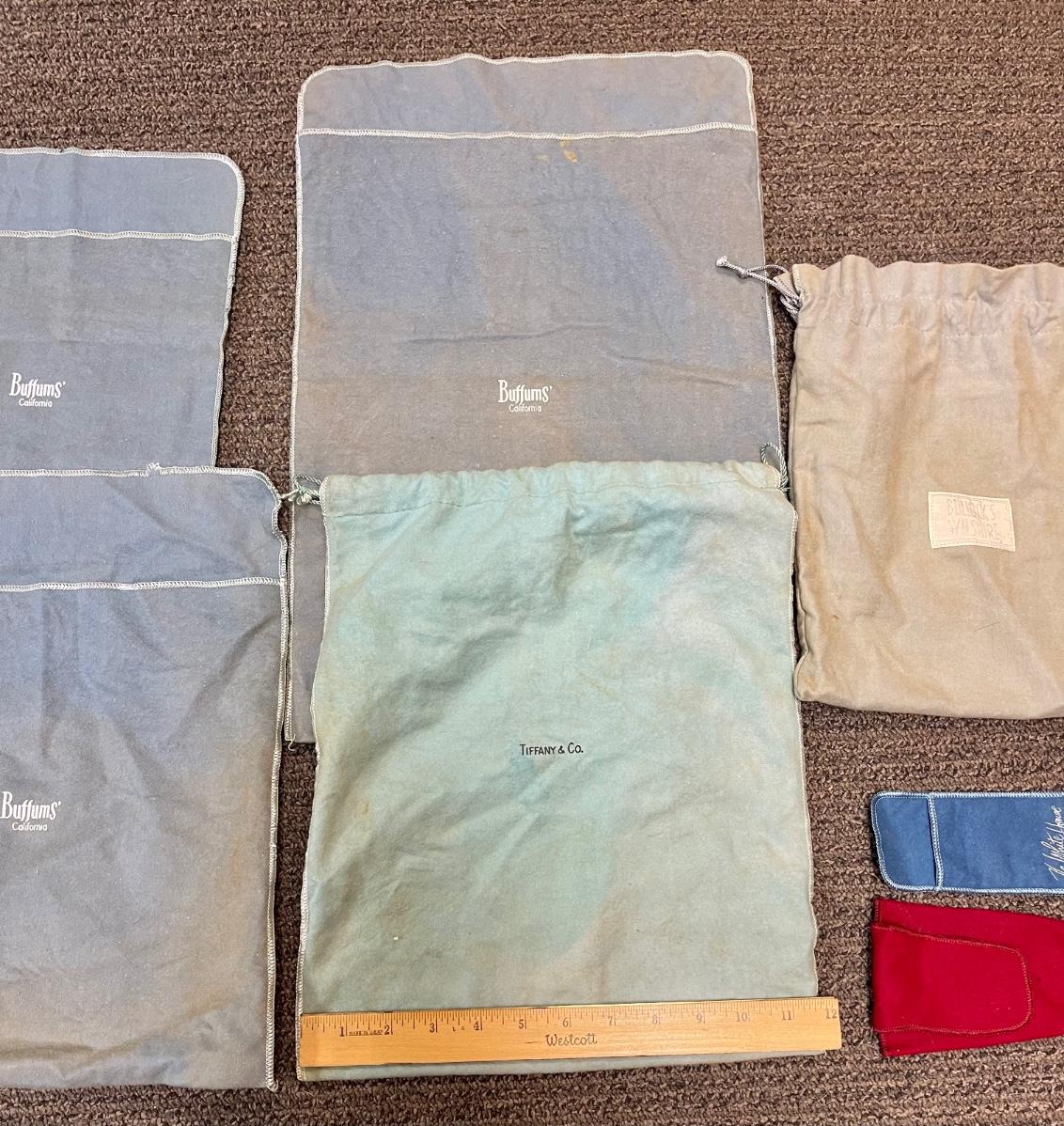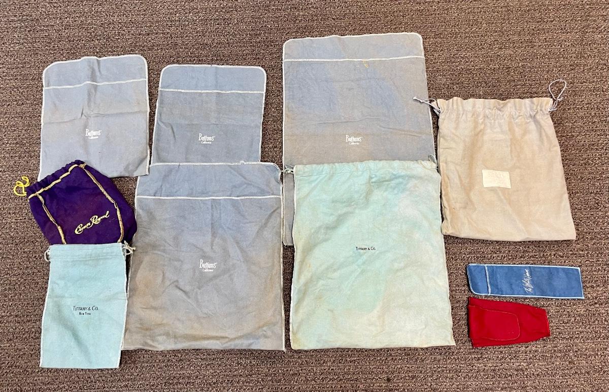 10 piece lot of flannel storage bags, Tiffany & Co. Buffums, Crown Royal