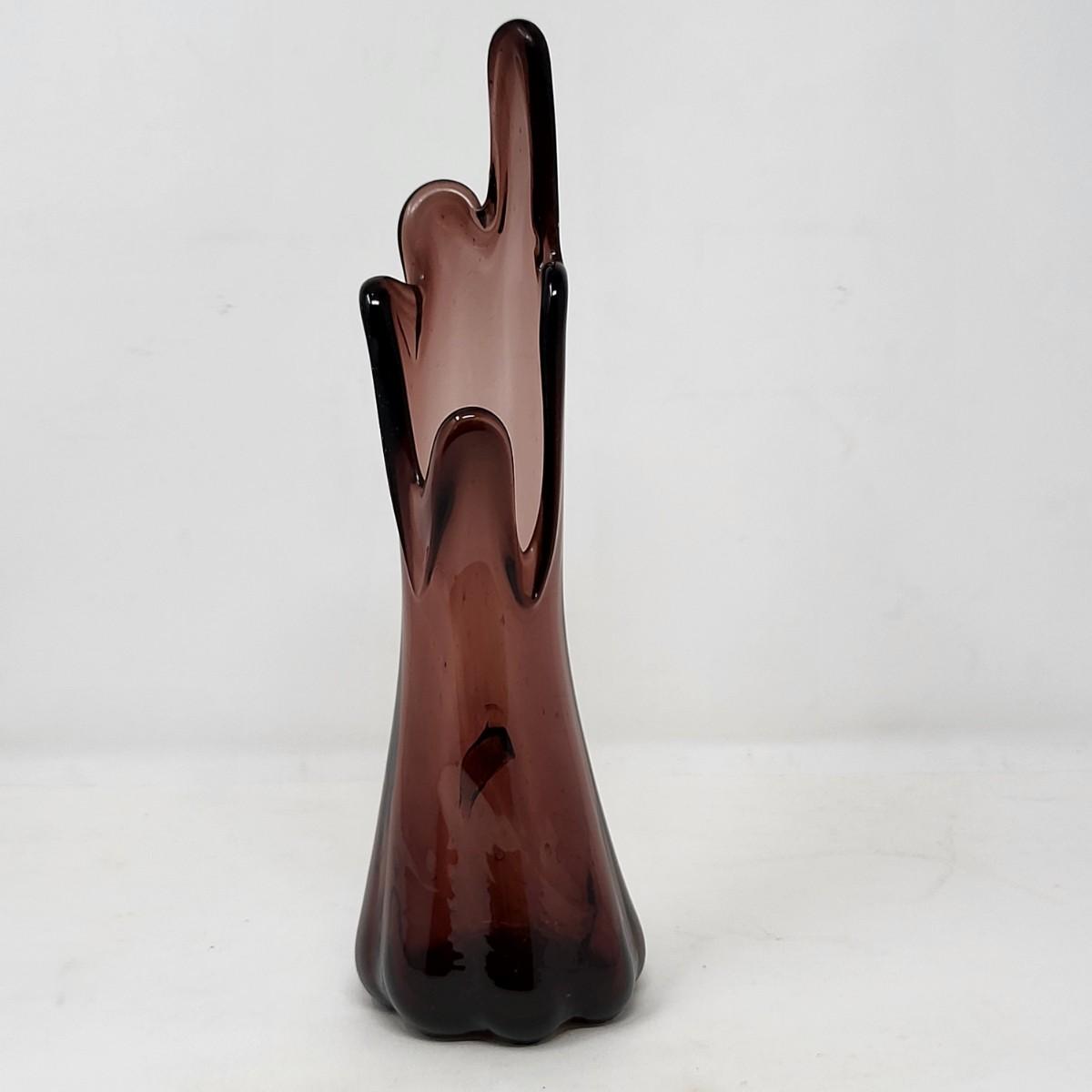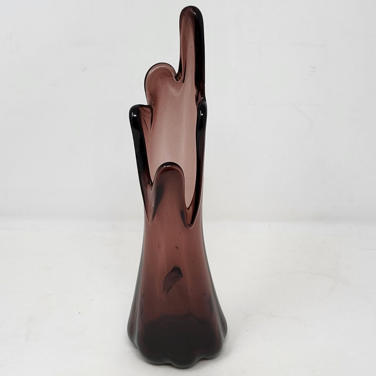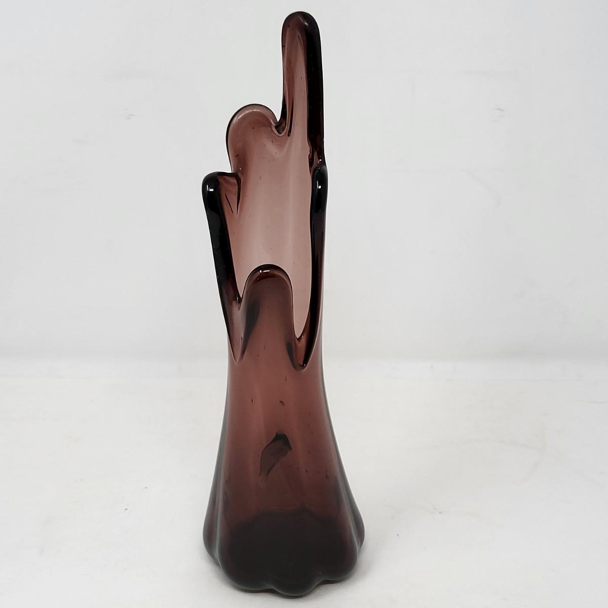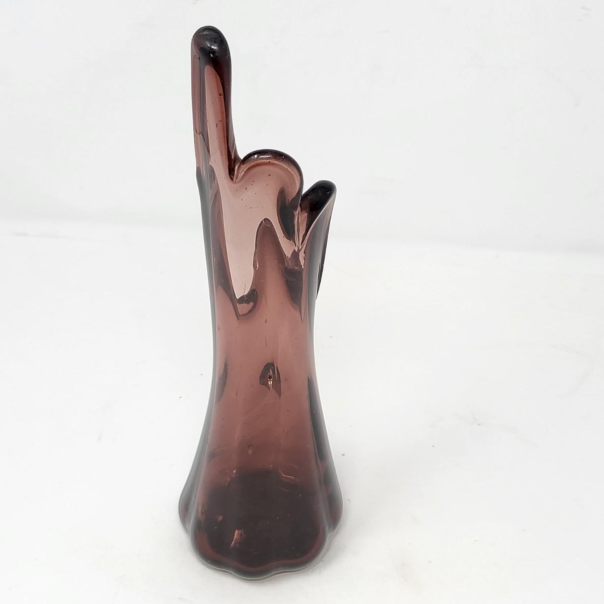 Plum or amethyst color, hand swung four-finger art glass vase, measuring 10" at it's tallest x 3" wide at the base.
