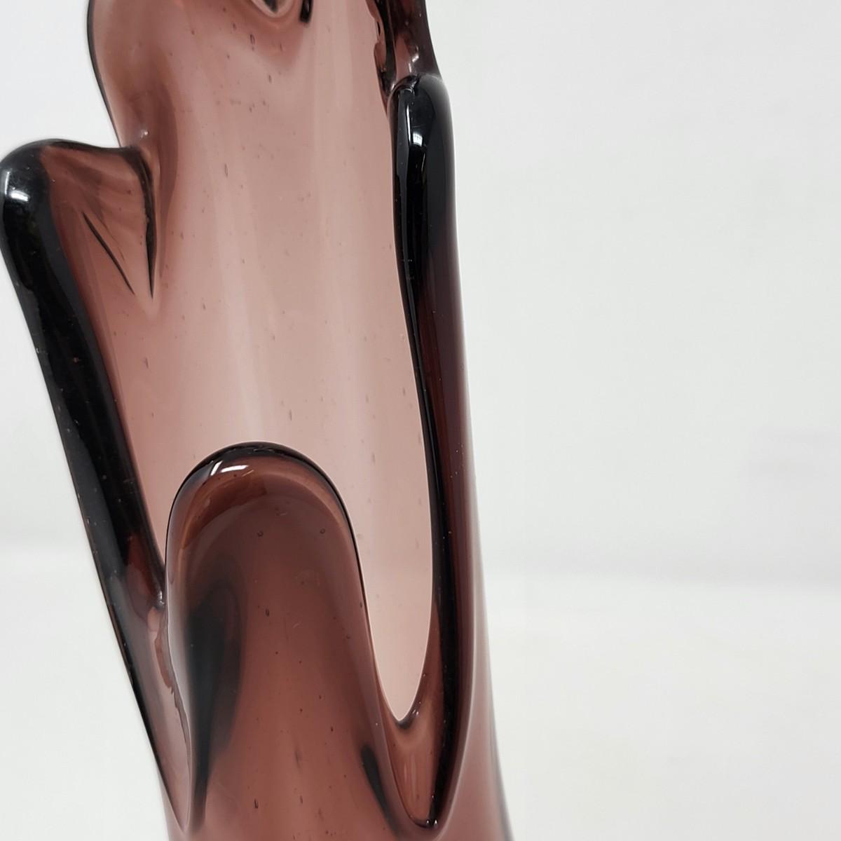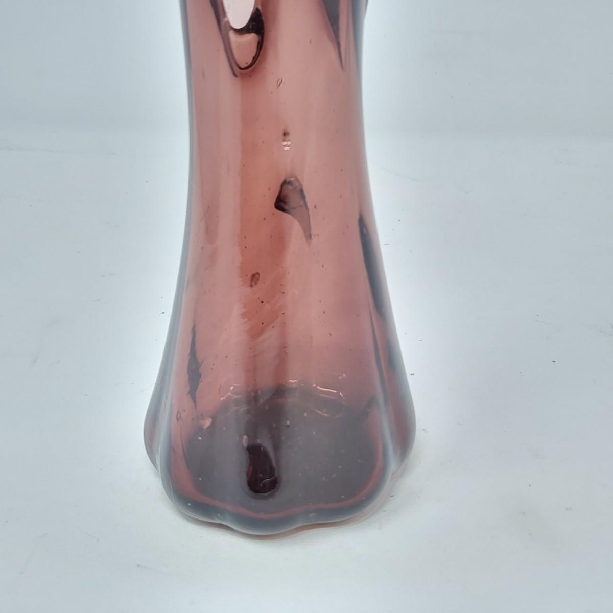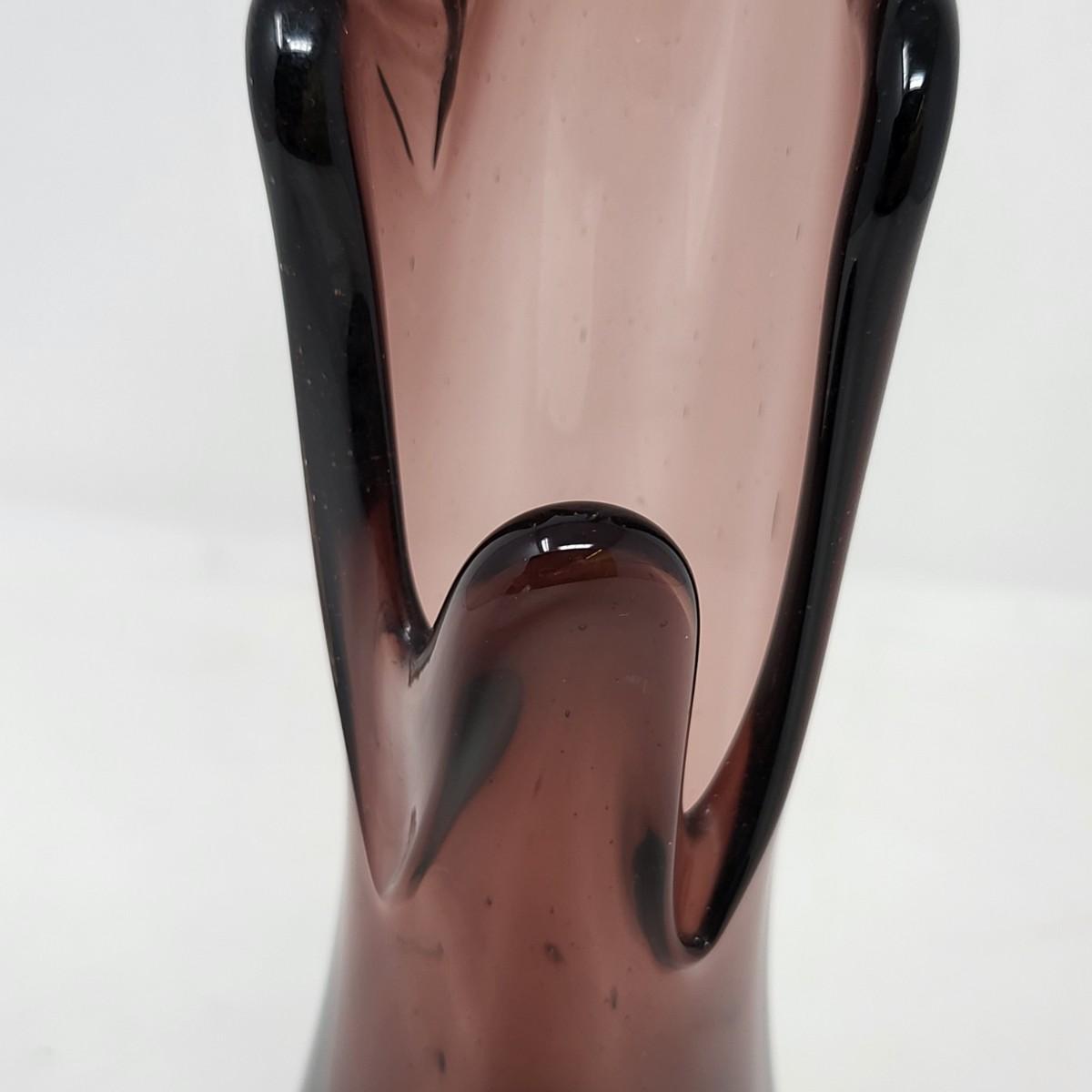 Plum or amethyst color, hand swung four-finger art glass vase, measuring 10" at it's tallest x 3" wide at the base.