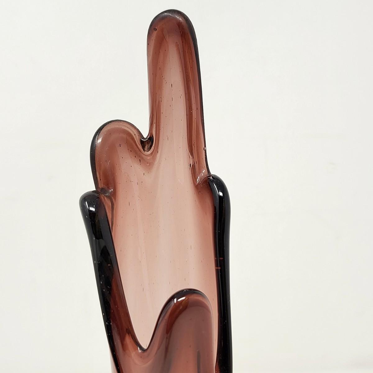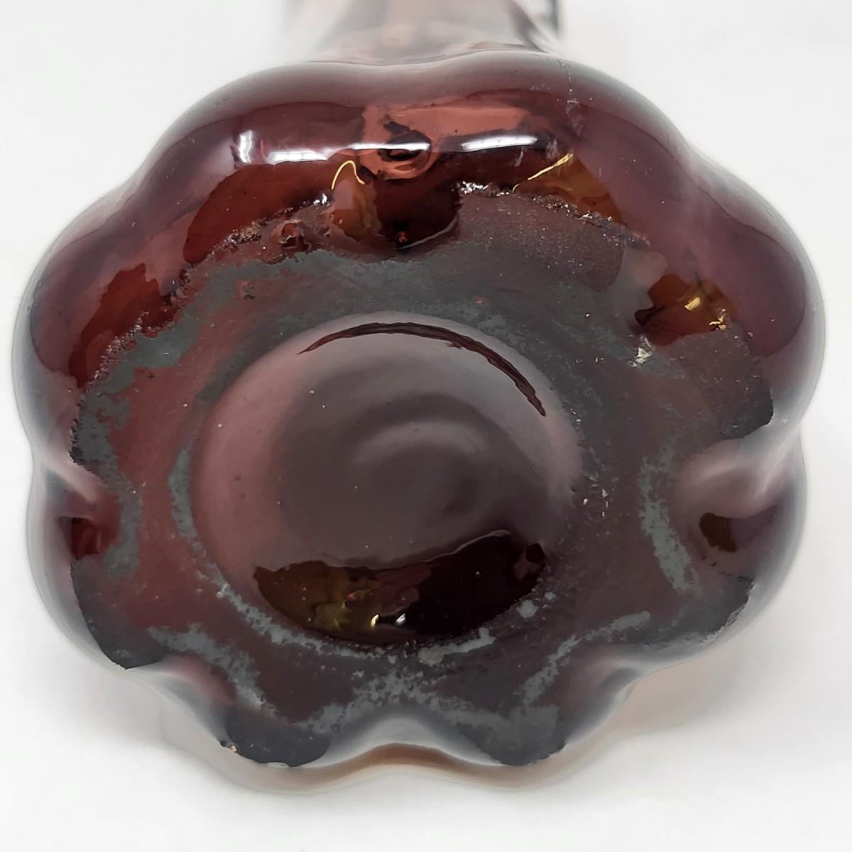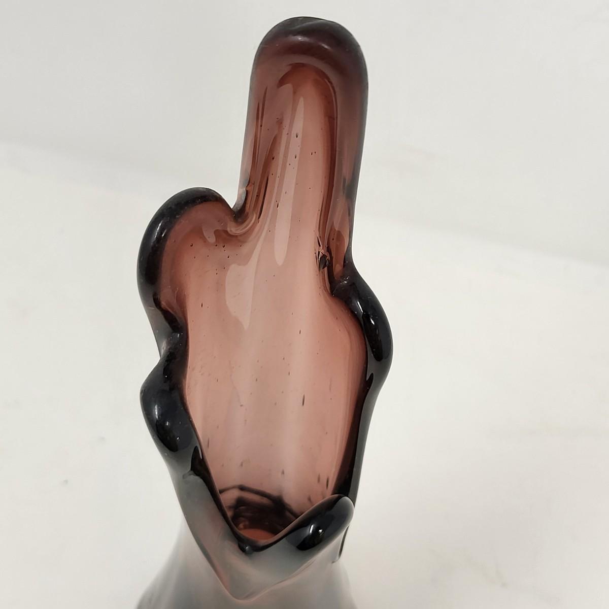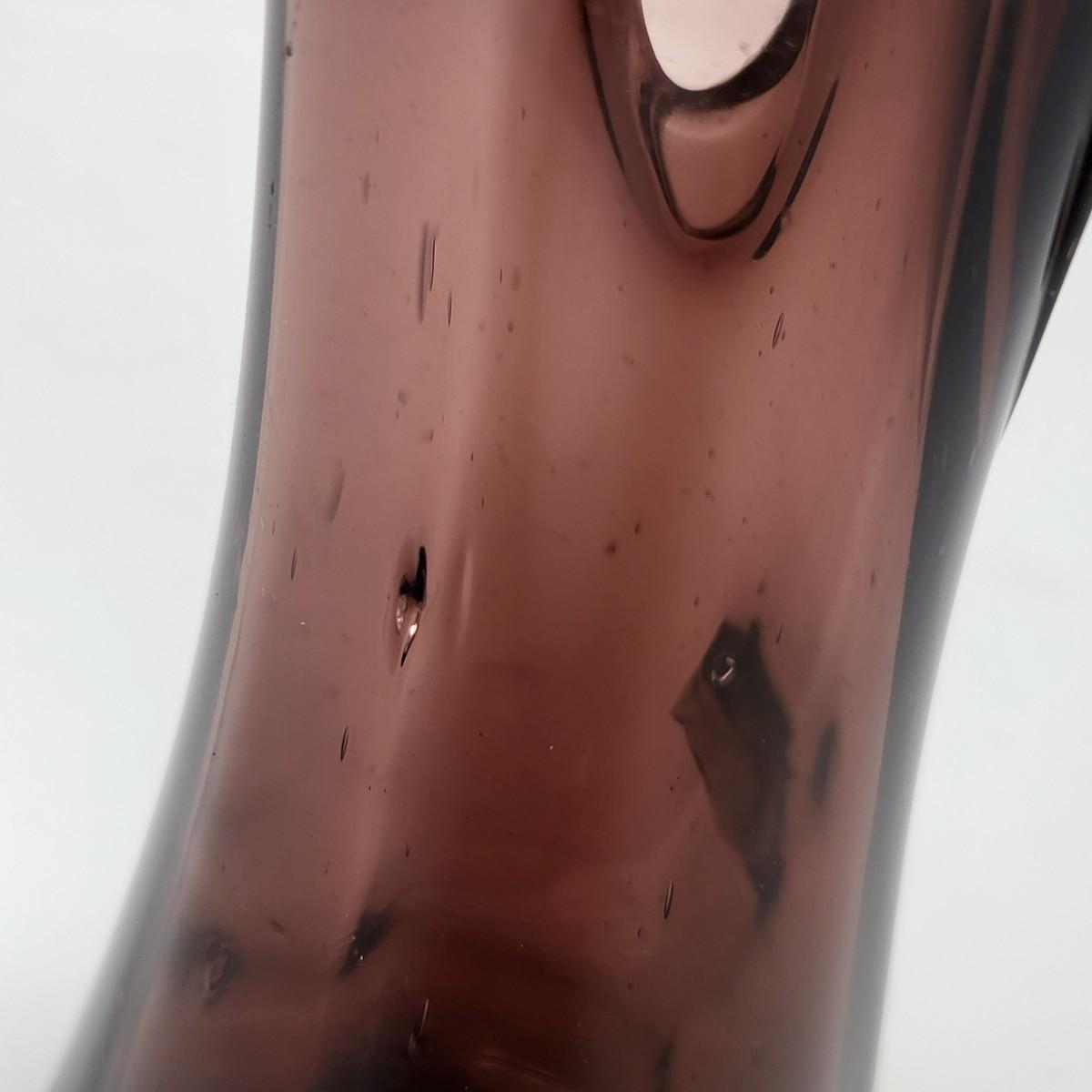 Plum or amethyst color, hand swung four-finger art glass vase, measuring 10" at it's tallest x 3" wide at the base.