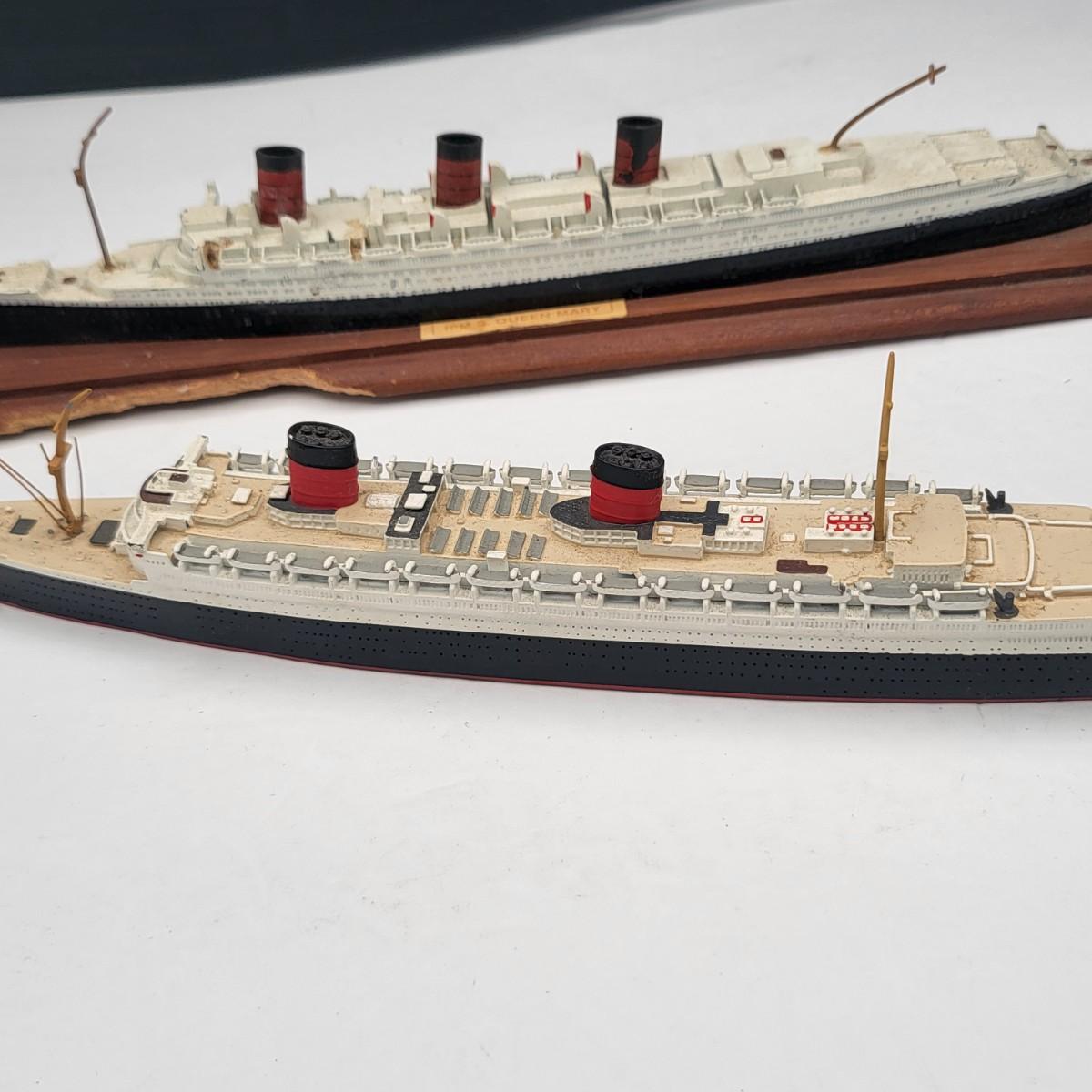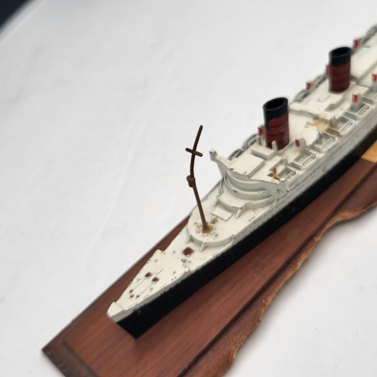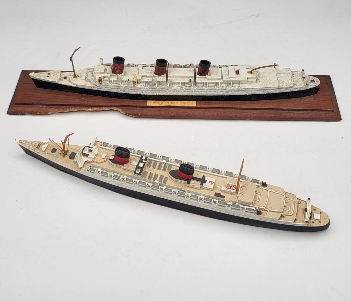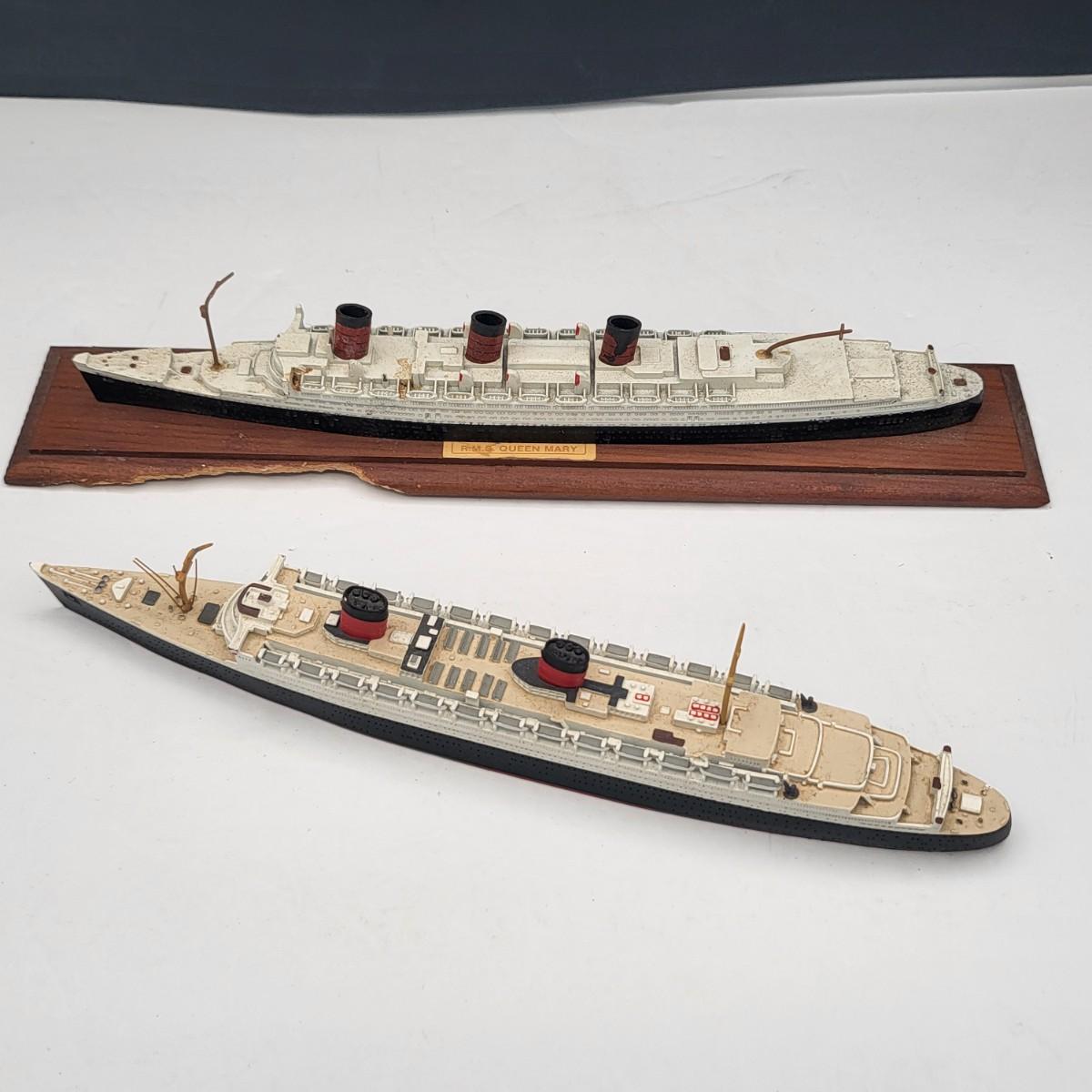 Collectible vintage ship models. Queen Mary is mounted on a wood stand that has damage (could be removed or repaired). Queen Elizabeth is unmounted. Both are 10" long die cast metal ship models. Sold as-found.