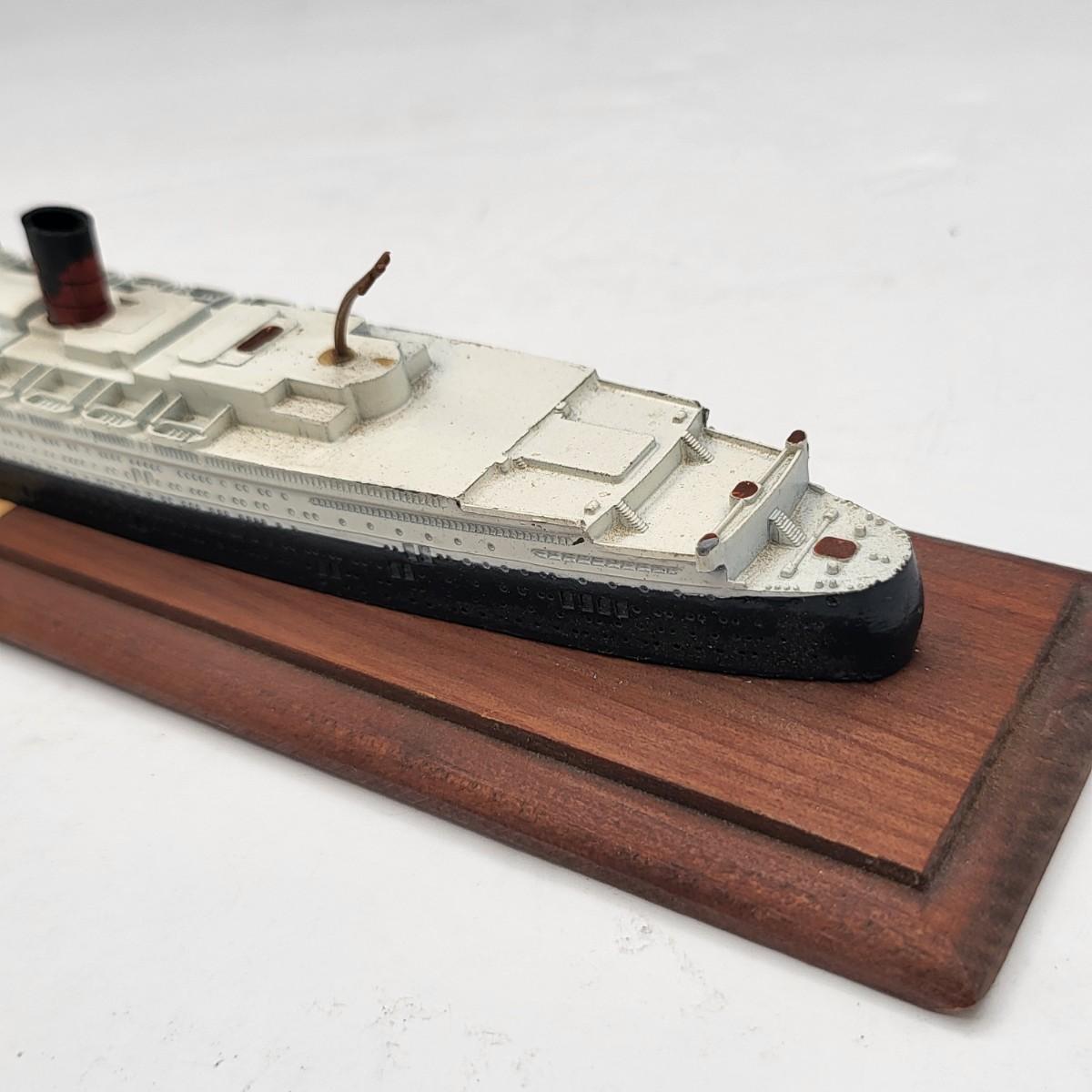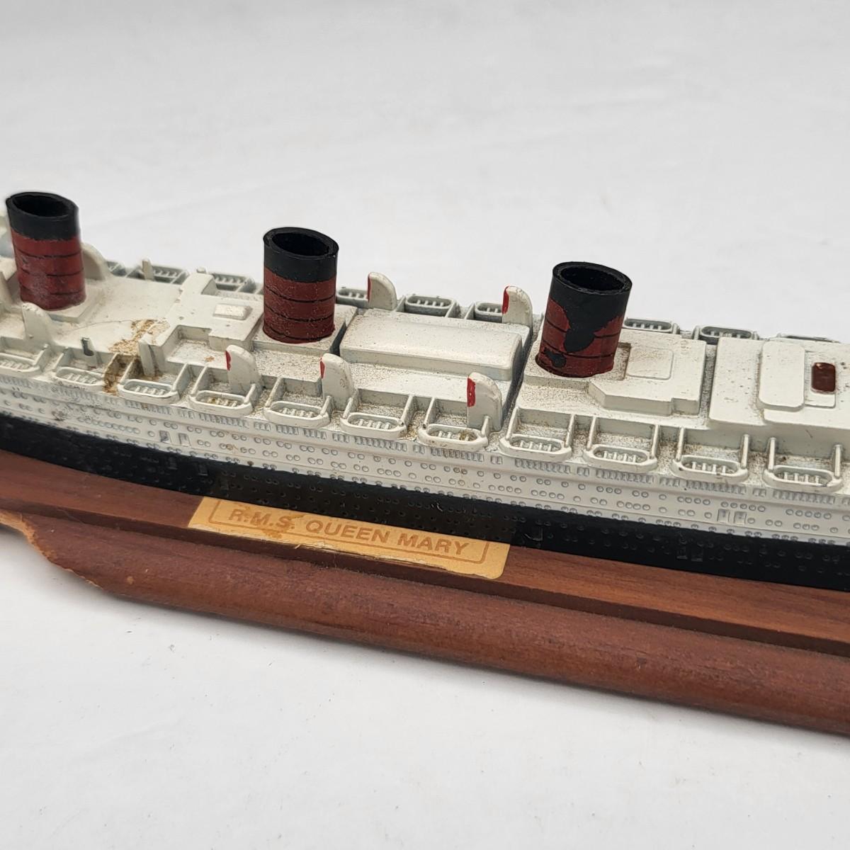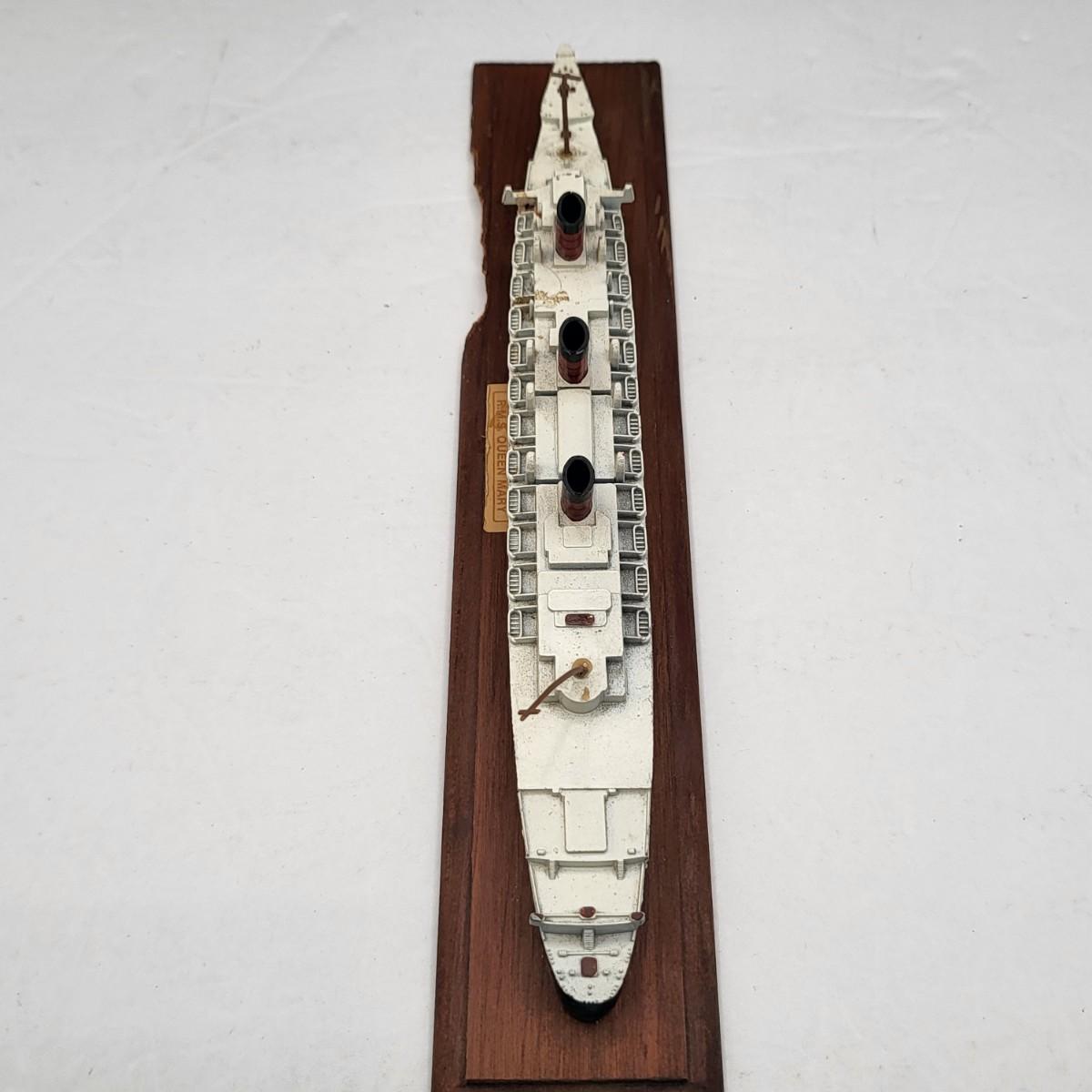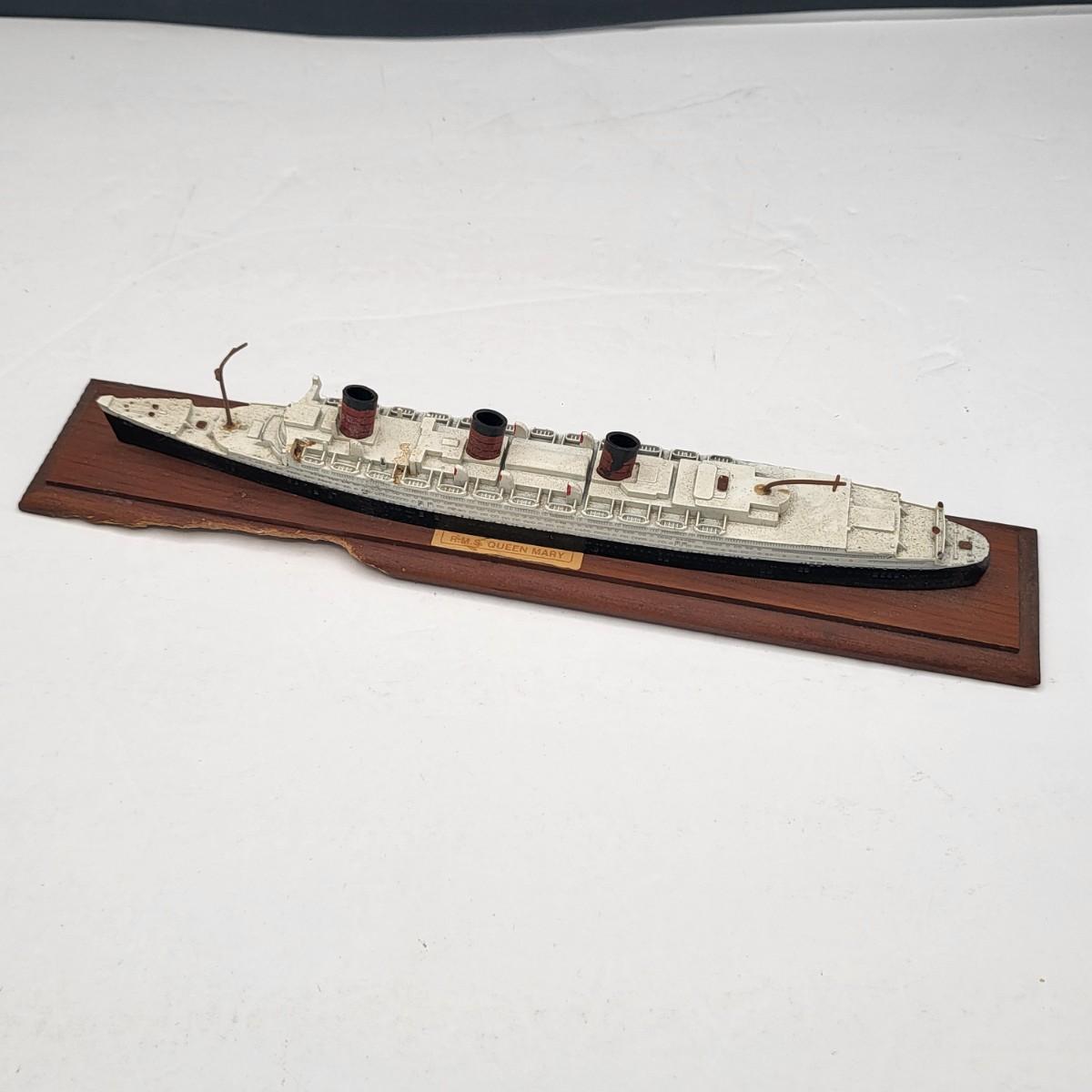Collectible vintage ship models. Queen Mary is mounted on a wood stand that has damage (could be removed or repaired). Queen Elizabeth is unmounted. Both are 10" long die cast metal ship models. Sold as-found.