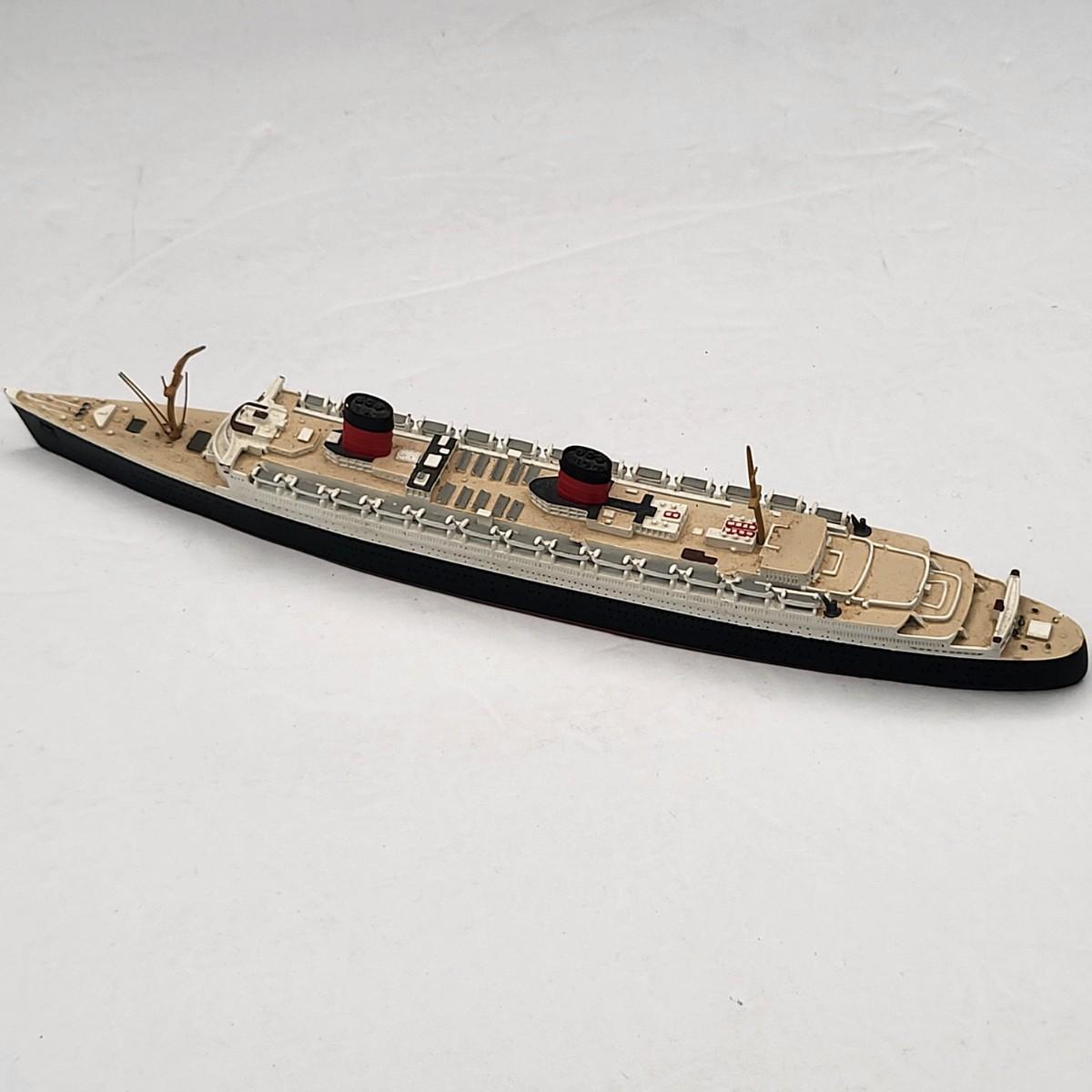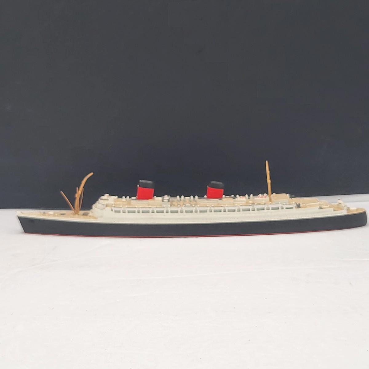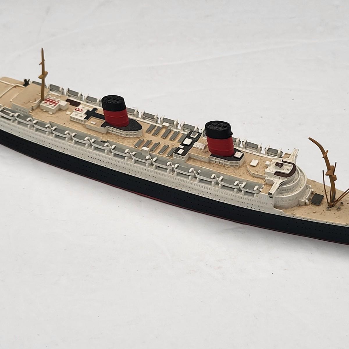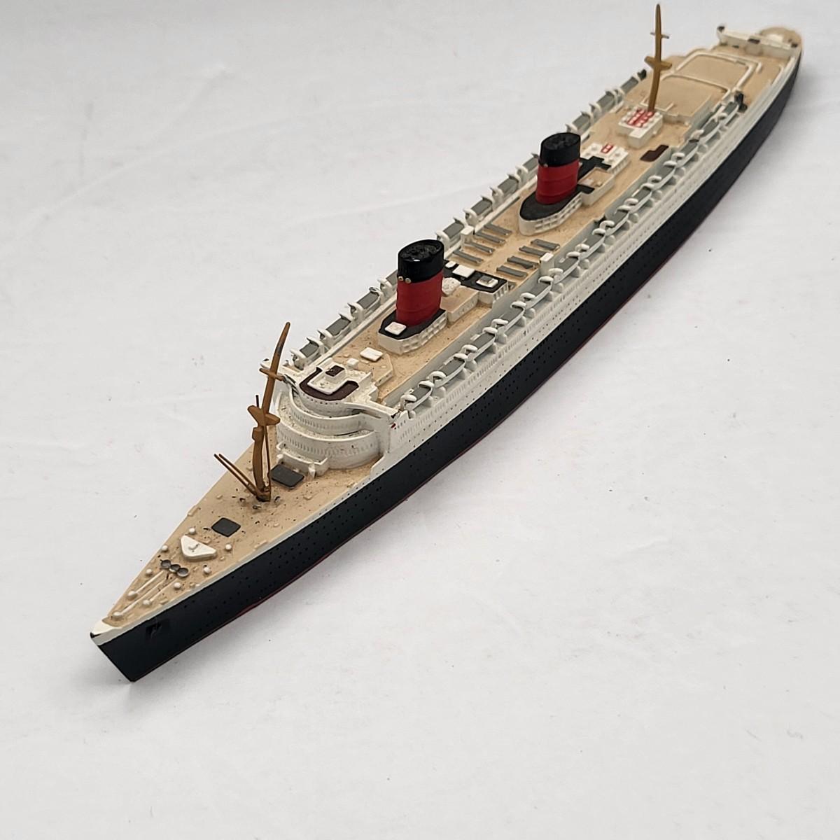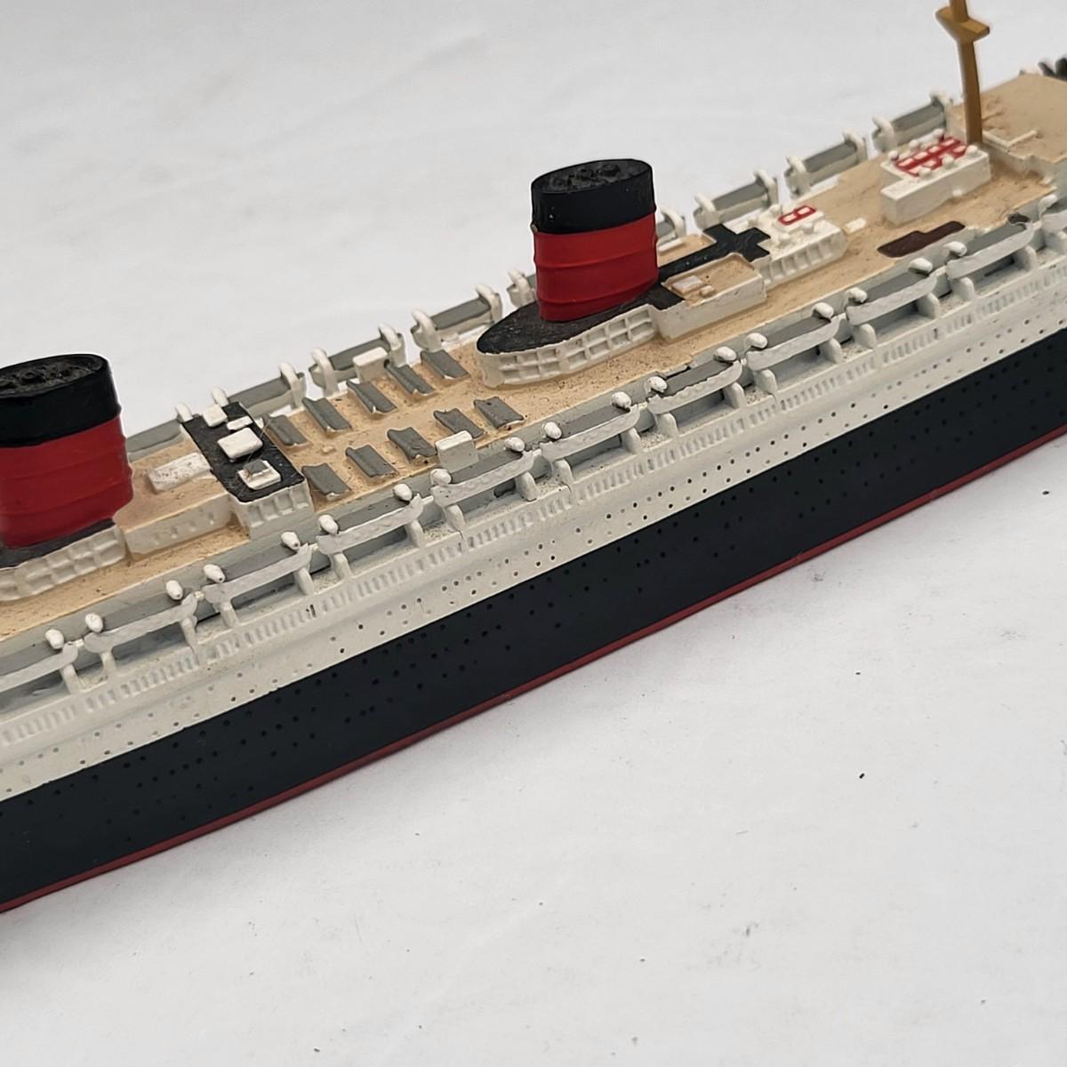 Collectible vintage ship models. Queen Mary is mounted on a wood stand that has damage (could be removed or repaired). Queen Elizabeth is unmounted. Both are 10" long die cast metal ship models. Sold as-found.