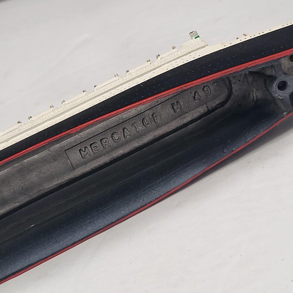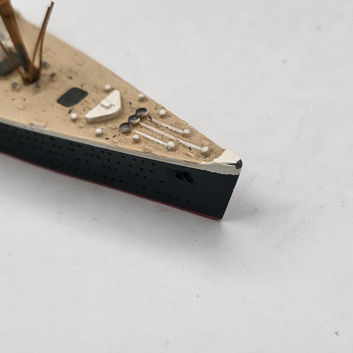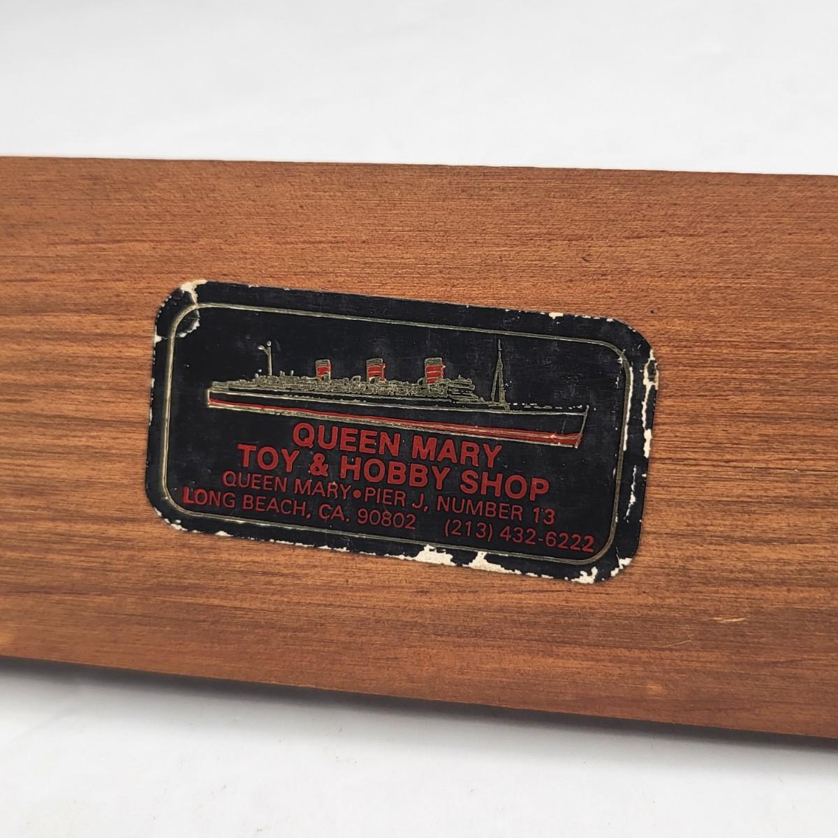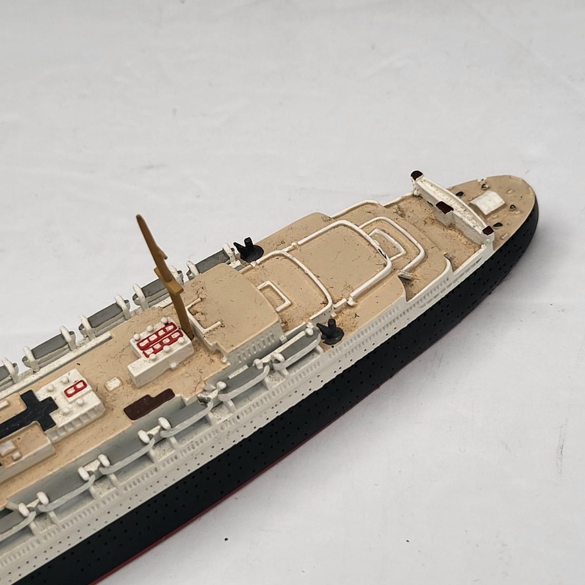 Collectible vintage ship models. Queen Mary is mounted on a wood stand that has damage (could be removed or repaired). Queen Elizabeth is unmounted. Both are 10" long die cast metal ship models. Sold as-found.
