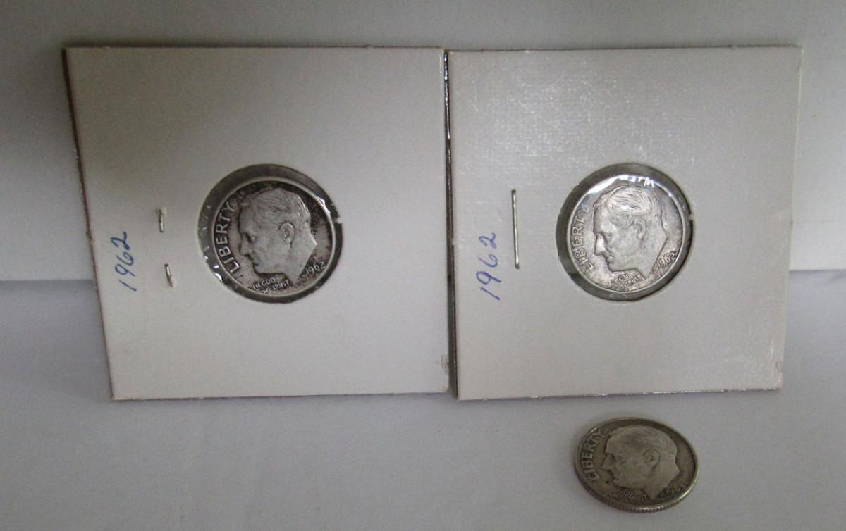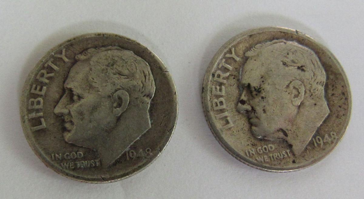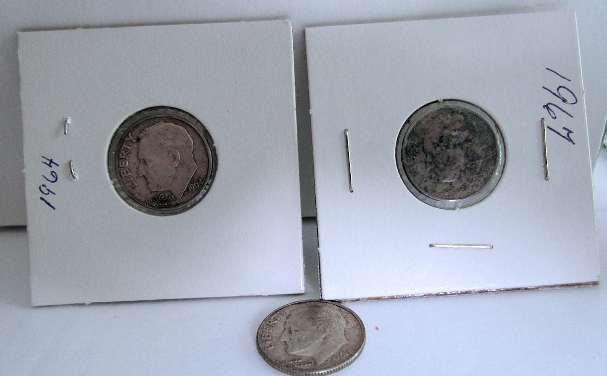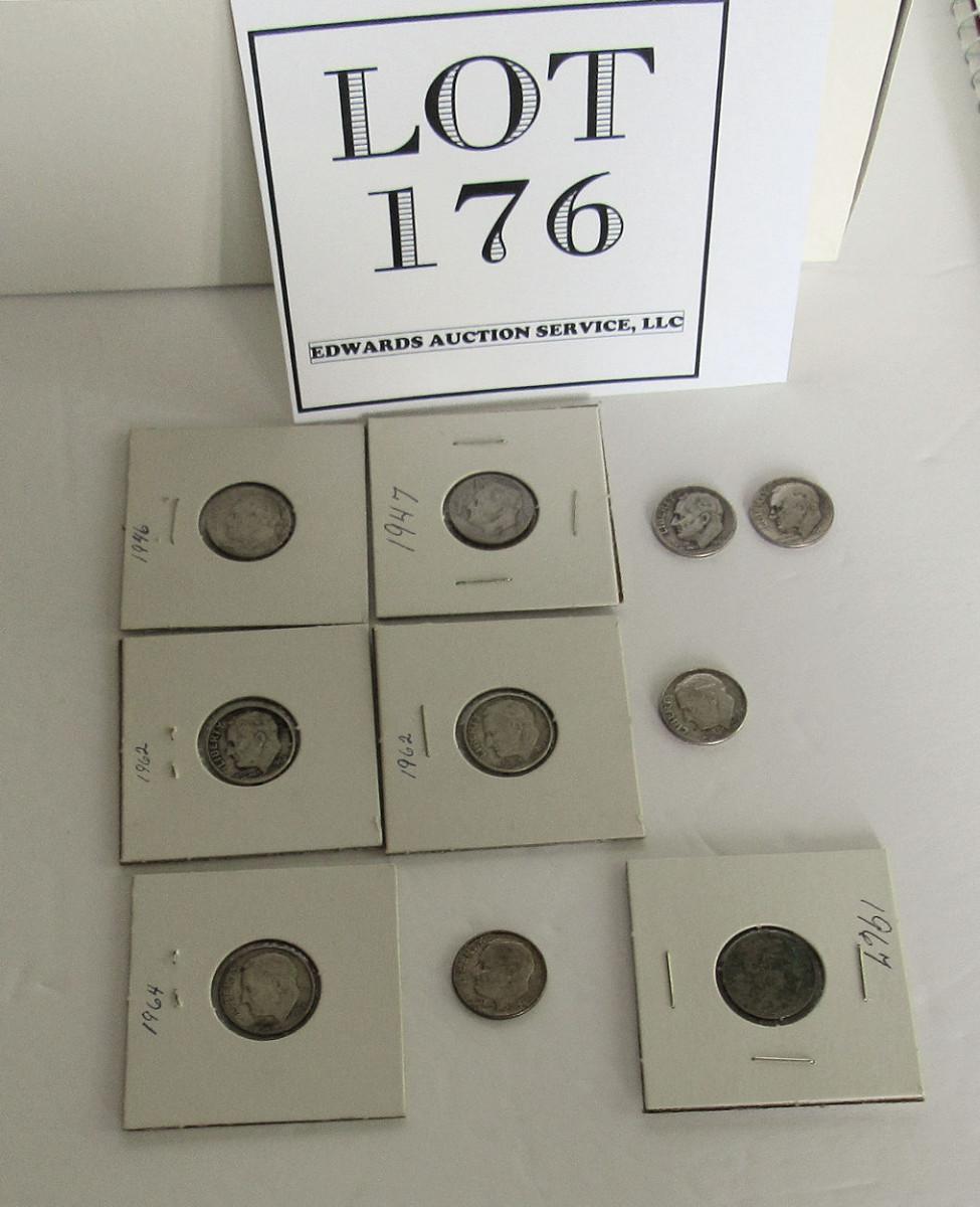 10 Silver Dimes:  1946 P, 1947 S, 1948 D (2), 1962 D (2), 1963 D, 1964 D (2), 1967 P
