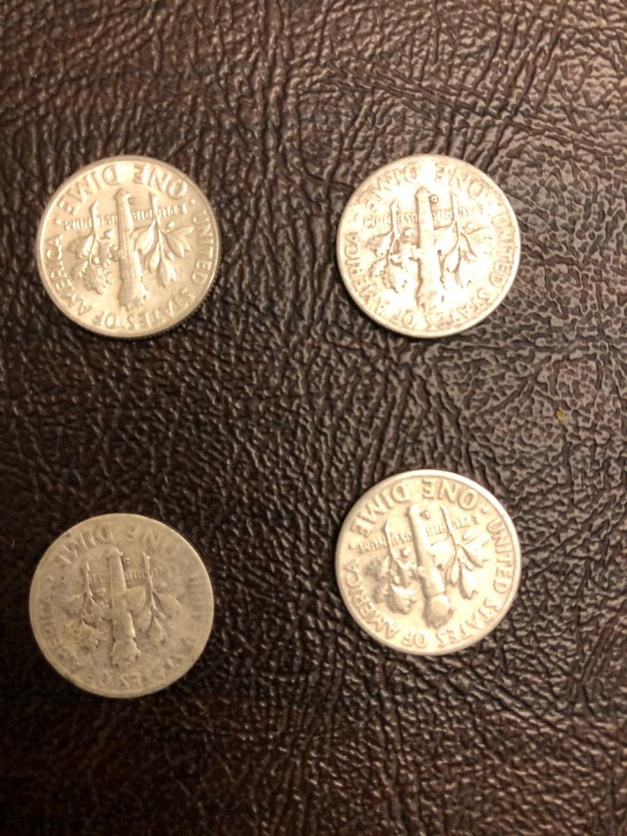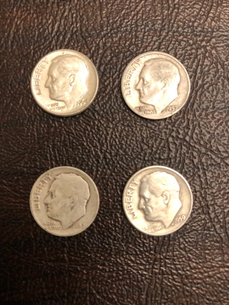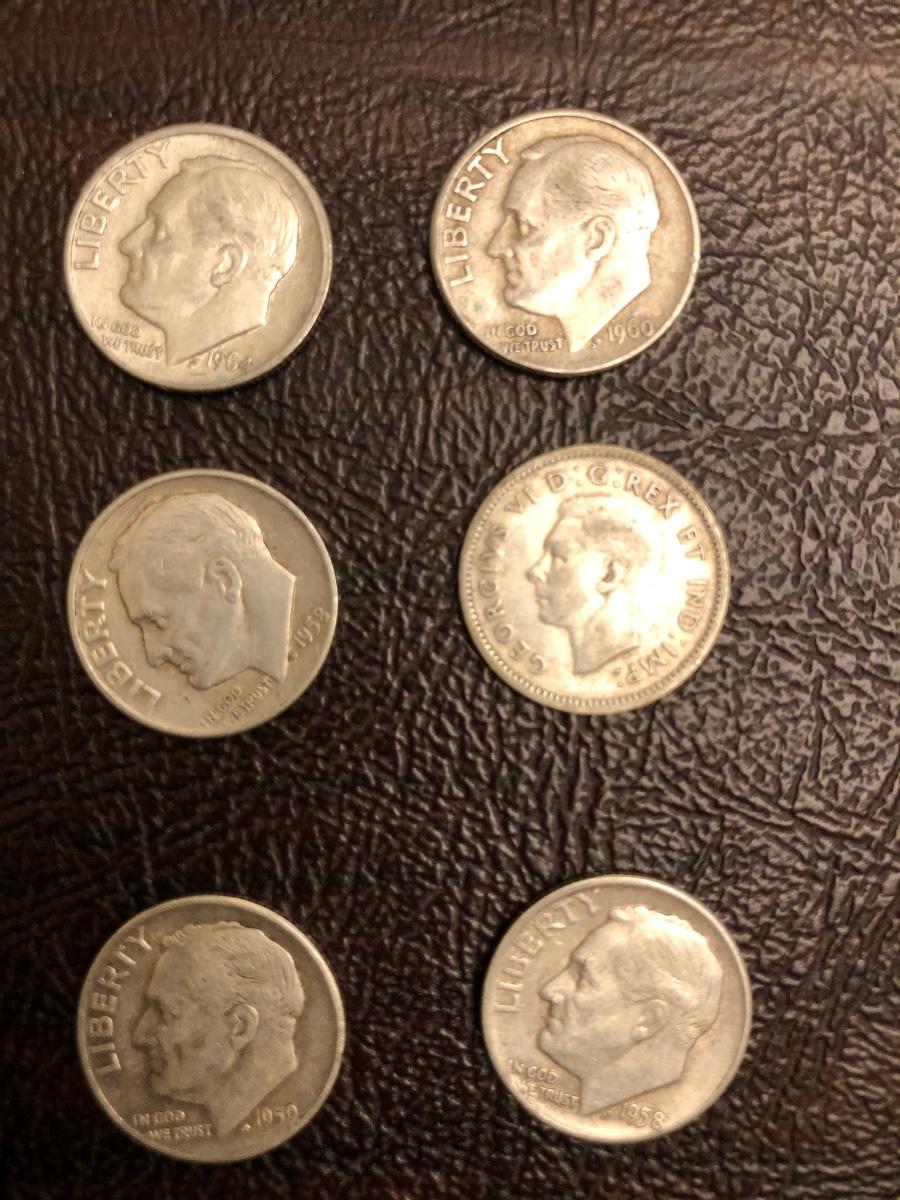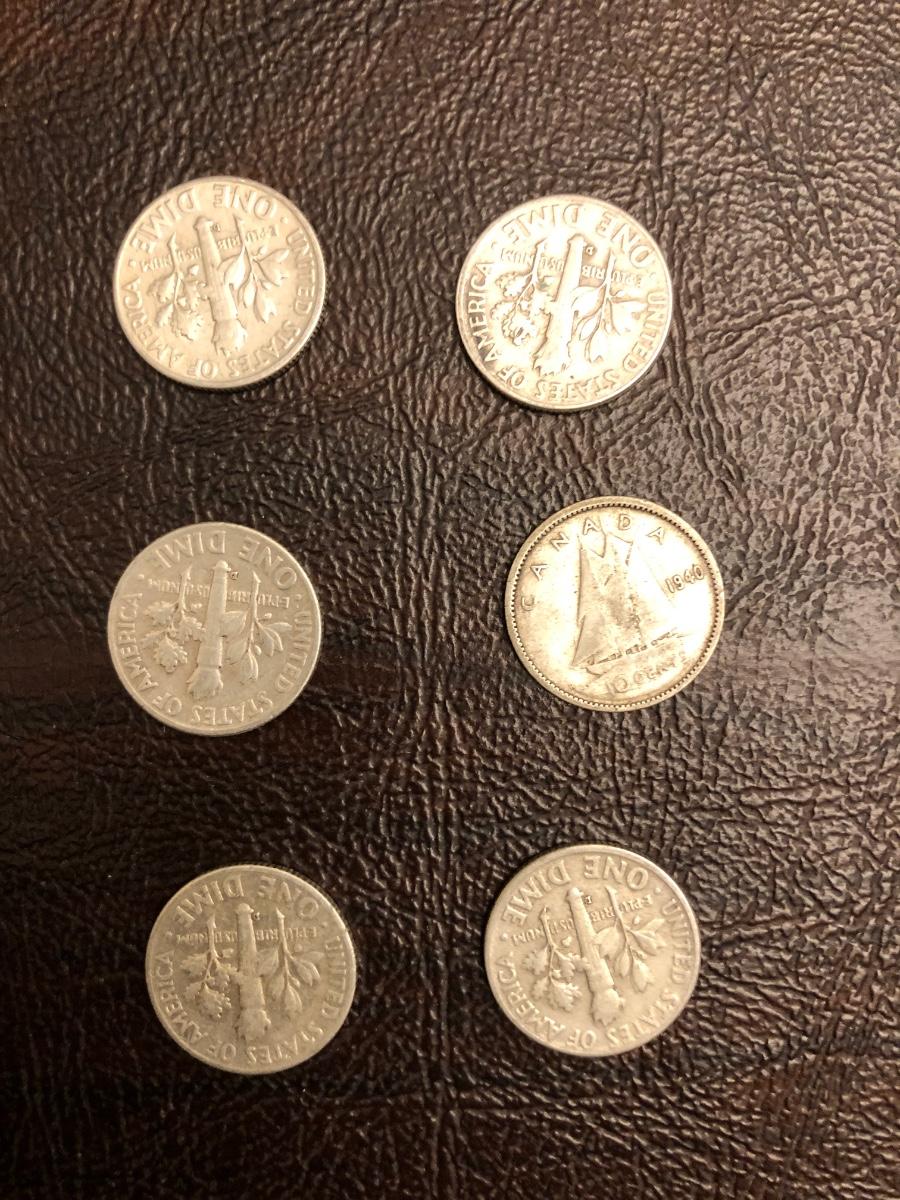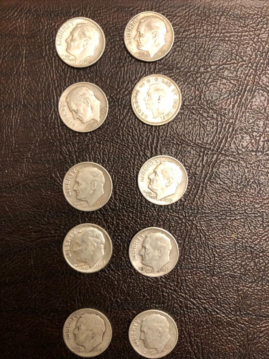 Nine Roosevelt dimes. One 1940 Canadian silver dime. See pictures.