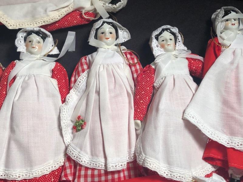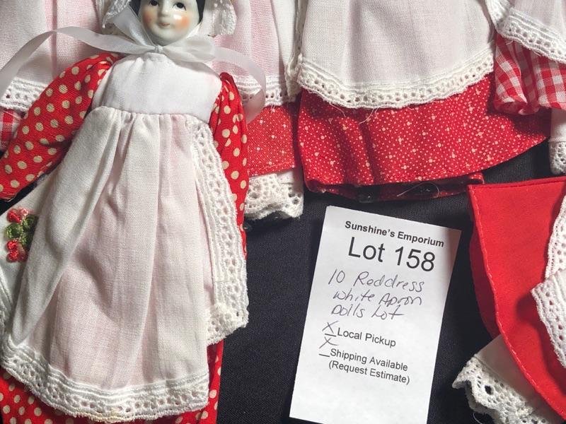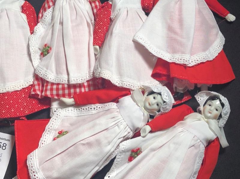 10 Super Rare Brand Vintage Small Porcelain Dolls - Made in Taiwan Republic of China Labels - 7.5" Tall - Red Dresses with white aprons - Lot 158