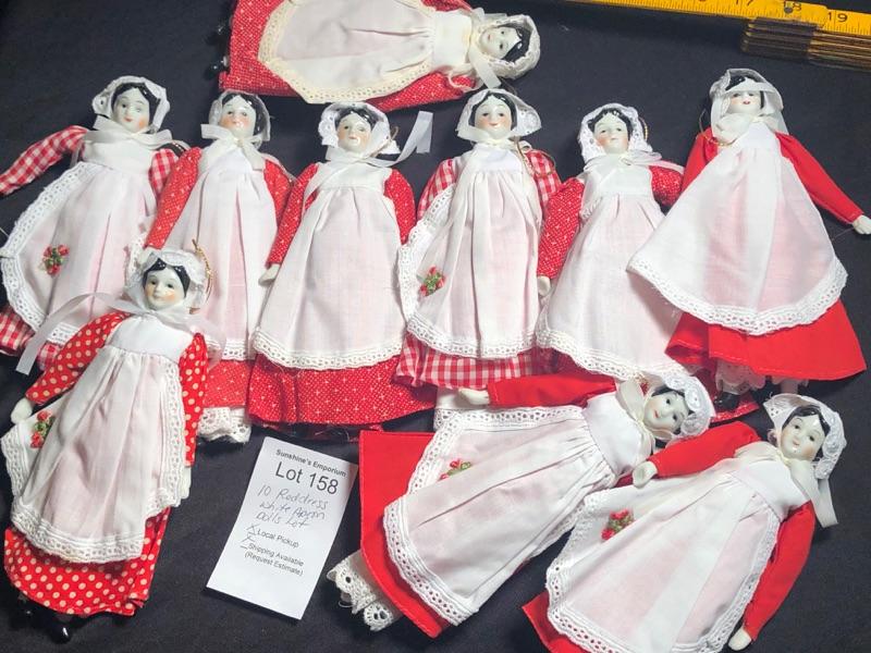 10 Super Rare Brand Vintage Small Porcelain Dolls 7.5" Red Dresses, white aprons