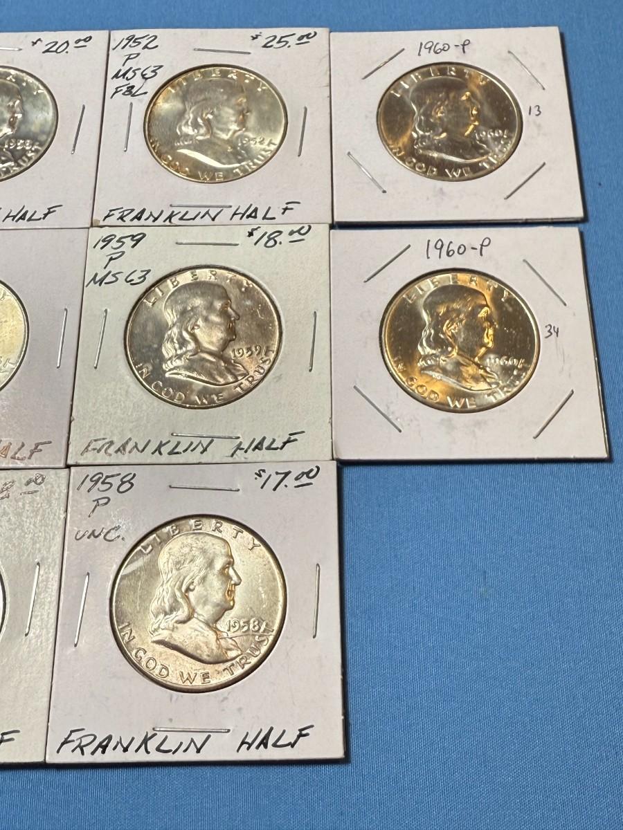 (10) UNCIRCULATED CONDITION FRANKLIN SILVER HALF DOLLARS BAG #15 RECEIVE ALL AS PICTURED. $6 DOMESTIC SHIPPING.