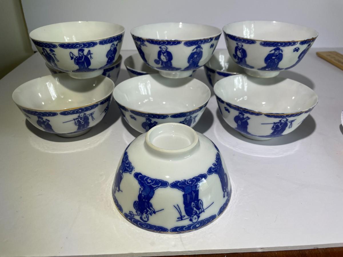 10 Vintage/Antique Chinese Immortal Blue/White Porcelain Rice Bowls 4" Diameter in Good Preowned Condition.
