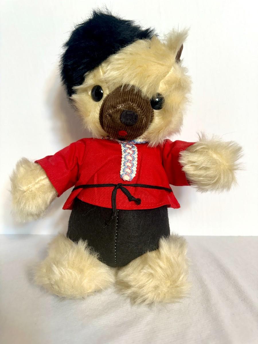 Russian dressed German teddy bear. This unique fellow has a great Coleco themed outfit, corduroy face and mohair fur. Beautiful collector's item.