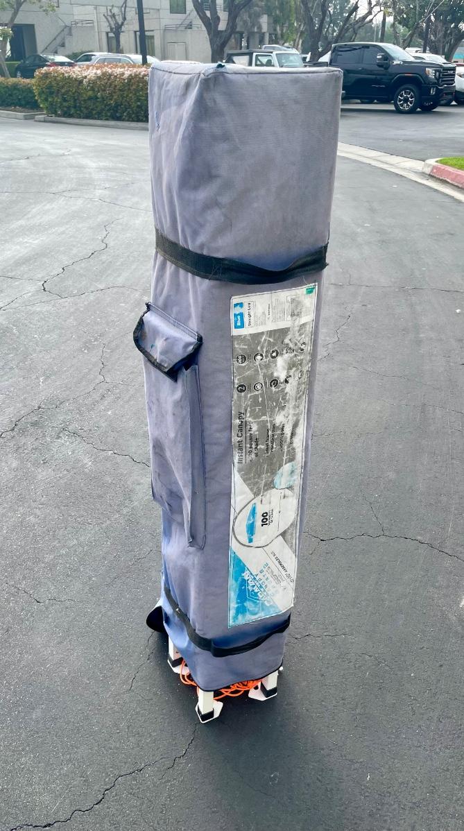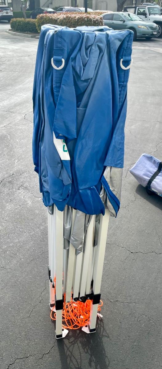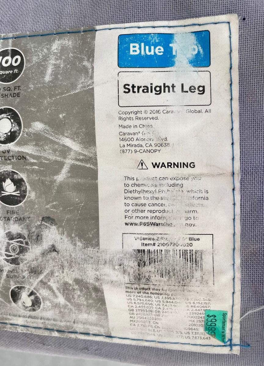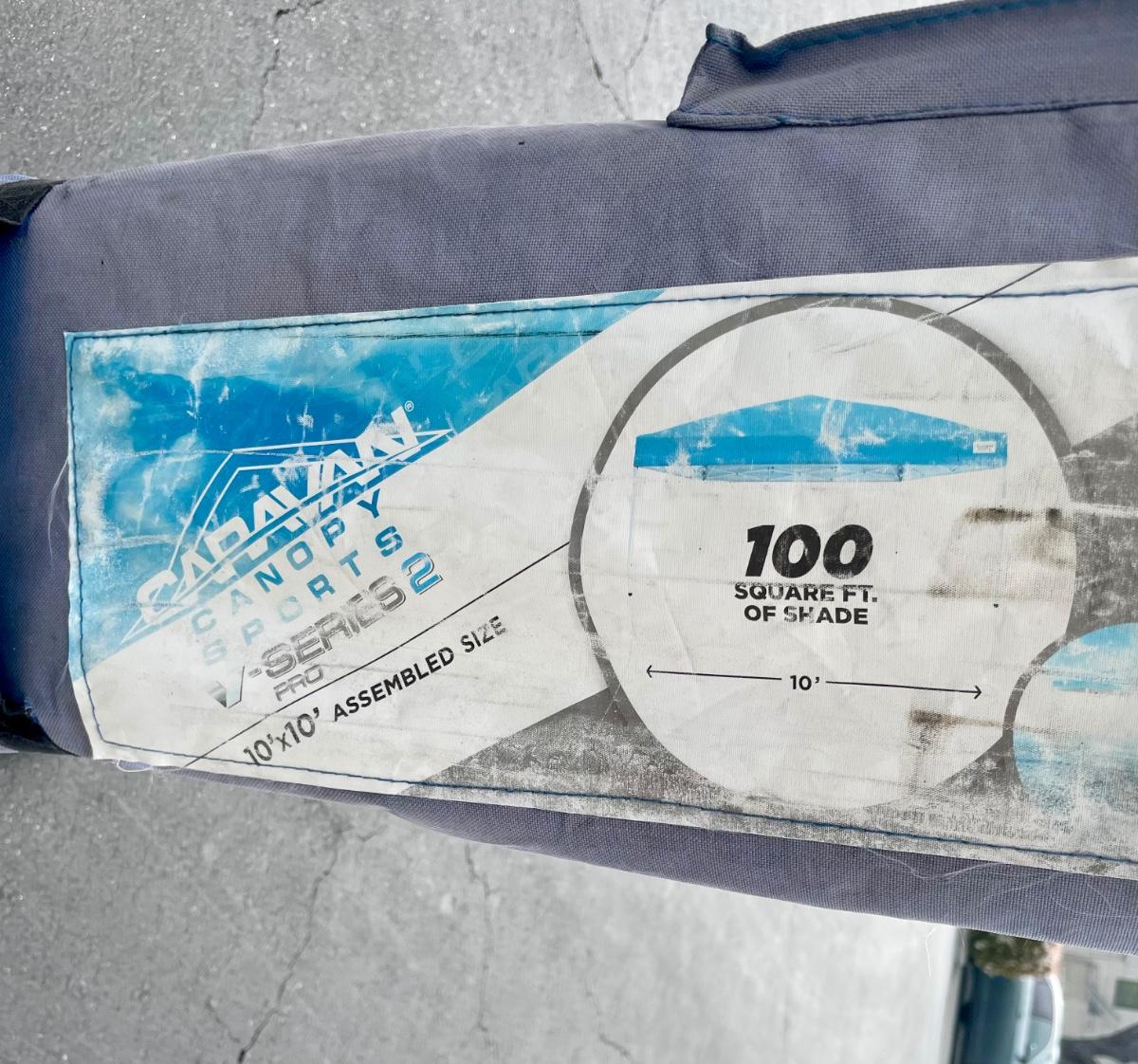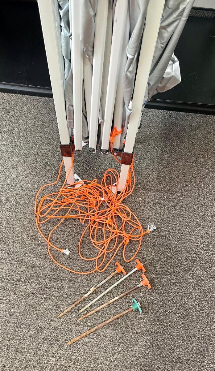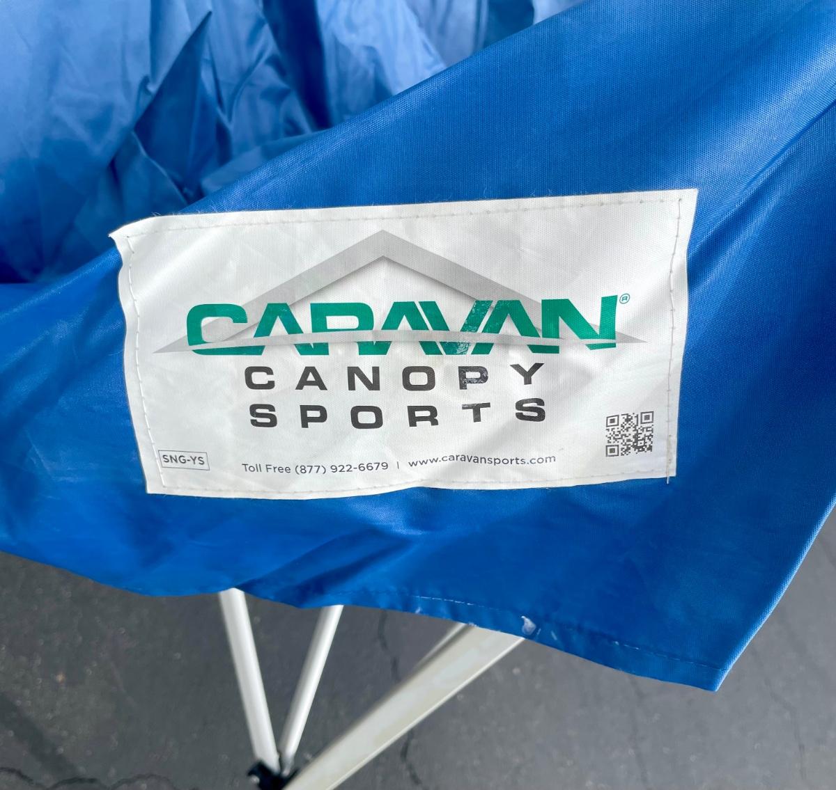Rrrrr. Made by Caravan. Used, but in good condition. Has original storage bag, 4 steel ground stakes, and some orange nylon tie-down cord.