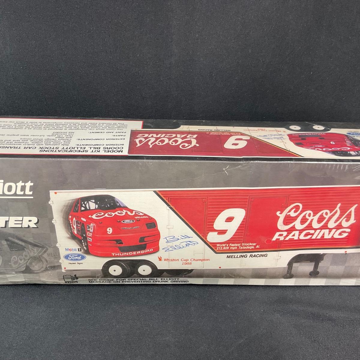 One sealed 1:25 scale Coors Bill Elliott stock car transporter. Please see photos for details and condition. Any condition statement is given as a courtesy to a client, is an opinion, and should not be treated as a statement of fact. Reference to condition written, oral or within a condition report shall not be regarded as a full account of condition and may not include all defects, alterations, or restorations. Absence of a condition report does not imply a lot is flawless or lacking imperfections or damage. Katherine’s Auction & Appraisal Service shall have no responsibility for any error or omission. Returns shall not be accepted on the basis of condition.