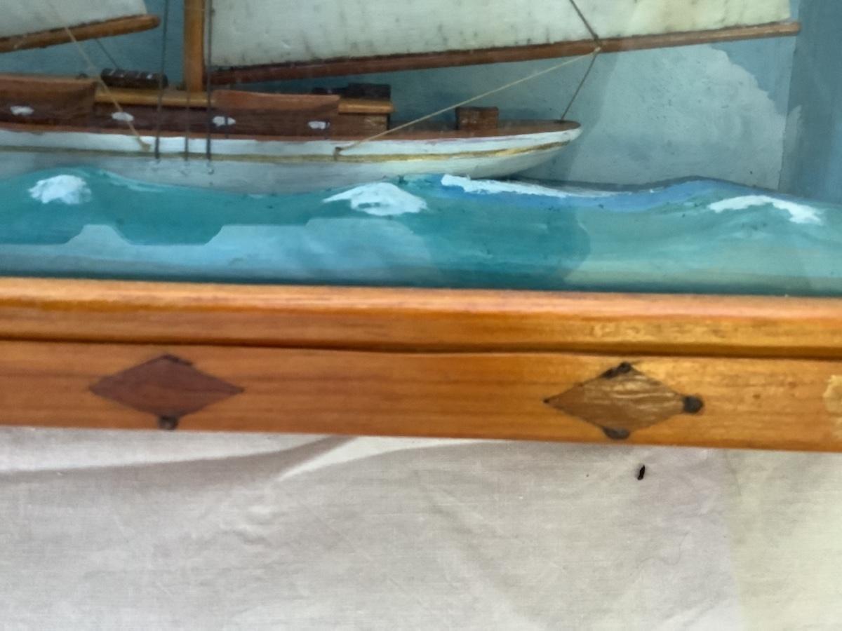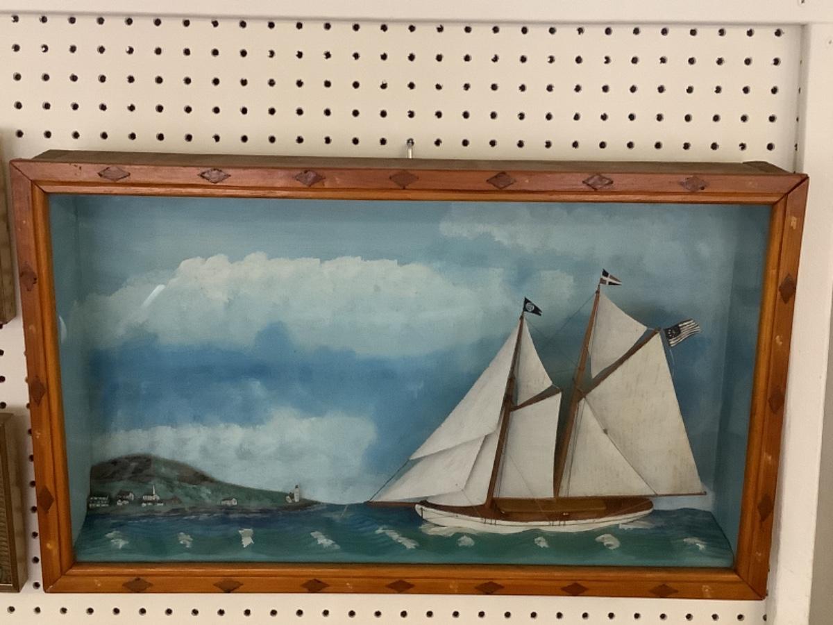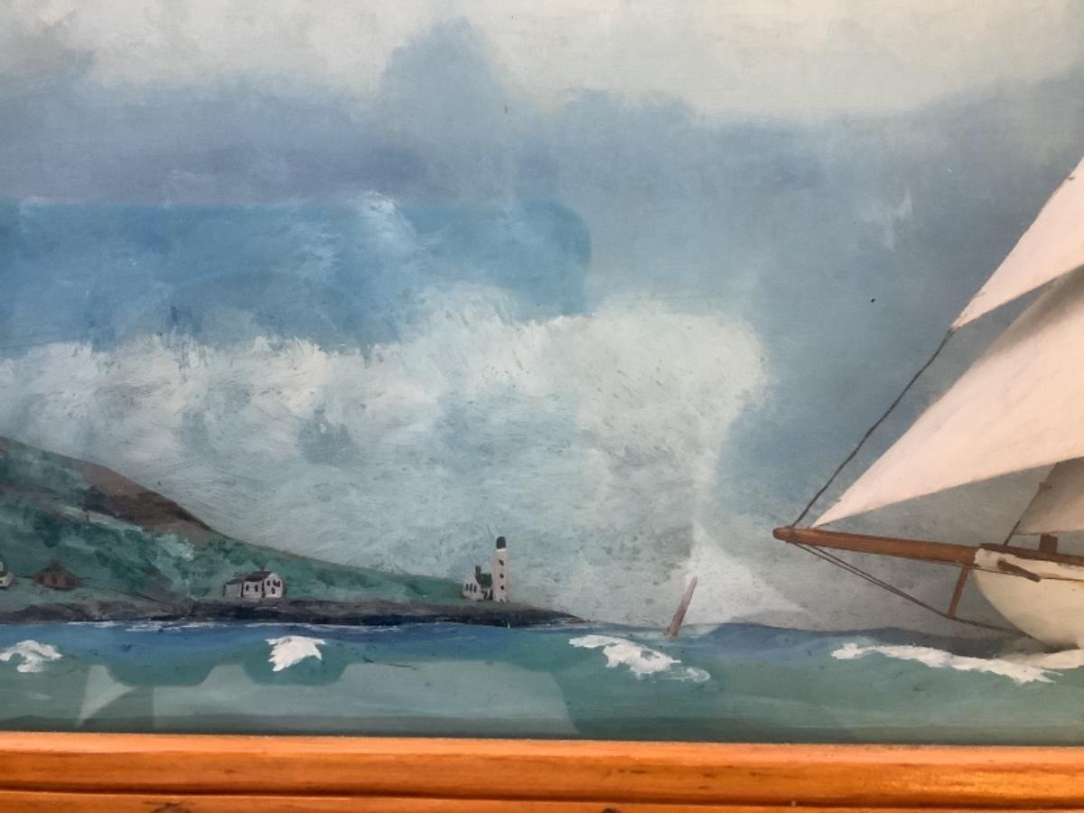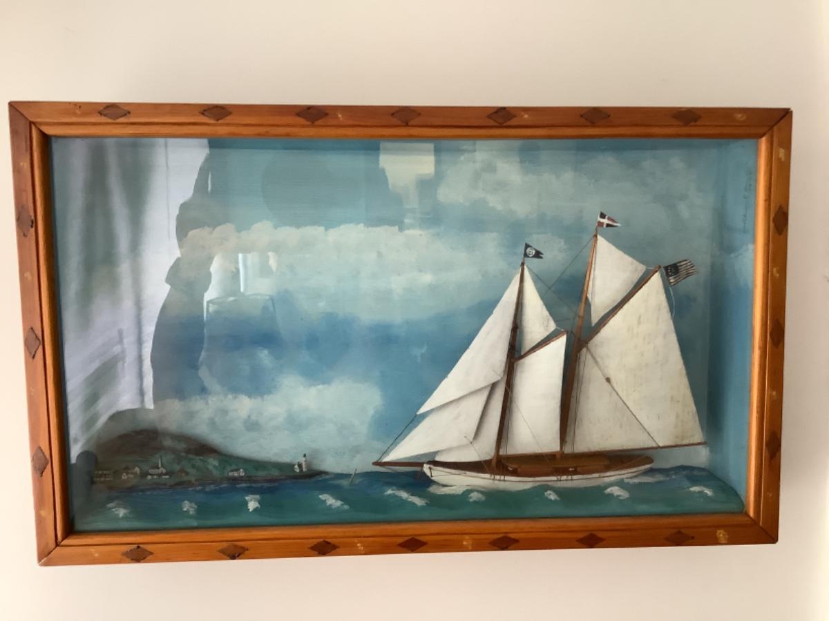 This beautiful Antique 1928 Folk Art Maritime Framed case diorama is a unique piece. The Case is custom made with glass front. Measures 24.75” wide x 15” high x 4” deep