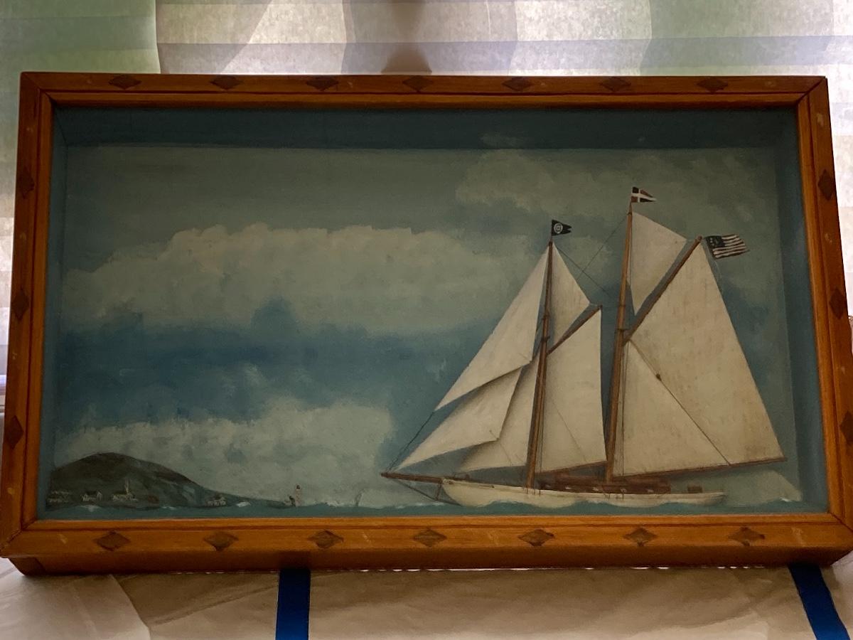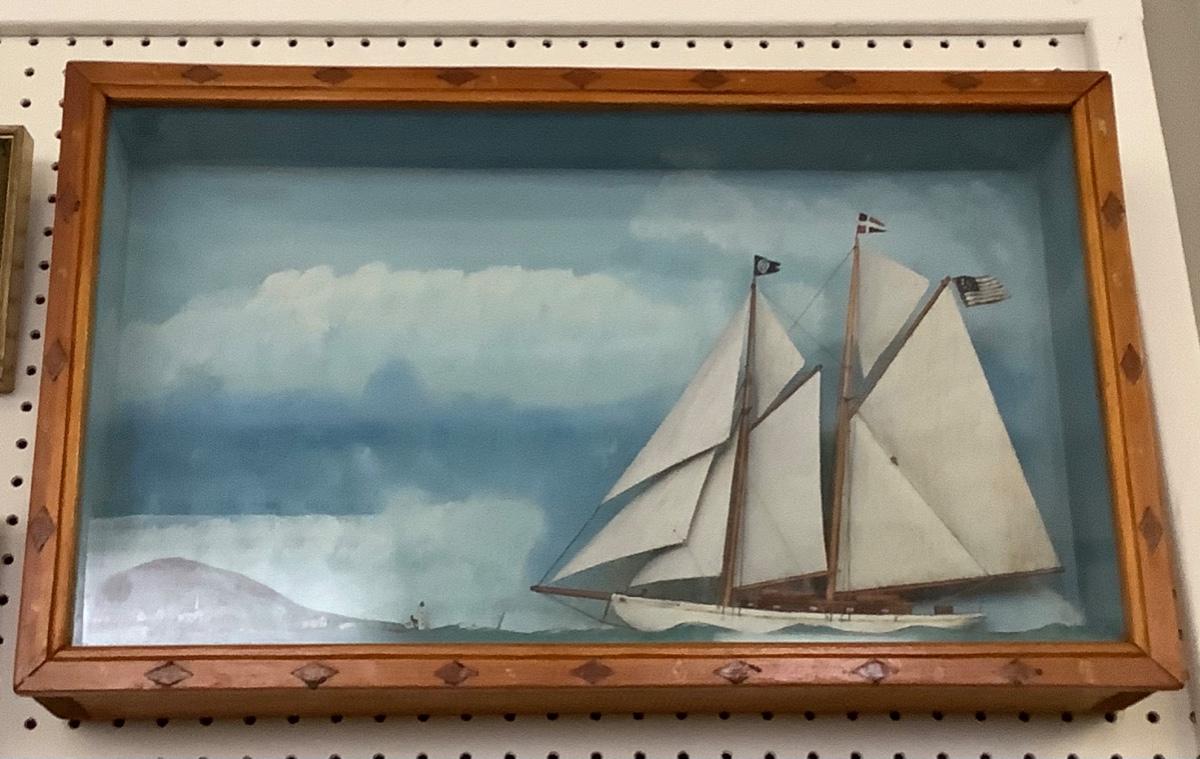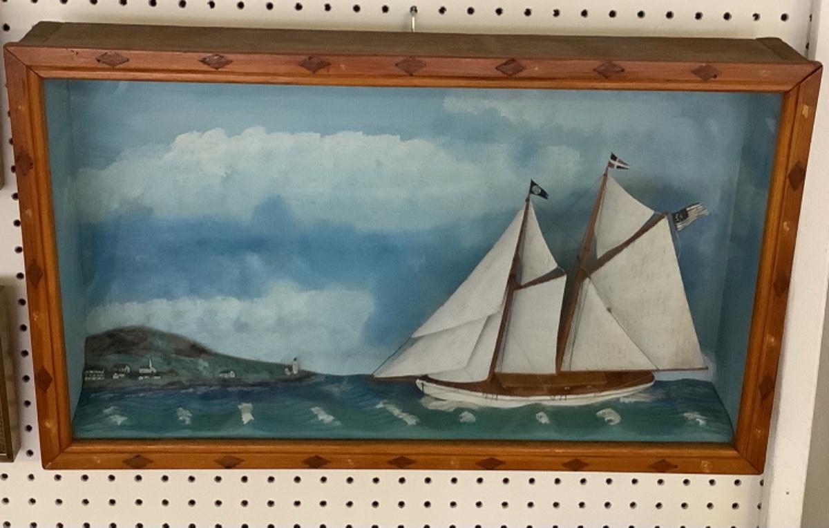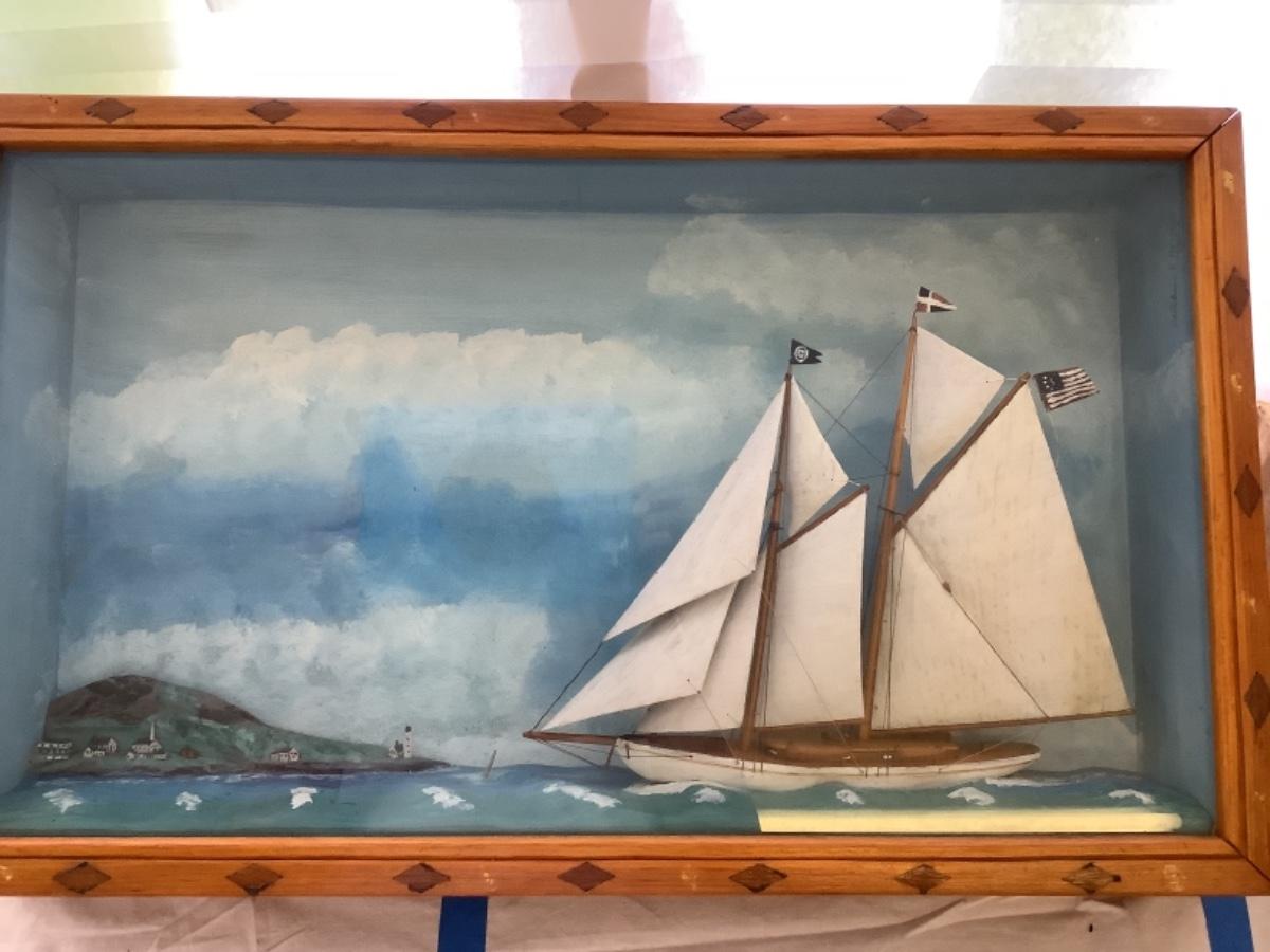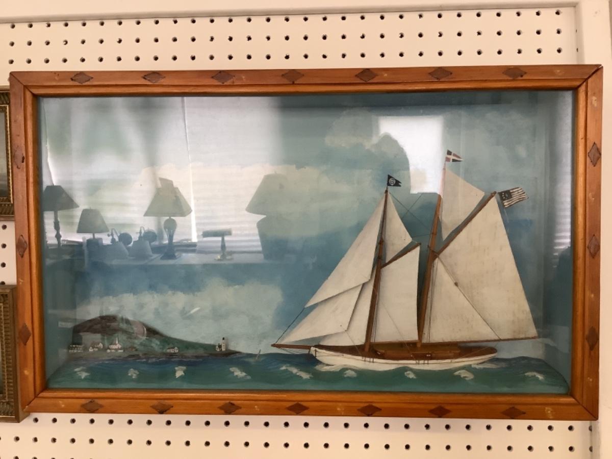 This beautiful Antique 1928 Folk Art Maritime Framed case diorama is a unique piece. The Case is custom made with glass front. Measures 24.75” wide x 15” high x 4” deep