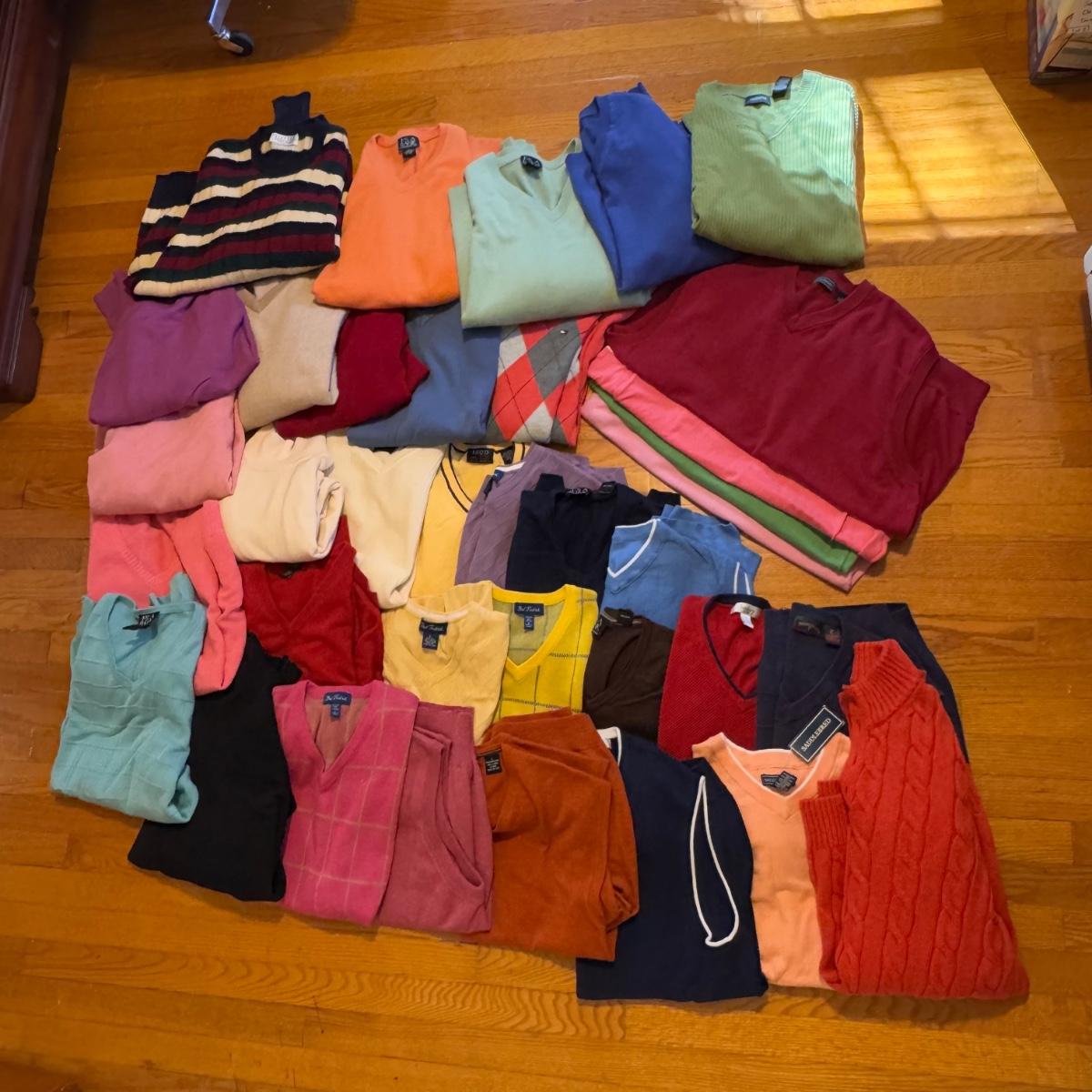 Lot includes six 100% cashmere sweaters, along with several other sweaters and vests. All items are either a men’s size medium or large. You’ll find the following brands: Jos. A. Bank, Lands’ End, Saddlebred, Tuttle, Austin Reed, and more. Shipping available.