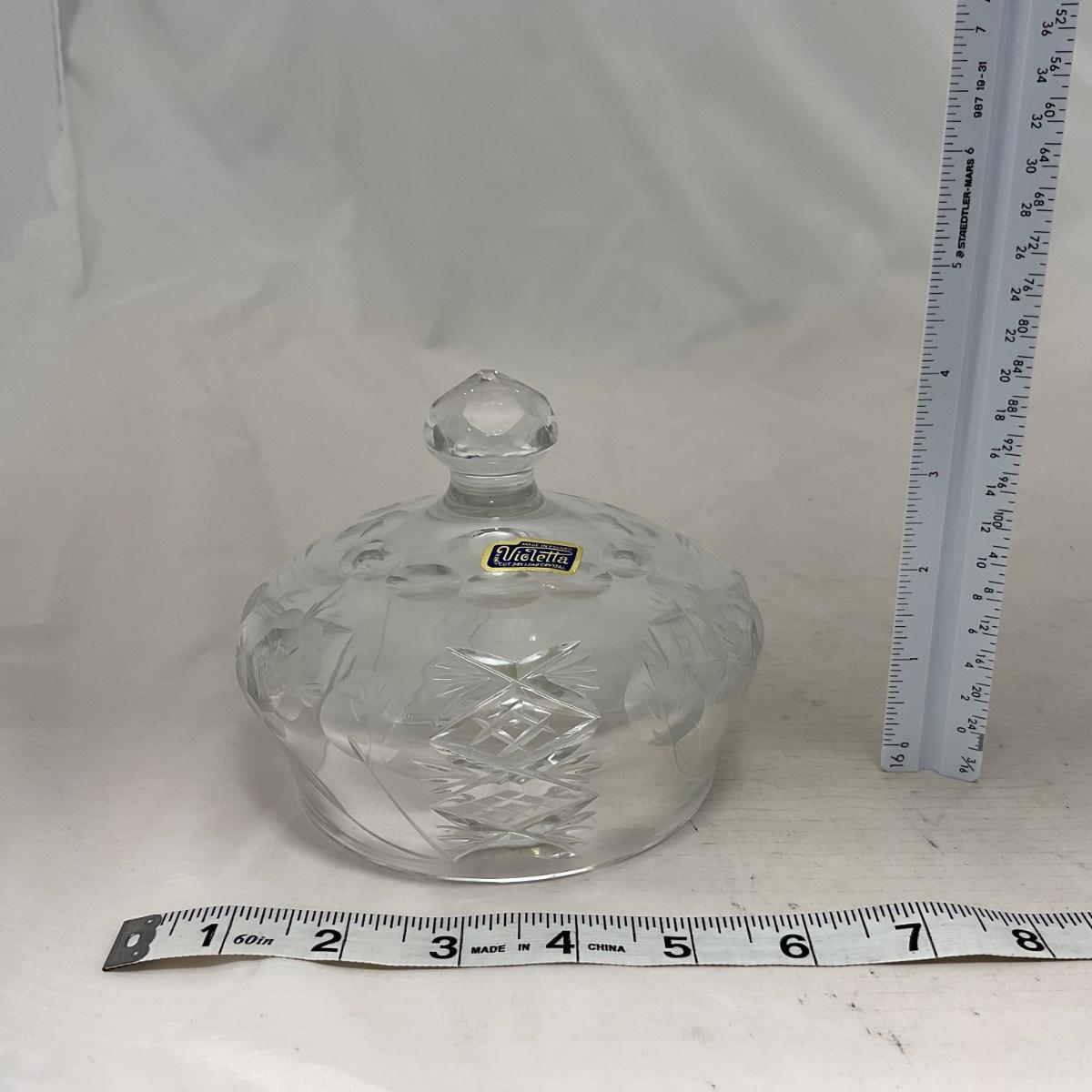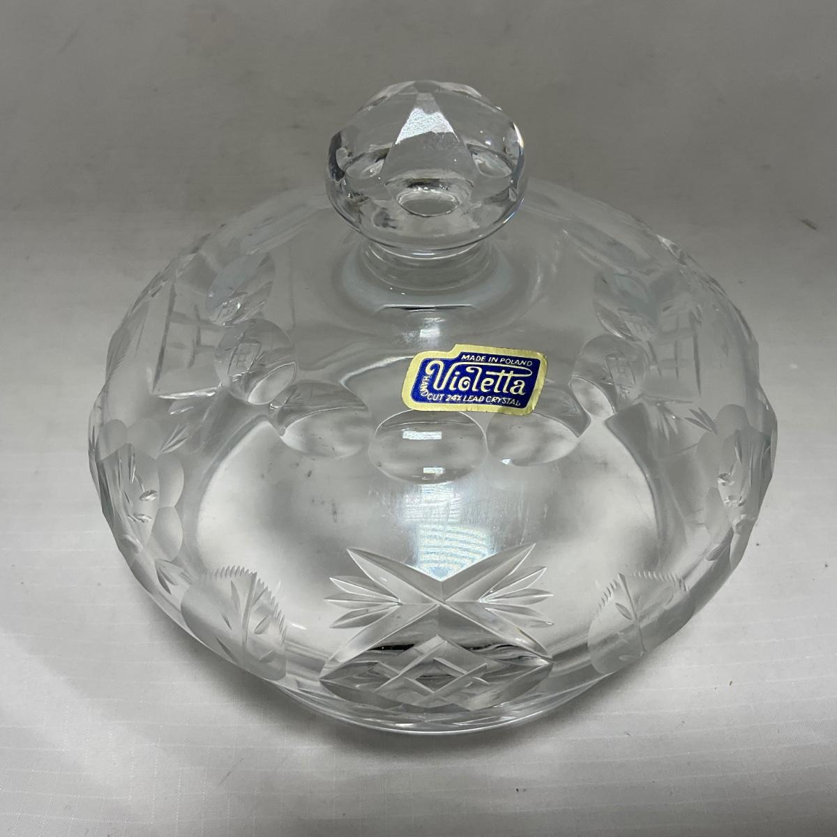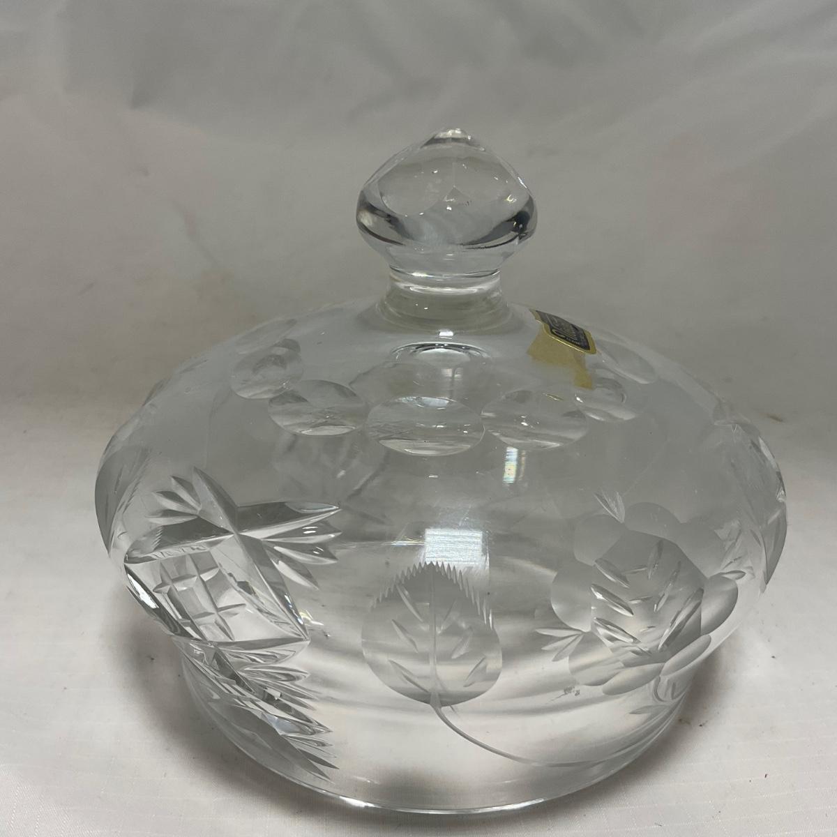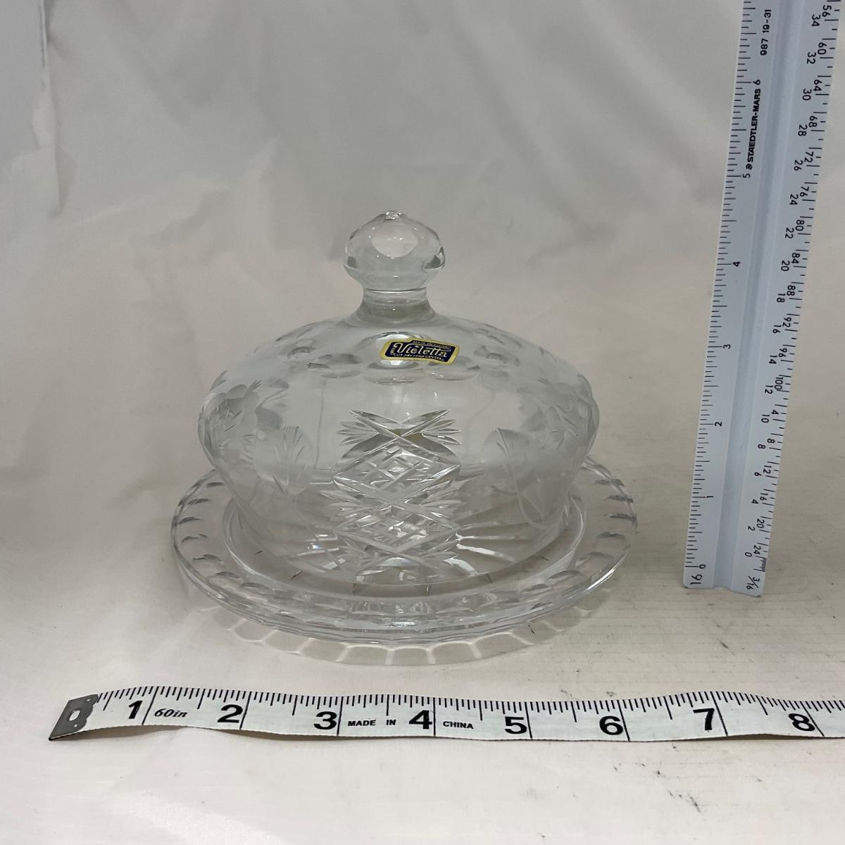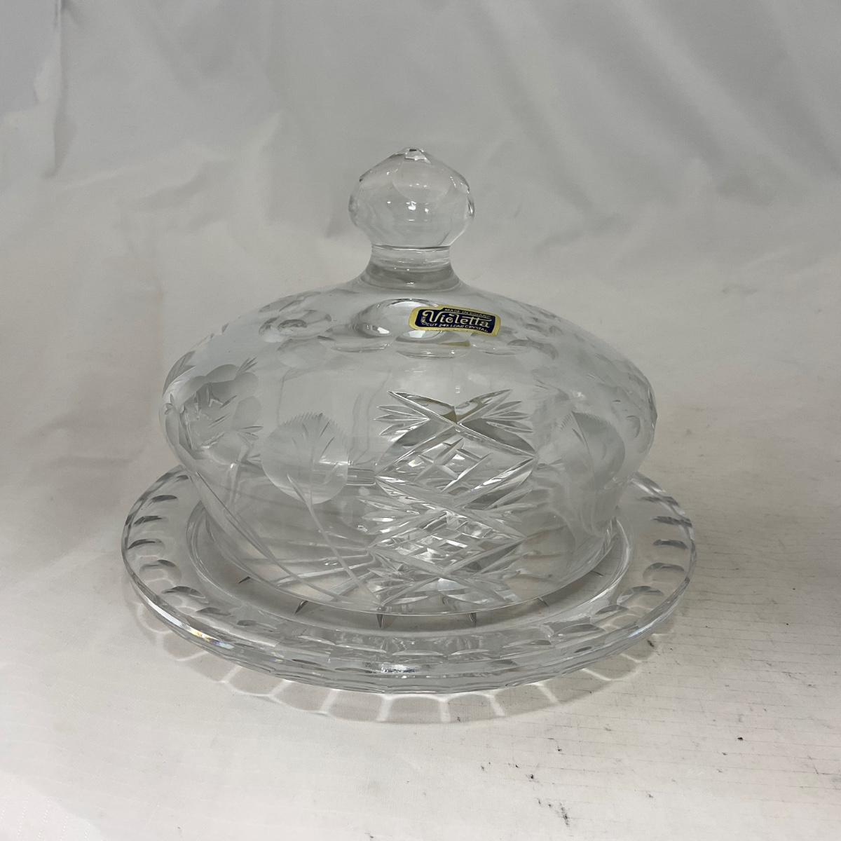One clear glass hand cut lead crystal covered butter dish. With beautiful bubbled top and classic looking finial. This piece does have its Poland sticker. Please see photos for details and condition. ::: Shipping is available on this lot. If you require shipping you must let us know at the close of the auction. We will coordinate with you after the item has been won. Shipping fees will include insurance up to or exceeding the value of all items being mailed. If you have any questions regarding this lot please contact the auctioneer either via this website, by direct email or by phone. PICK UP TIMES and other important information can be found in the TERMS and DESCRIPTION of the auction. Please take a look for pertinent information. Thanks!