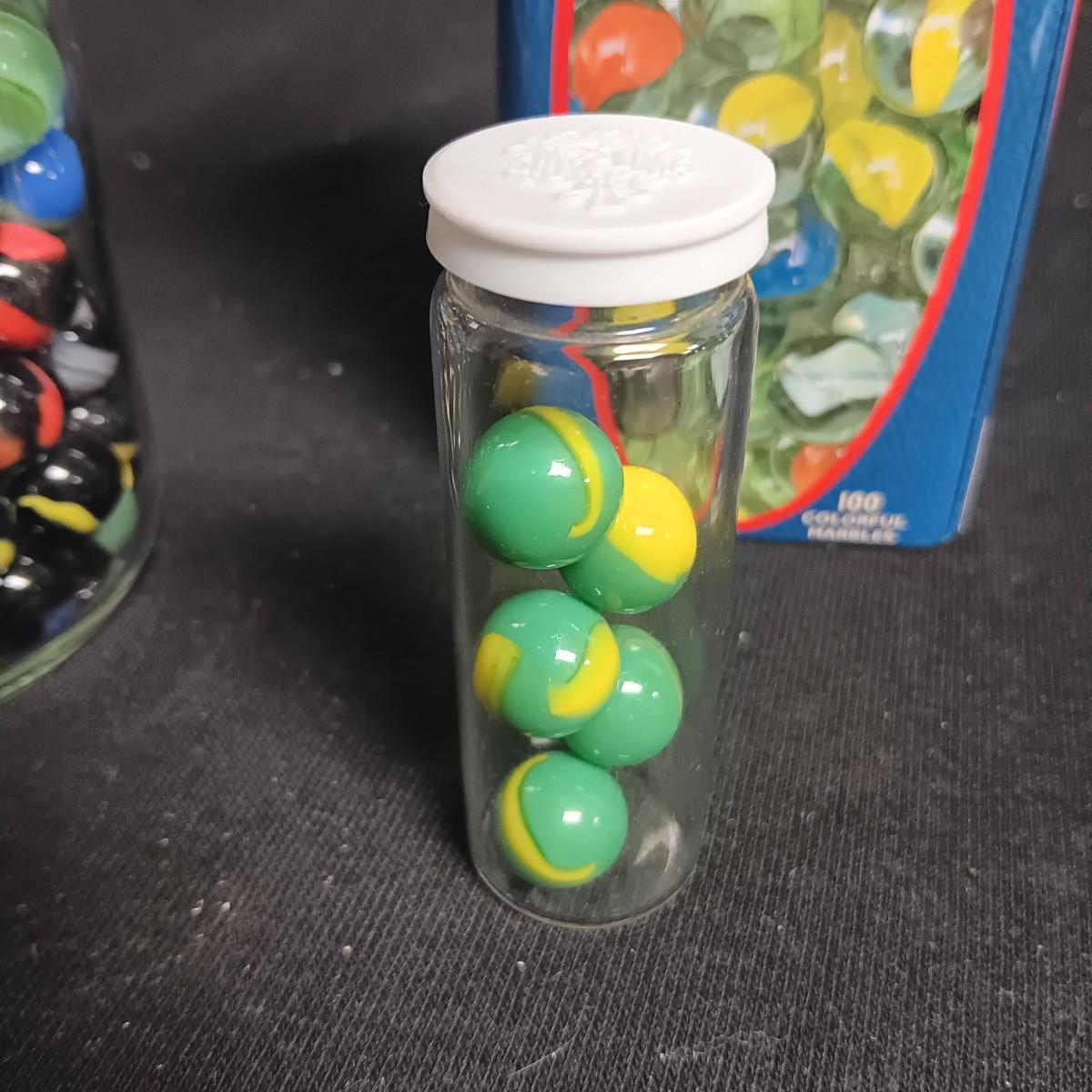 100 COLORFUL MARBLES IN A TIN AND A JAR OF MARBLES