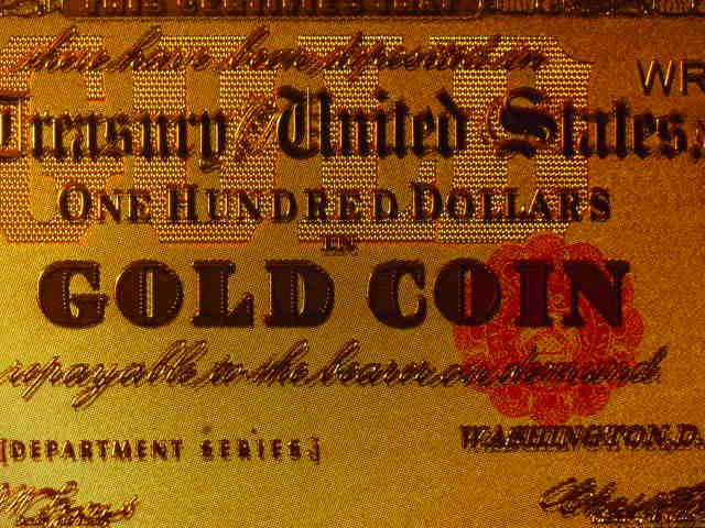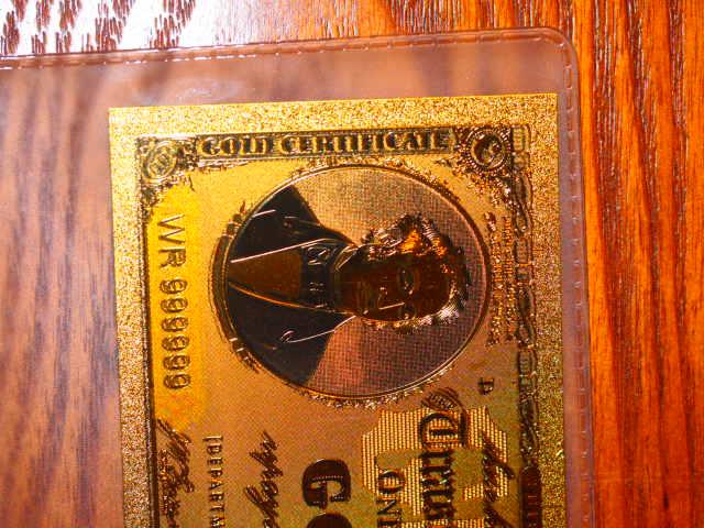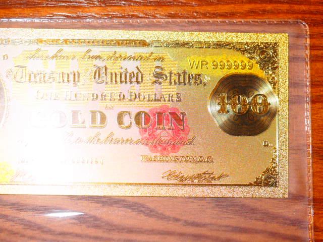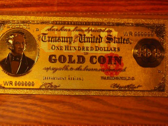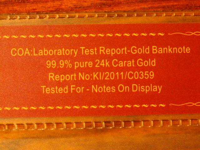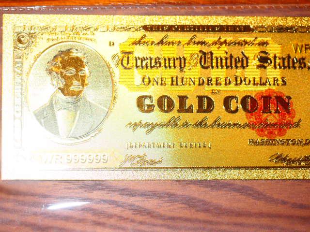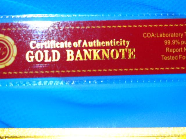 100 Dollar Gold Bank Note states it is Payable in Gold Coin With COA 99.9 pure 24k Carat Gold Registered Report # KV2011/C0359