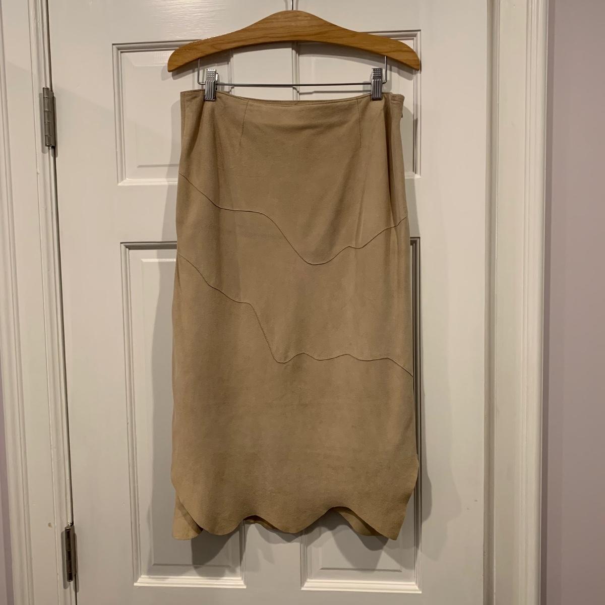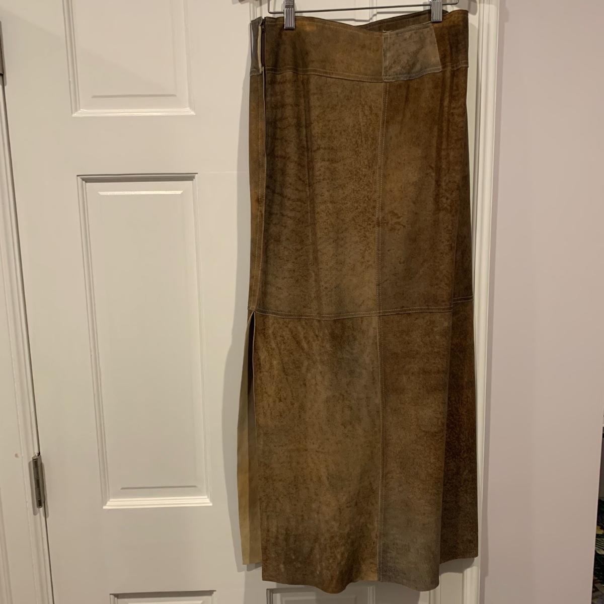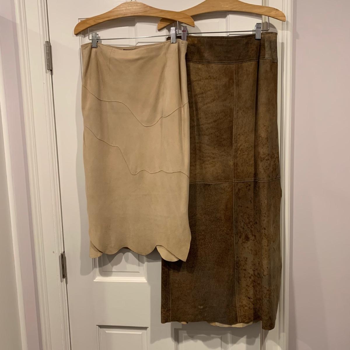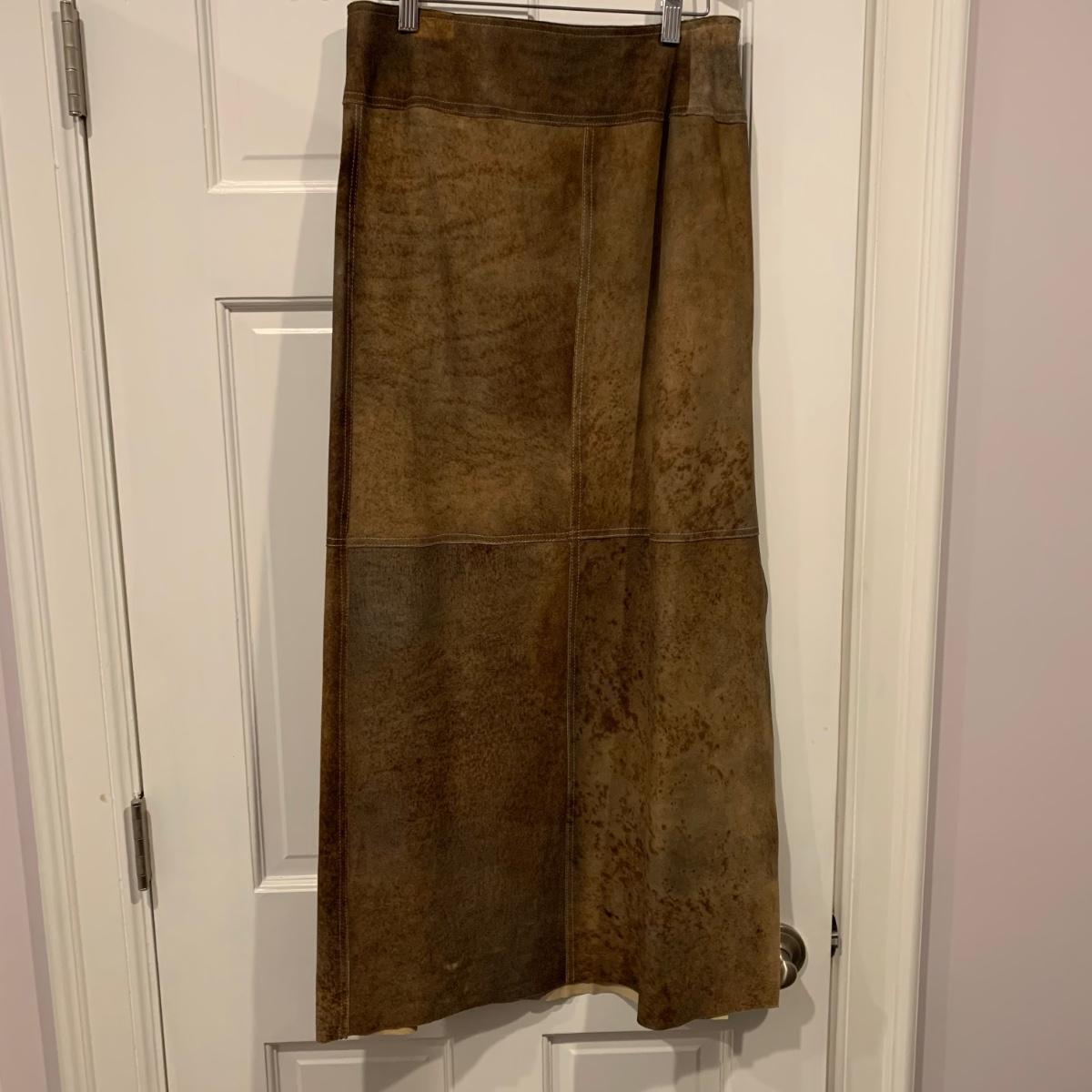Two beautiful 100% leather skirts, both size 8. The light tan suede skirt is by Elements by Vakko. It features a flattering asymmetrical hemline. It feels delicate and very soft. This skirt has a zipper on the side. It is about 28” long (calf-length) and has a synthetic lining. The darker mottled brown skirt is by The Peruvian Connection. It is ankle length at about 37” long. This skirt also feels very soft. It has a rayon lining and it features a side slit and a size zipper.
