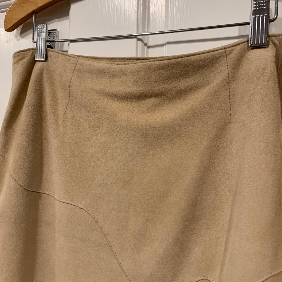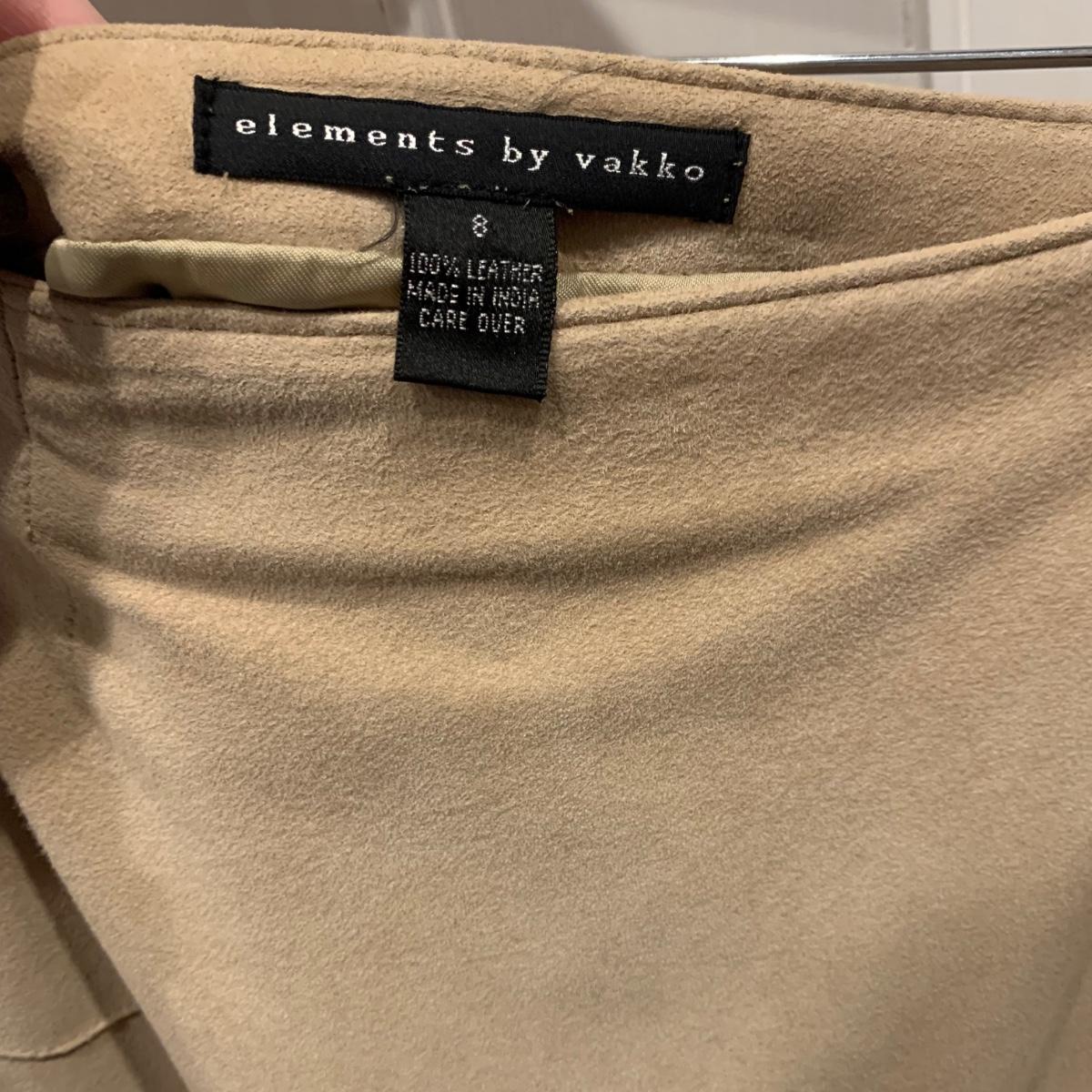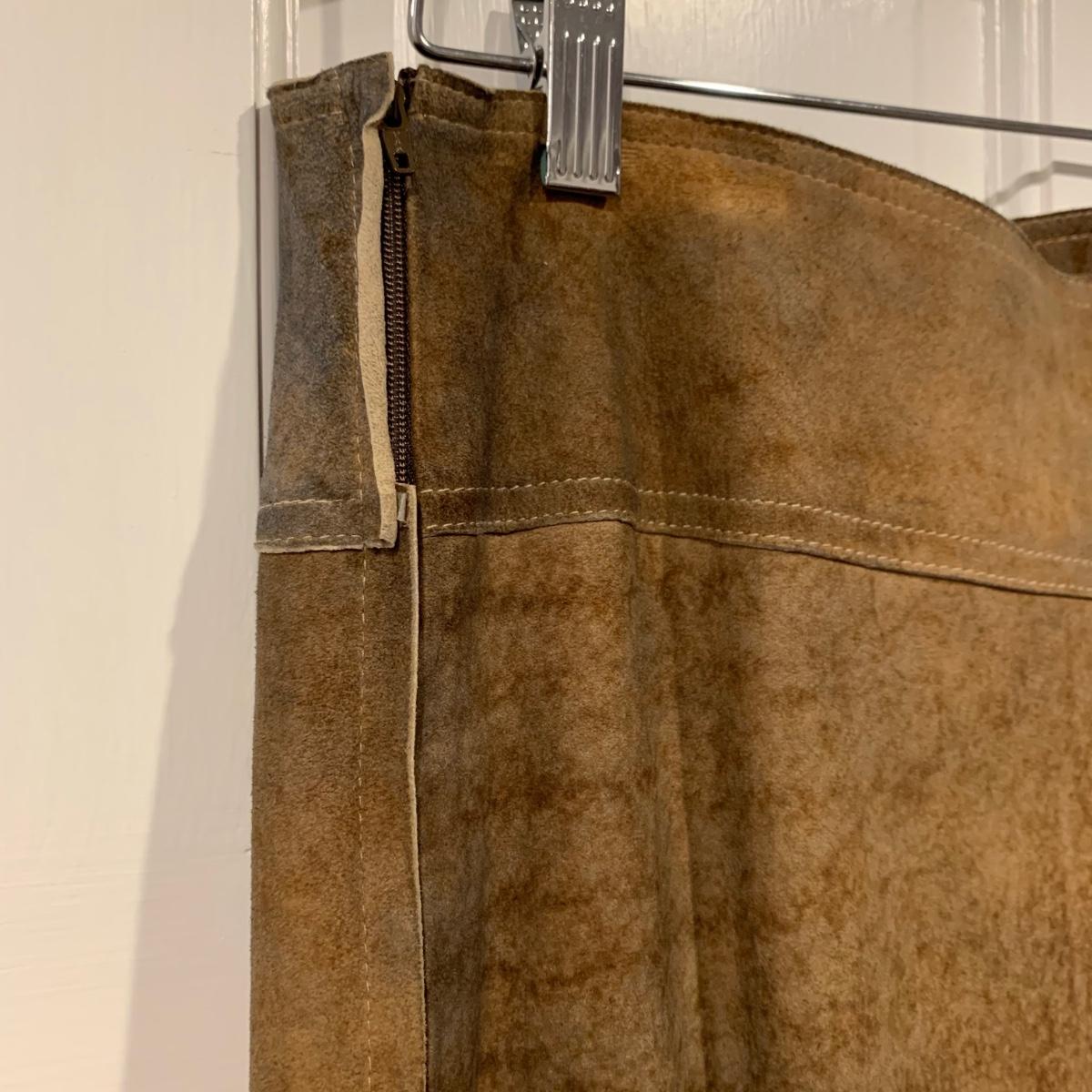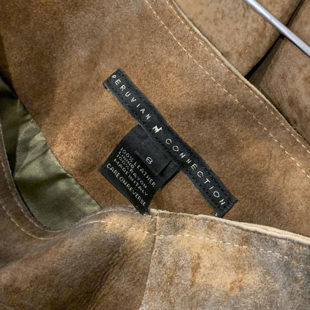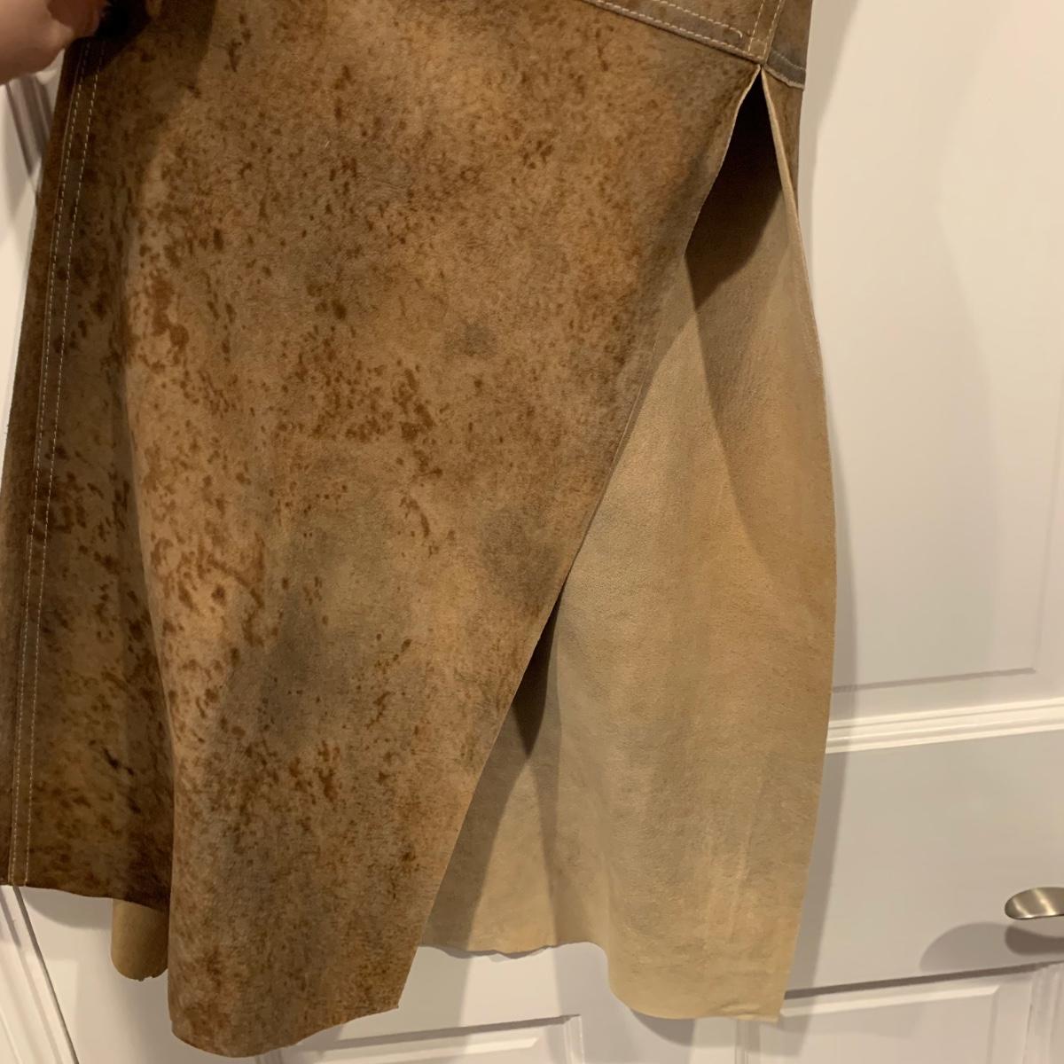 Two beautiful 100% leather skirts, both size 8. The light tan suede skirt is by Elements by Vakko. It features a flattering asymmetrical hemline. It feels delicate and very soft. This skirt has a zipper on the side. It is about 28” long (calf-length) and has a synthetic lining. The darker mottled brown skirt is by The Peruvian Connection. It is ankle length at about 37” long. This skirt also feels very soft. It has a rayon lining and it features a side slit and a size zipper.