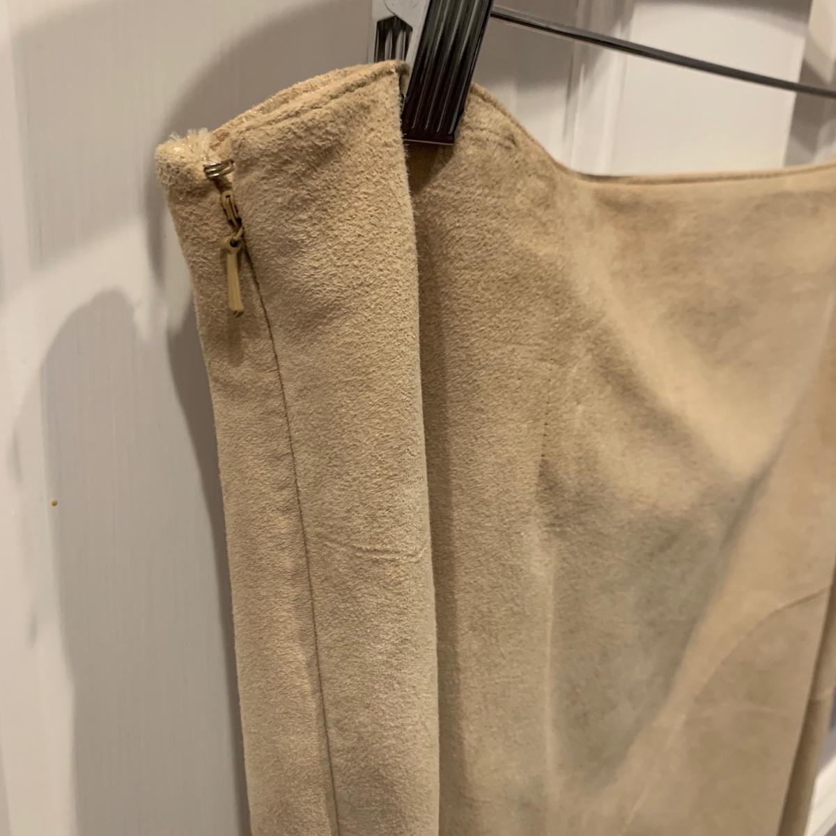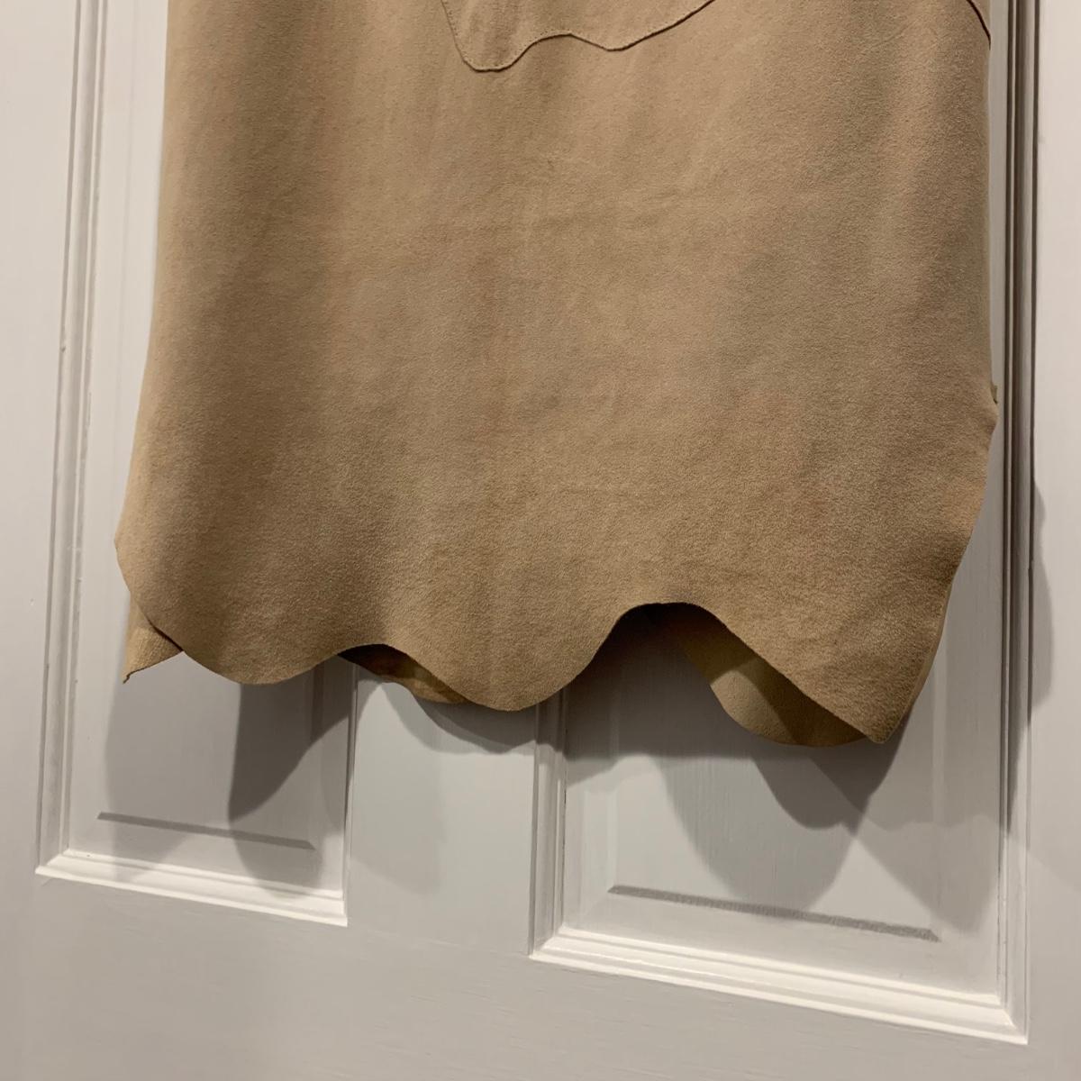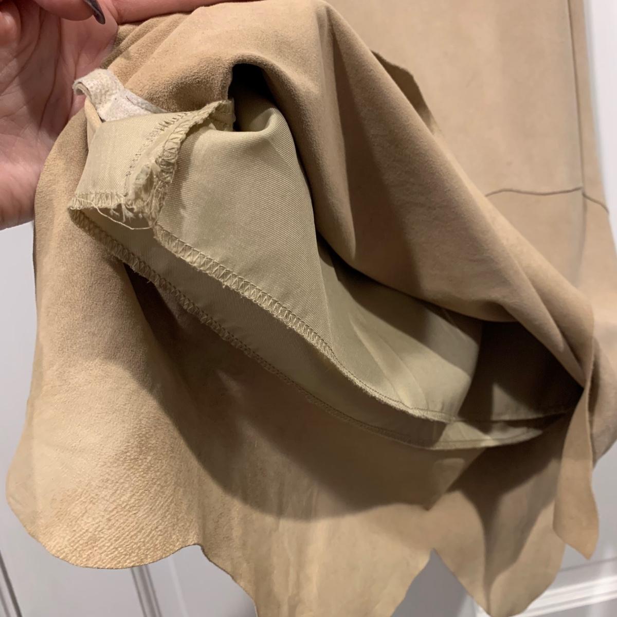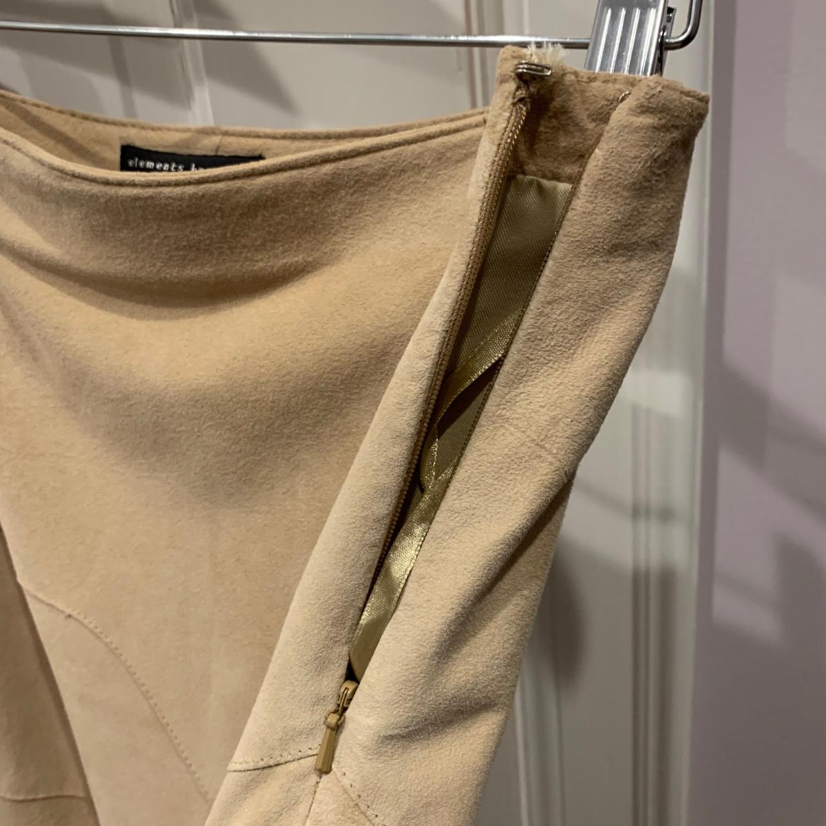Two beautiful 100% leather skirts, both size 8. The light tan suede skirt is by Elements by Vakko. It features a flattering asymmetrical hemline. It feels delicate and very soft. This skirt has a zipper on the side. It is about 28” long (calf-length) and has a synthetic lining. The darker mottled brown skirt is by The Peruvian Connection. It is ankle length at about 37” long. This skirt also feels very soft. It has a rayon lining and it features a side slit and a size zipper.