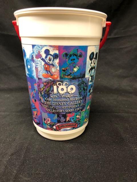 One Hundred Mickeys Collectors Bucket. From the Disney Gallery 2002, #3 of 6. Thick wall plastic with a handle, about 8" tall.