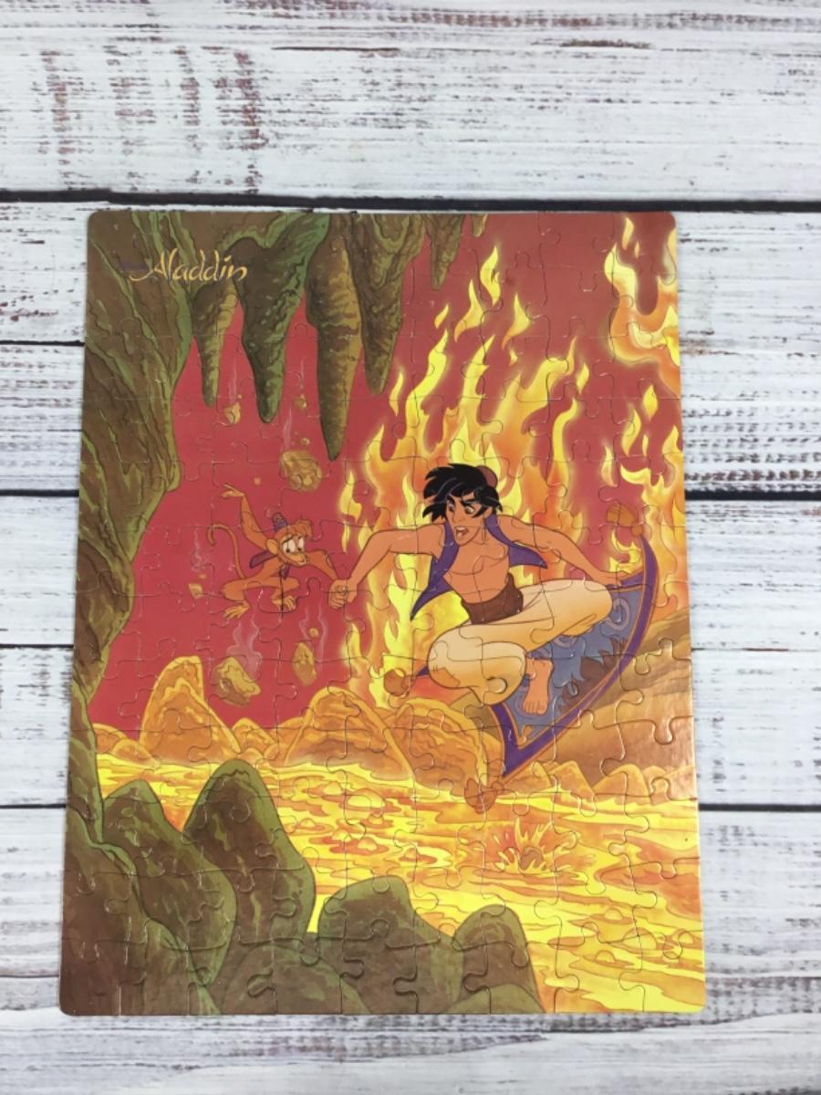 No pieces are missing. Some of the puzzle pieces are a little bent. Aladdin box is a little ripped but the pieces of the puzzle stay in there just fine.
