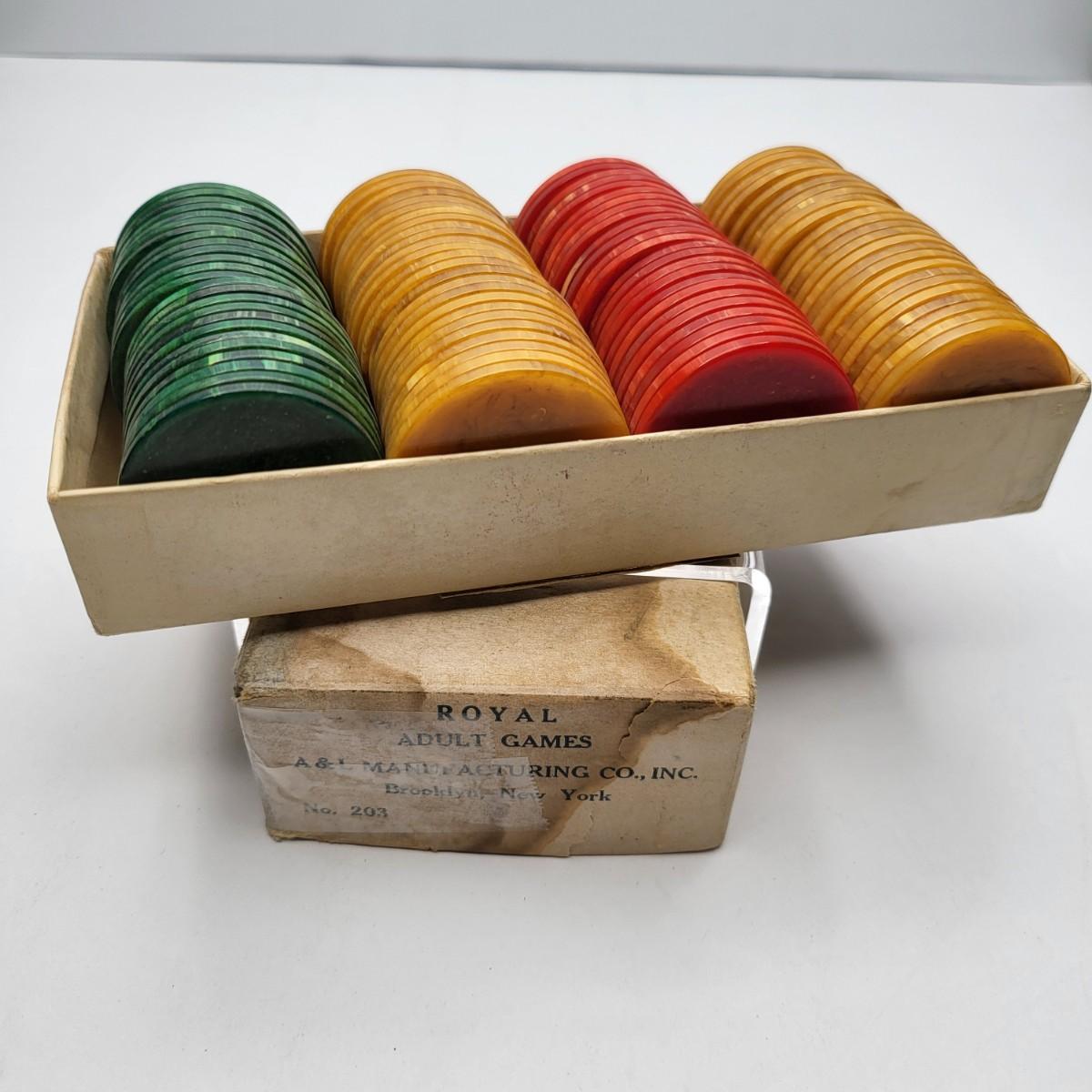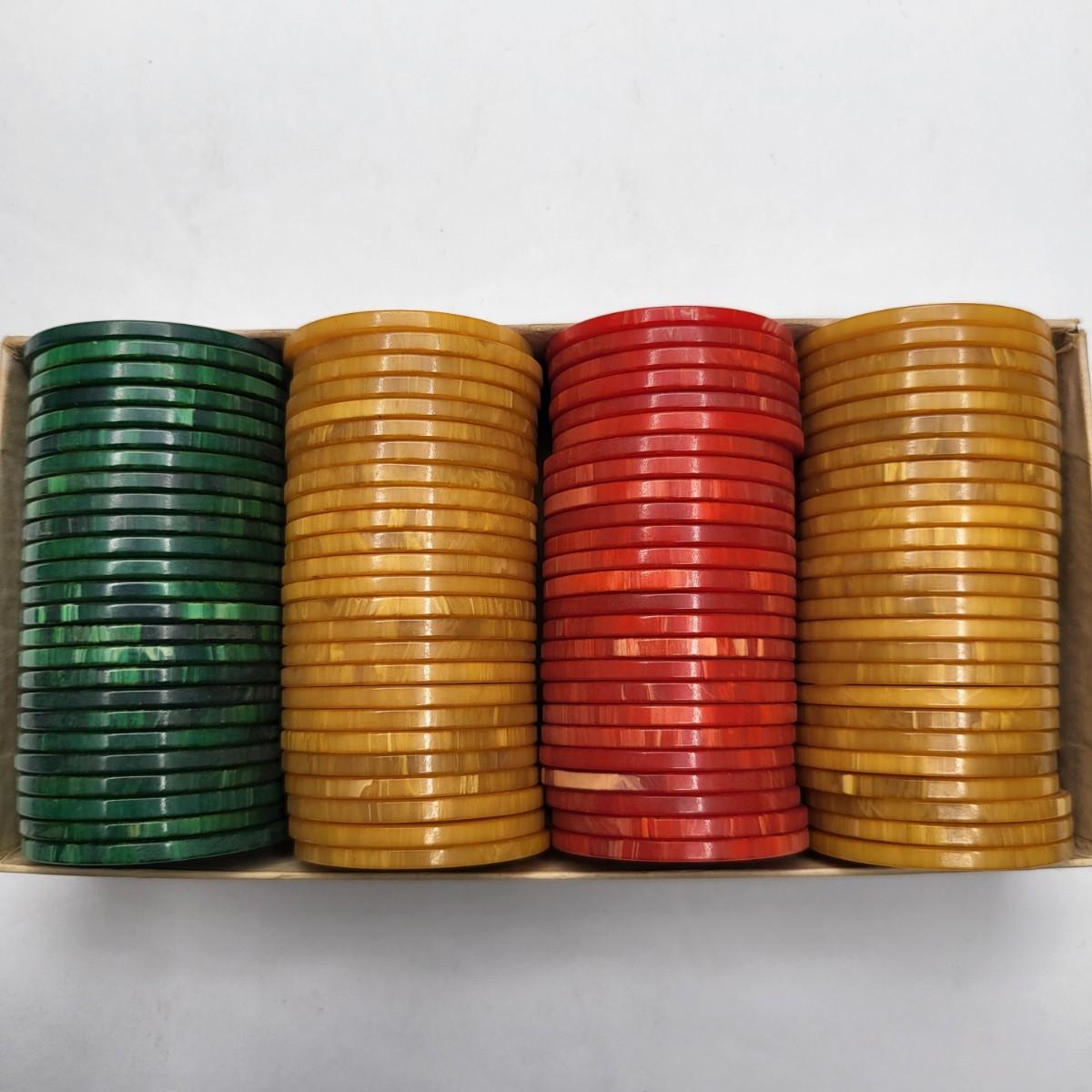 Bakelite poker chips (50) butterscotch, (25) red & (25) green. Each bakelite chip has unique swirling and coloring. Full boxed set of 100 chips. Appears to have some damage to original box.