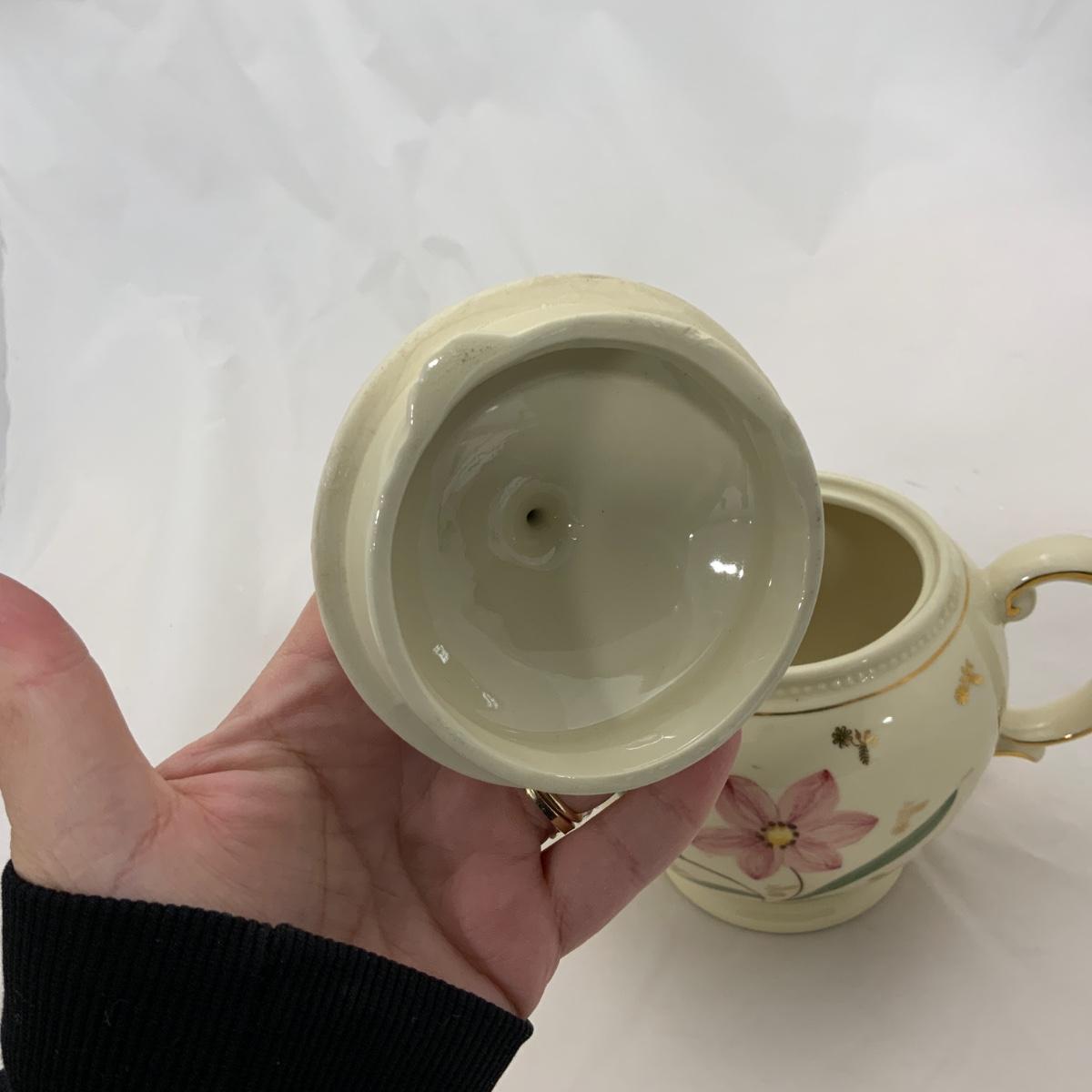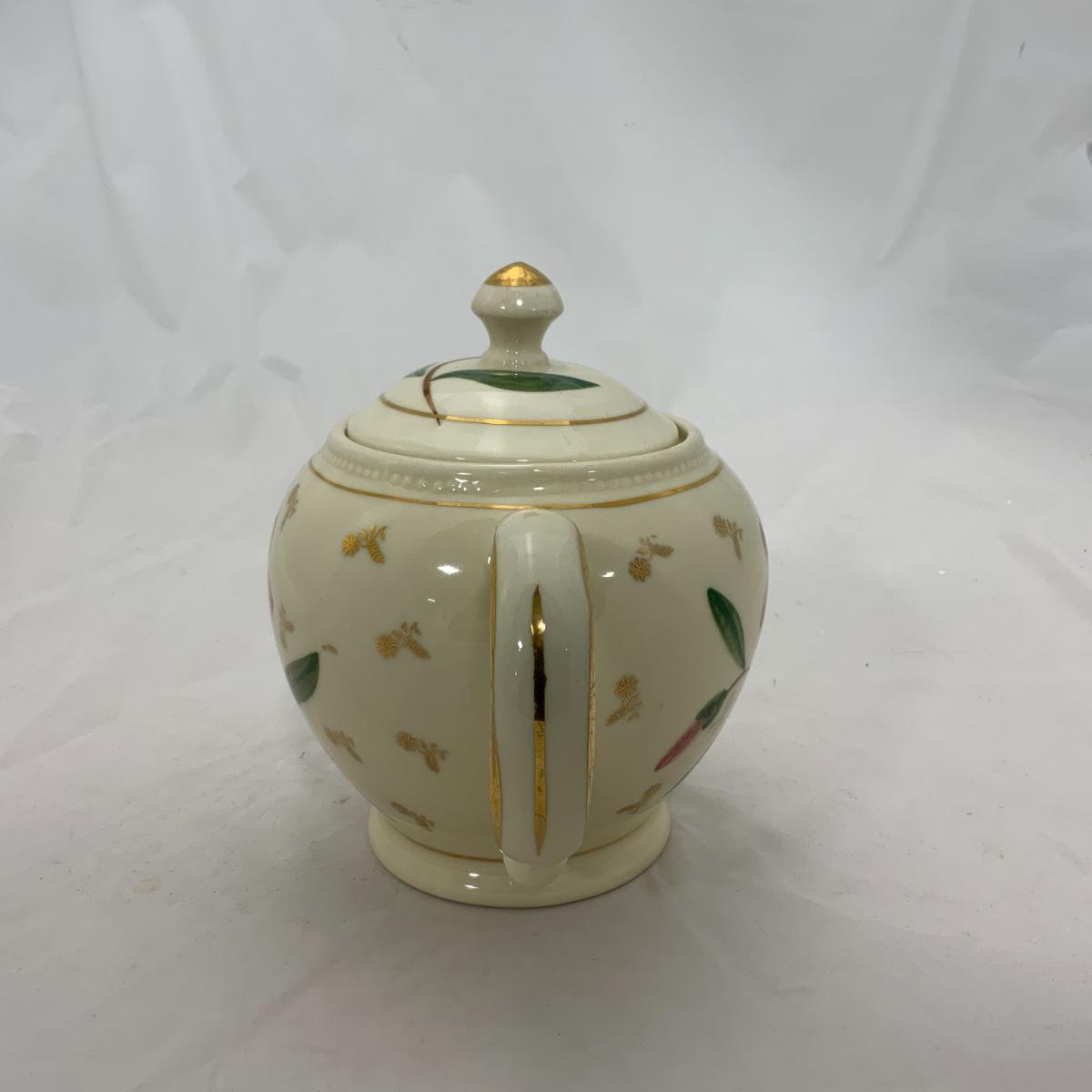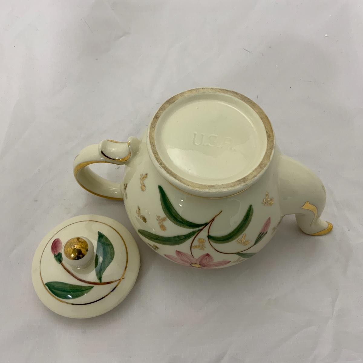 From the Estate of Peter and Alice Radovanovich: Beautiful 1950s Shawnee Tea Pot. This piece features an attractive flower on either side and has gold accents throughout. In nice vintage condition. Please see photos for details and condition. ::: Shipping is available on this lot. If you require shipping you must let us know at the close of the auction. We will coordinate with you after the item has been won. Shipping fees will include insurance up to or exceeding the value of all items being mailed. If you have any questions regarding this lot please contact the auctioneer either via this website, by direct email or by phone. PICK UP TIMES and other important information can be found in the TERMS and DESCRIPTION of the auction. Please take a look for pertinent information. Thanks!