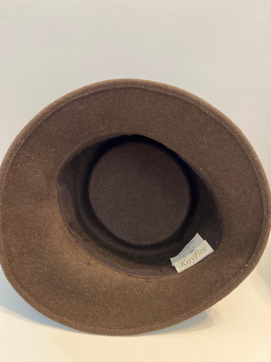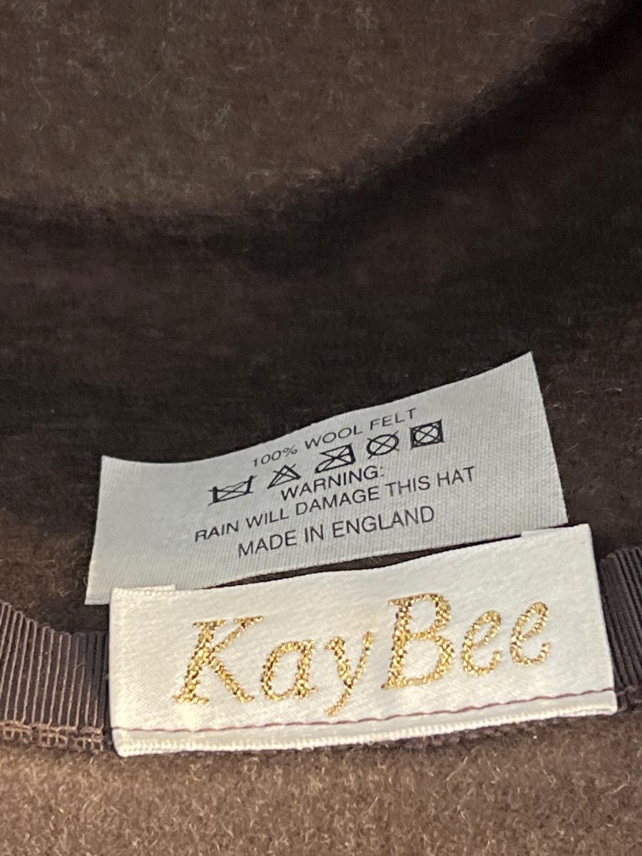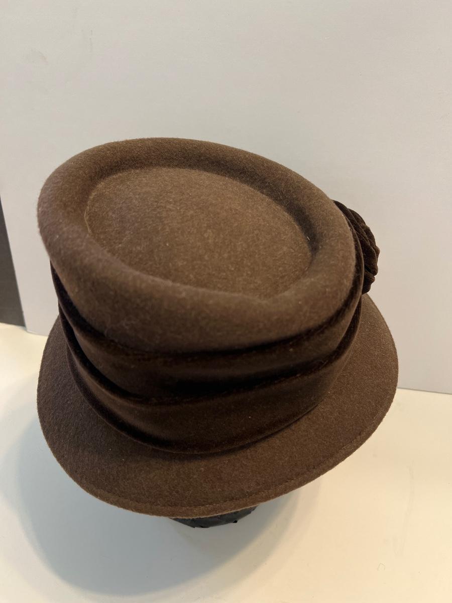 Dark brown hat made in England. 100% wool felt, velvet band and flower application, Faux feathers.