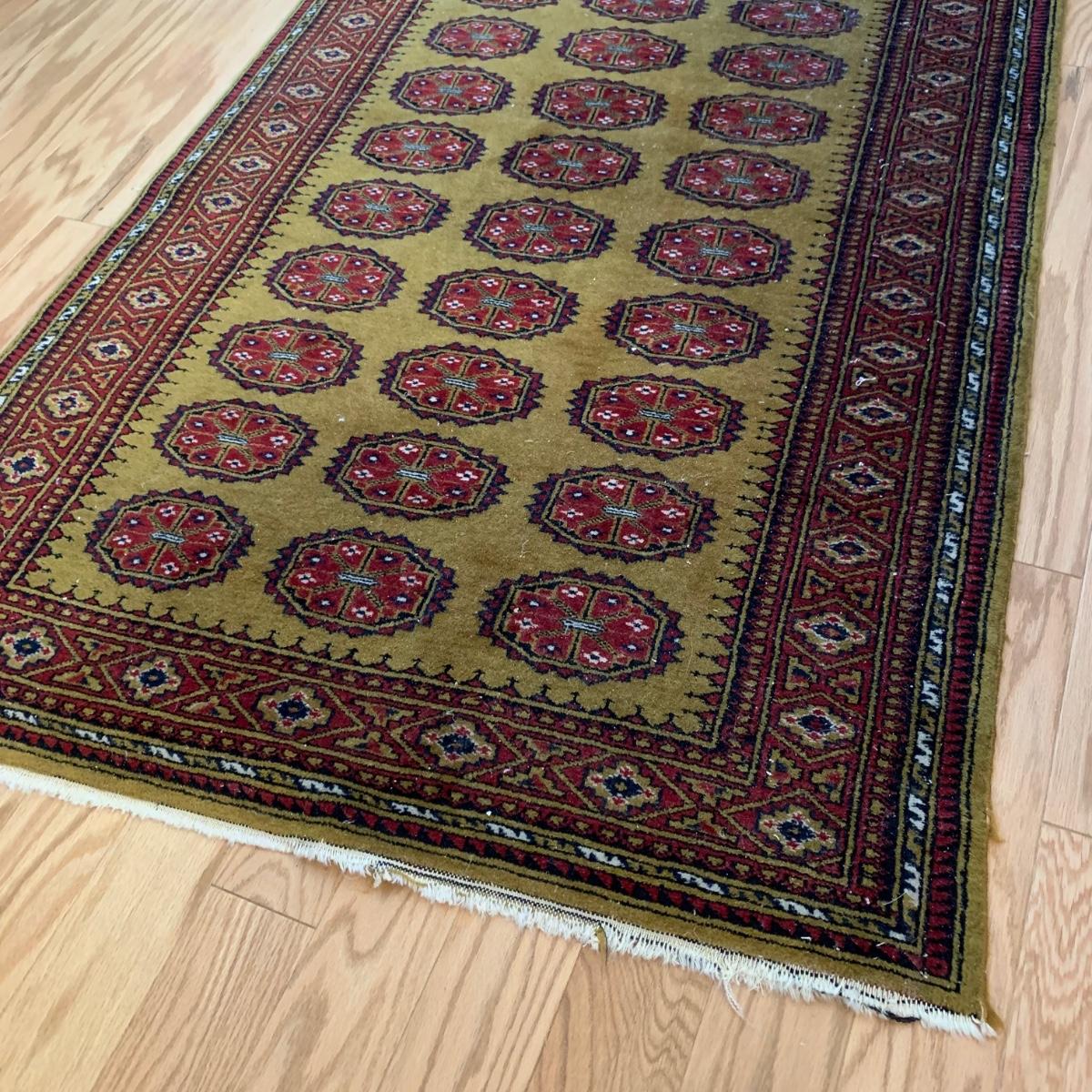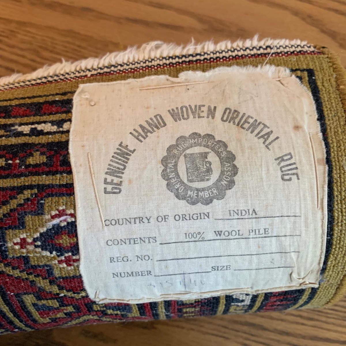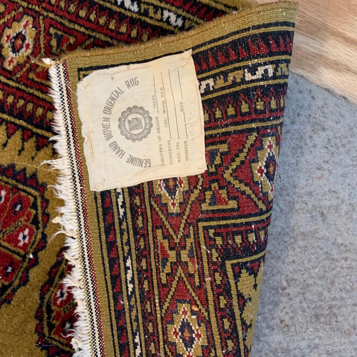 Lovely runner rug with olive green base color. Measures 3’ x 5’. Tag states that it is 100% wool and was handwoven in India. Rug pad NOT included.