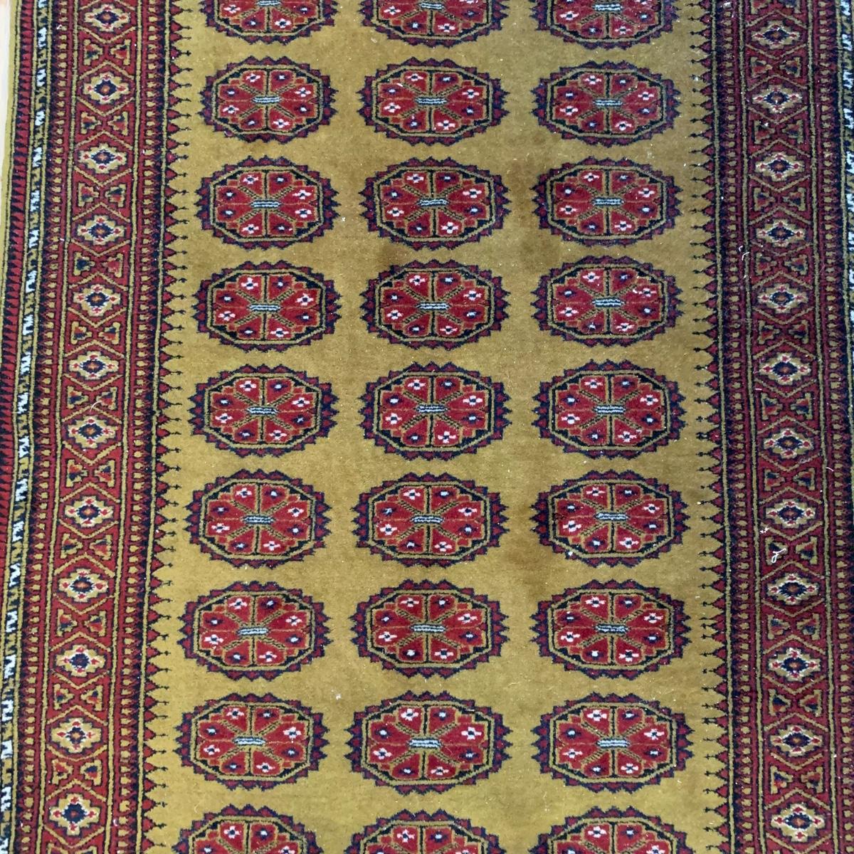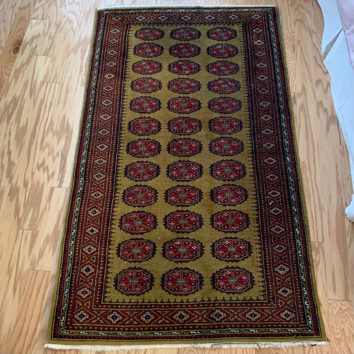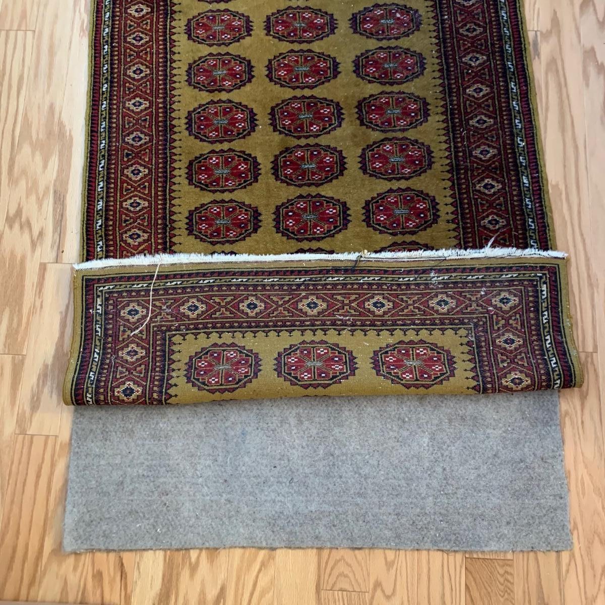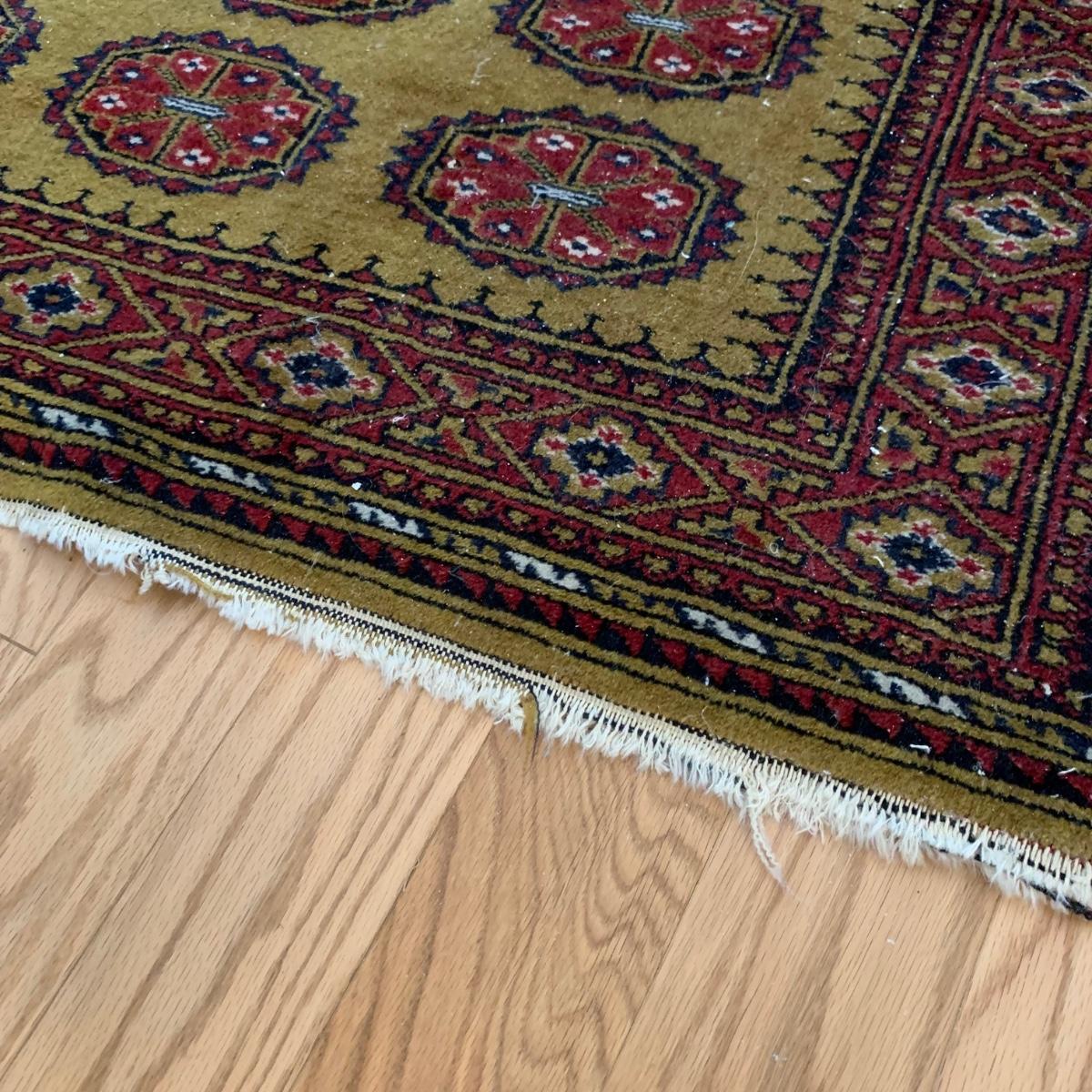 Lovely runner rug with olive green base color. Measures 3’ x 5’. Tag states that it is 100% wool and was handwoven in India. Rug pad NOT included.