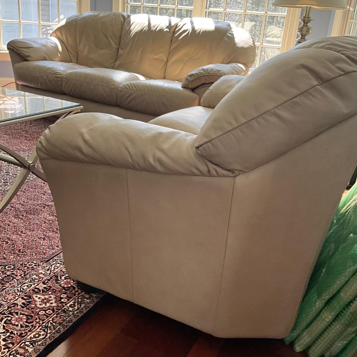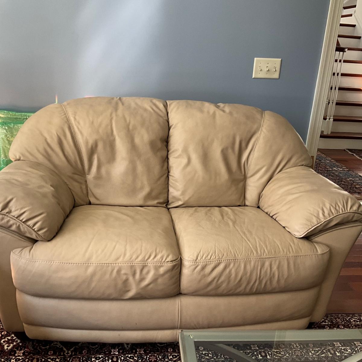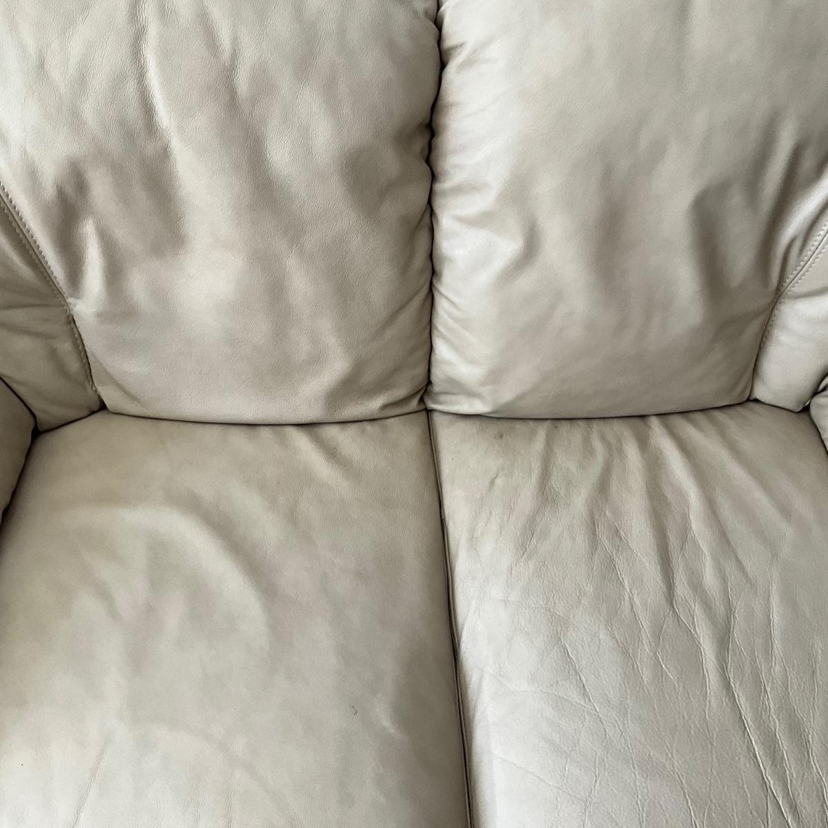 Off white leather loveseat, measuring 5' wide x 3' high x 3' deep x 20" seat height x 21" seat depth
