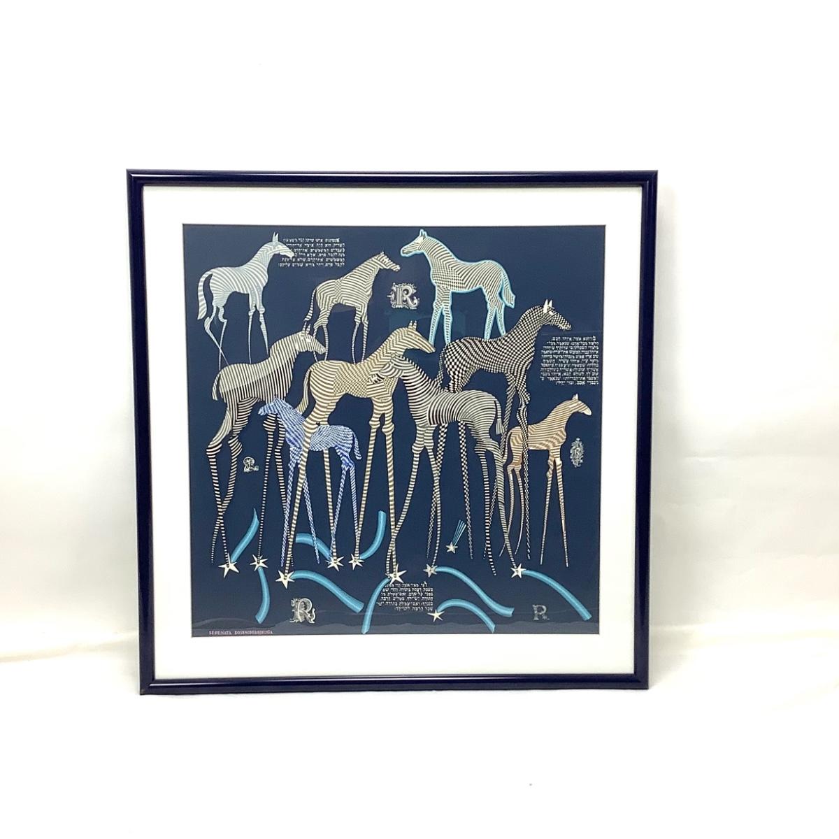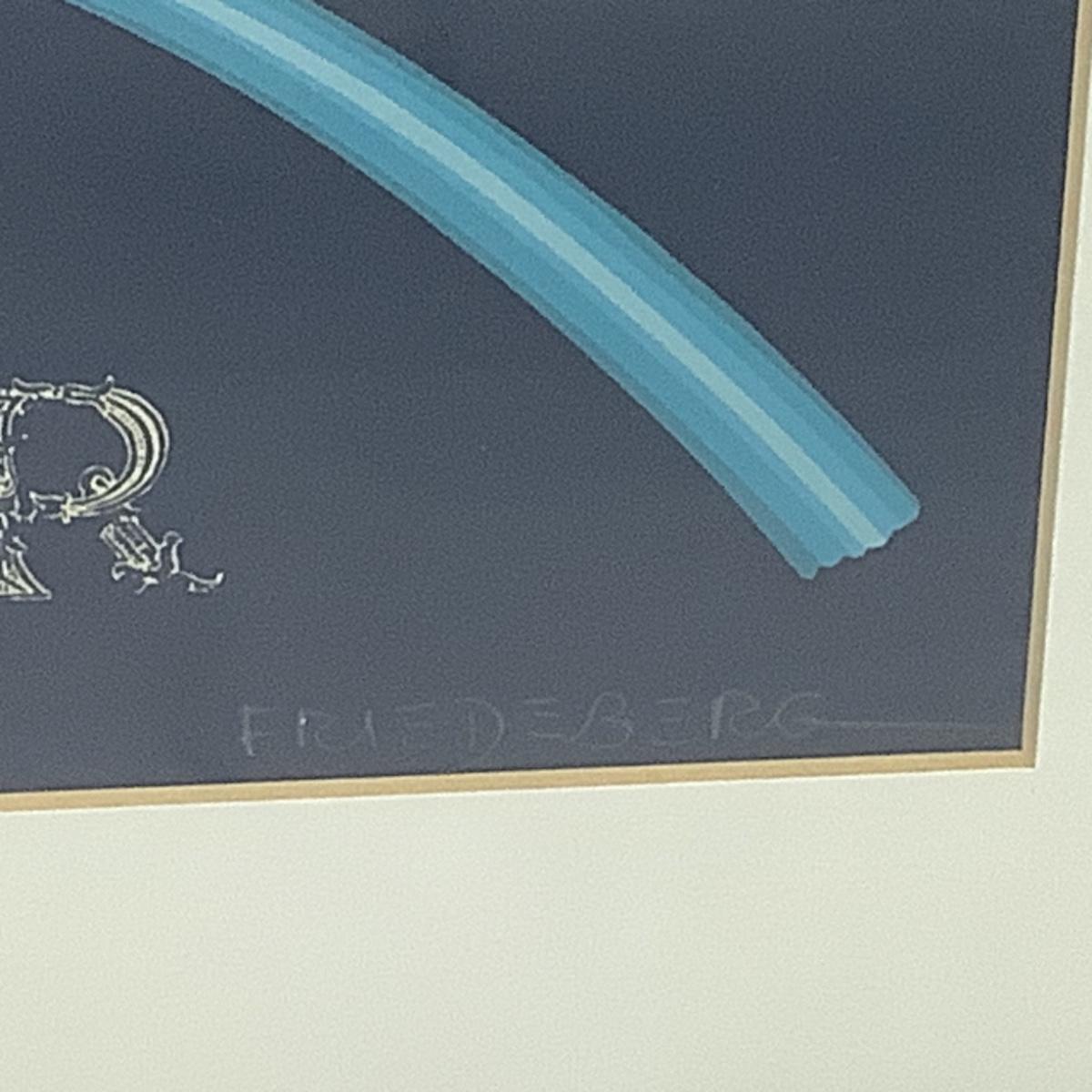 The signed serigraph measures 29" x 29" and is in a navy blue metal frame. The artist Pedro Friedeberg was born in 1936, he is a Mexican artist and designer know for his surrealist work filled with lines, colors and ancient religious symbols. He is most know for his creation of the "Hand Chair" where you sit in the palm of the hand.