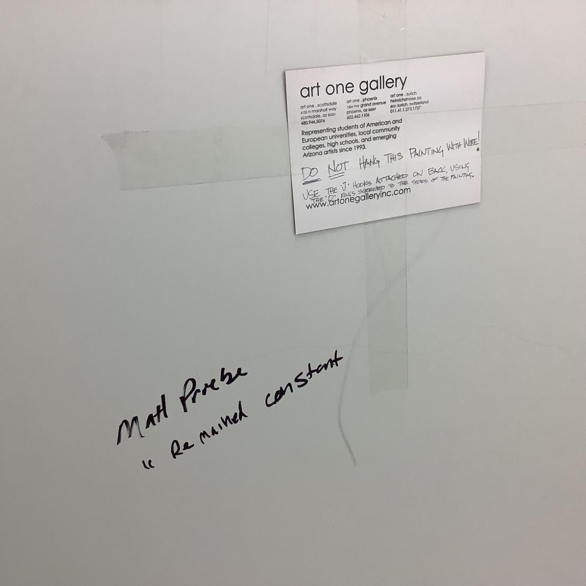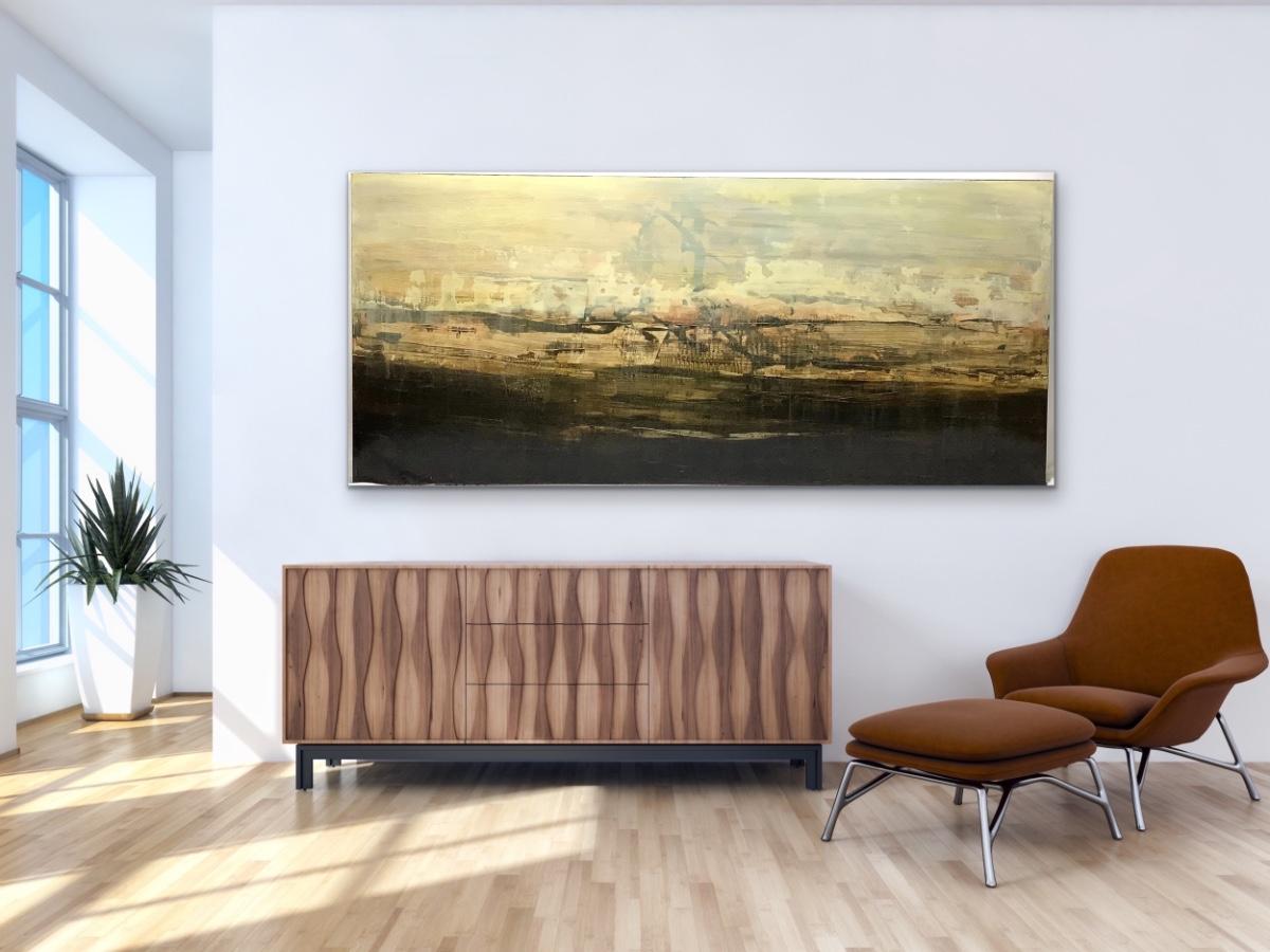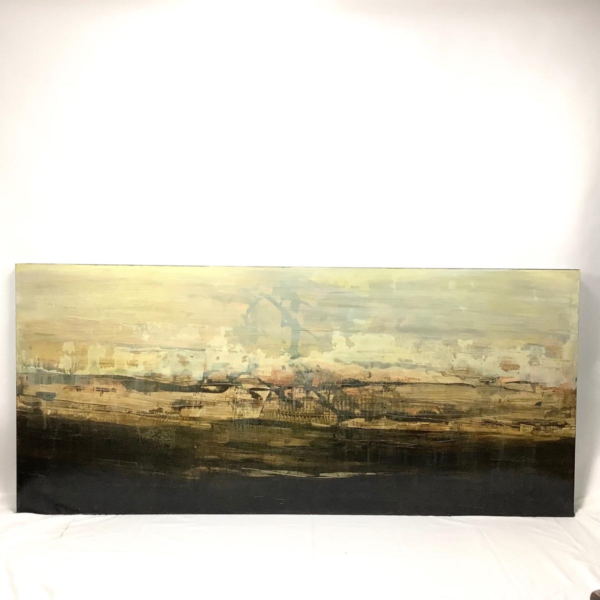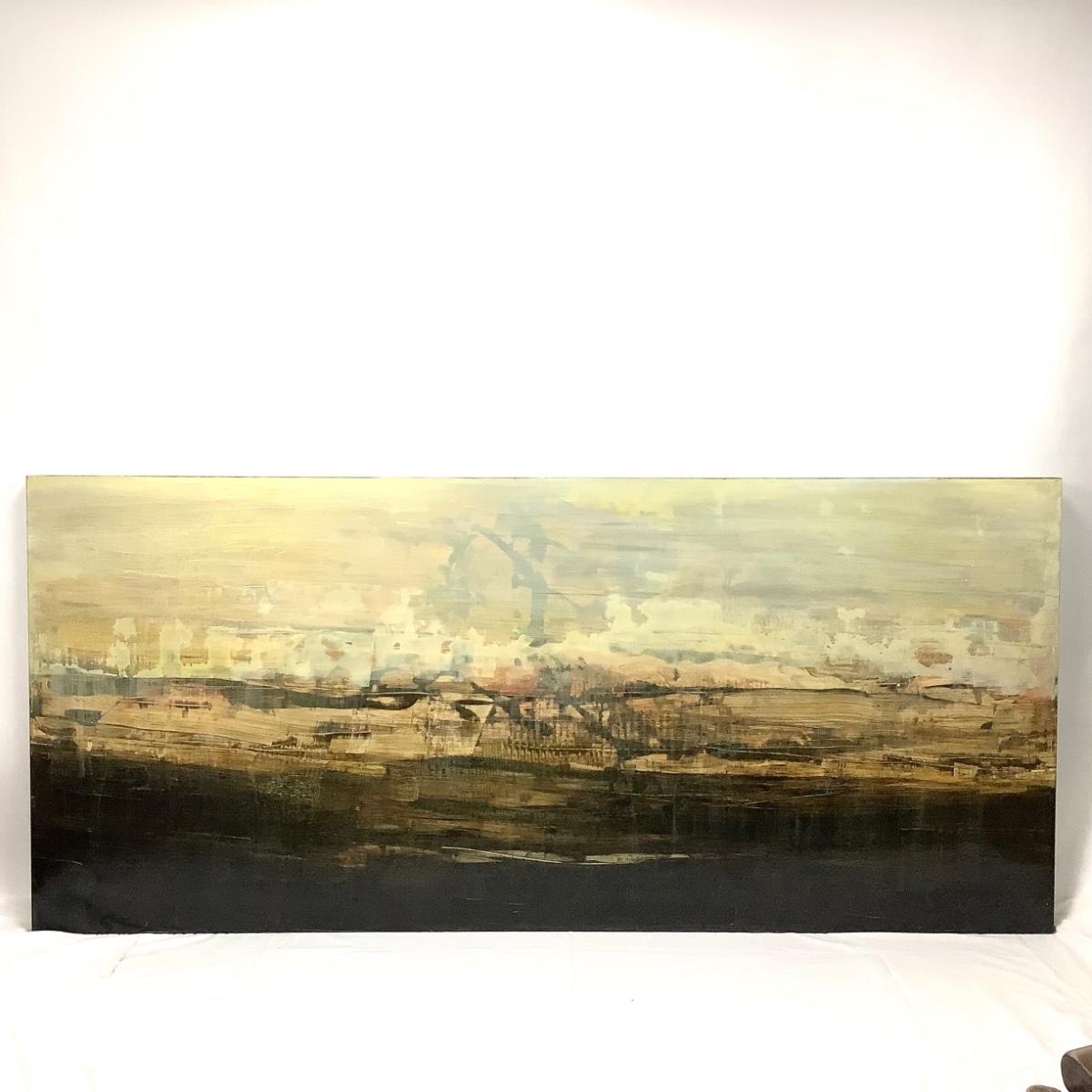 The oil painting is on a large panel of wood that measures 80" wide x 35.5" high. It is titled "Remained Constant" by artist Matt Priebe. He is a photographic emulsion painter, video installation and electronic sculpture. Priebe excels at blending an aura of timelessness with sincerity that doesn't seem forced. This is a LARGE statement art piece on wood.