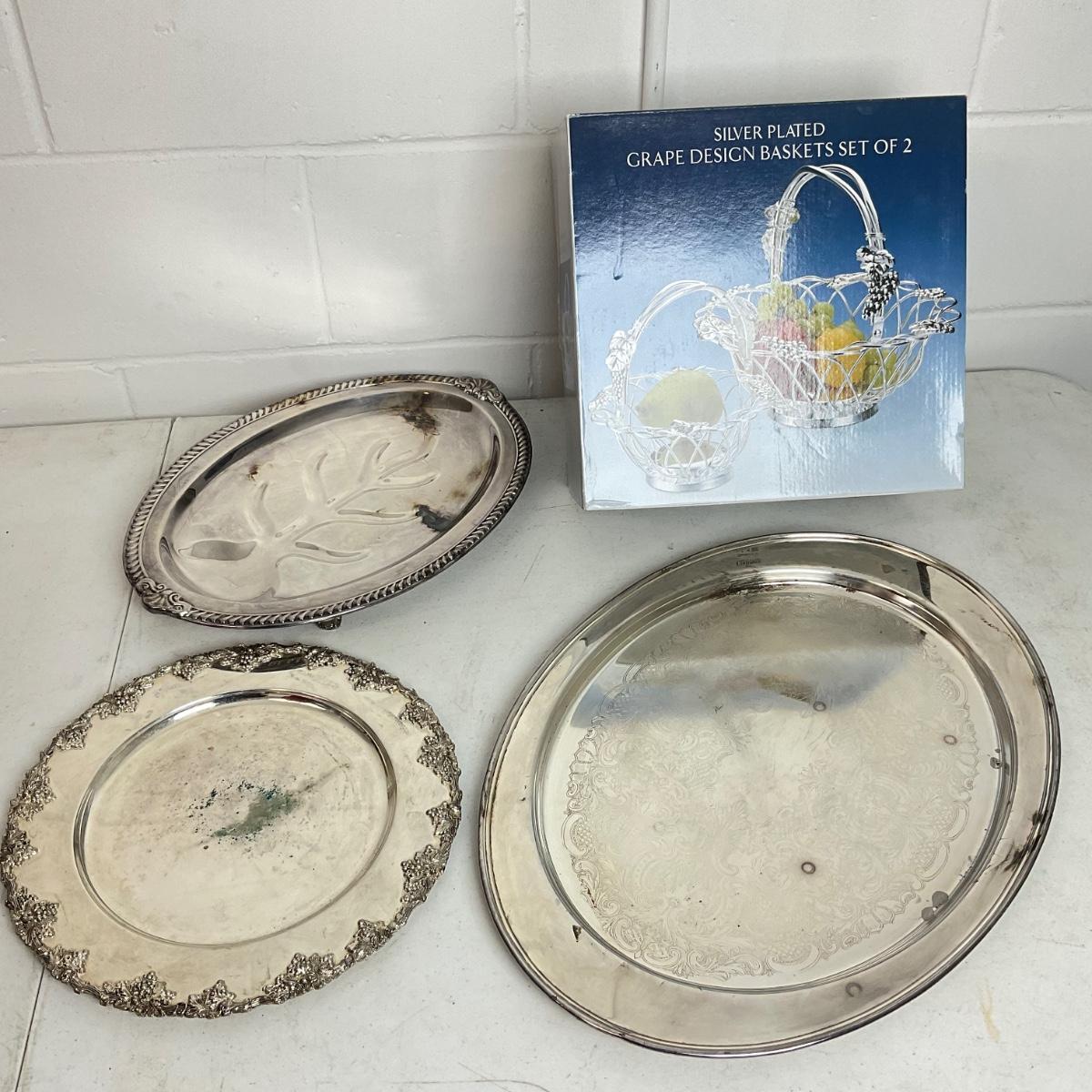 1004 Silver plated Grape Design Basket and Serving Trays