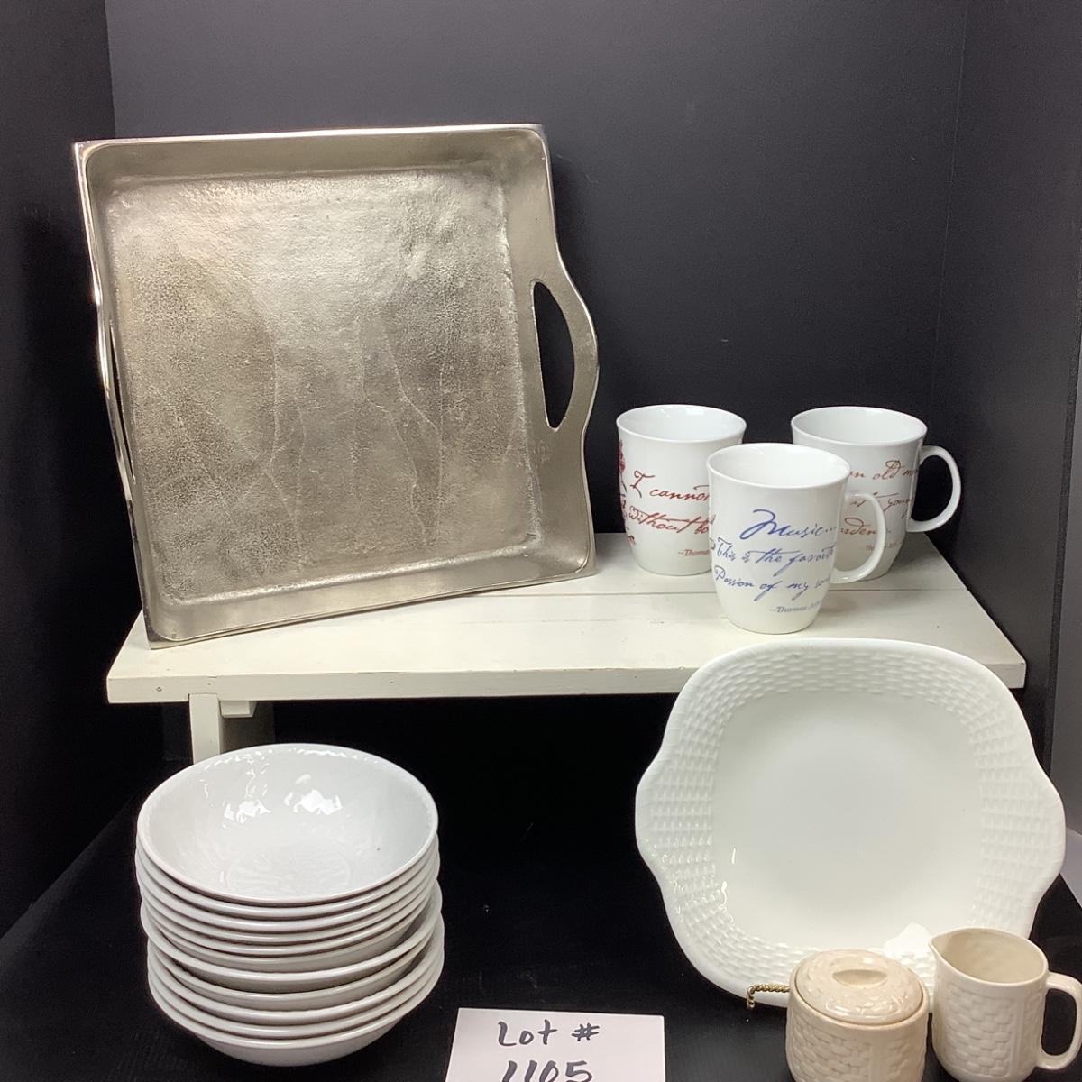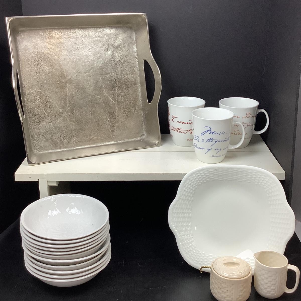 Silver decorative handled plate by Wedgwood in Nantucket Pattern, Three Monticello Mugs, Cream and Sugar dish in a basket weave pattern